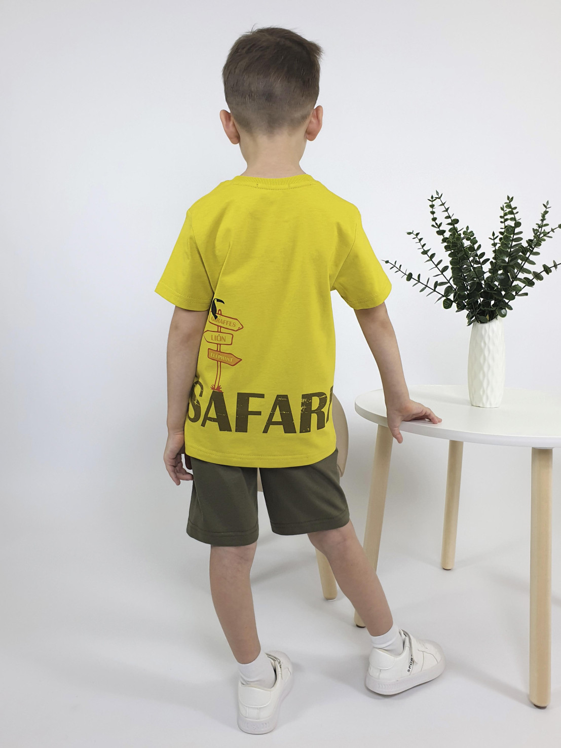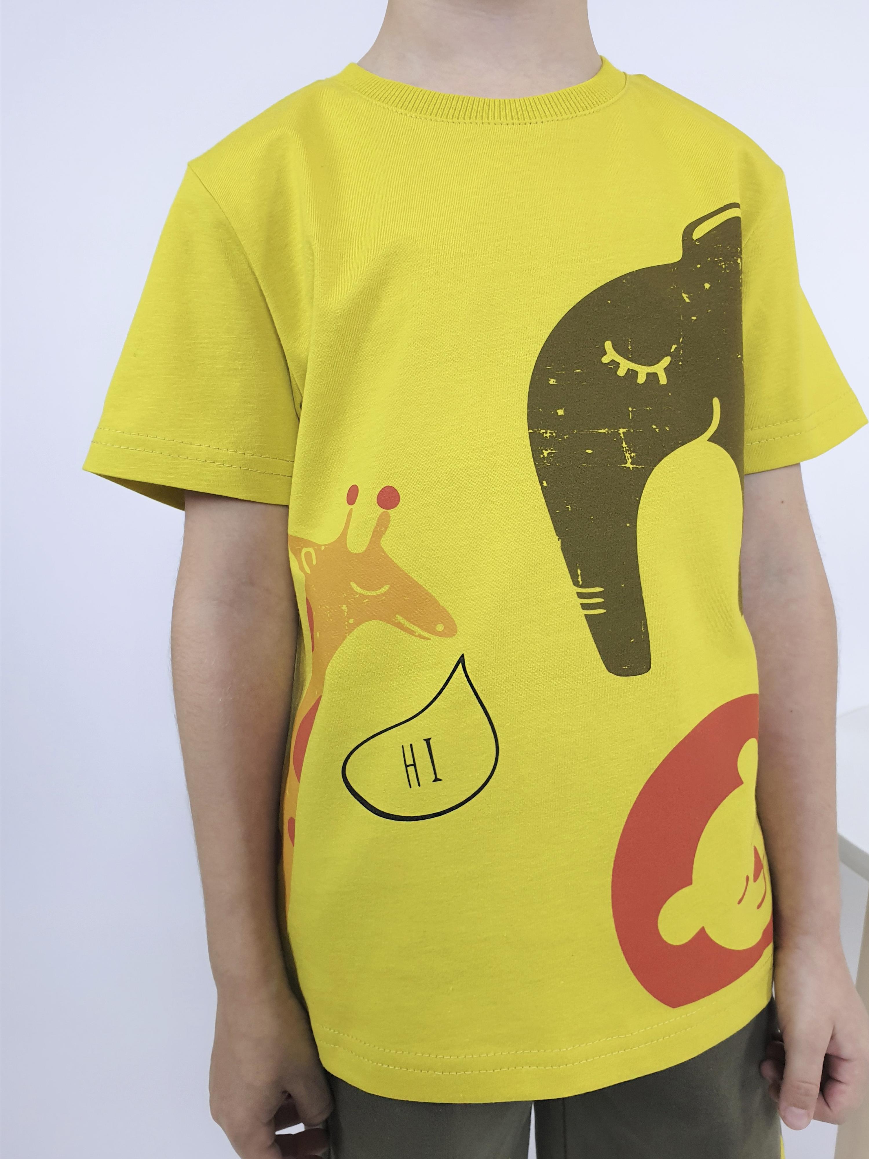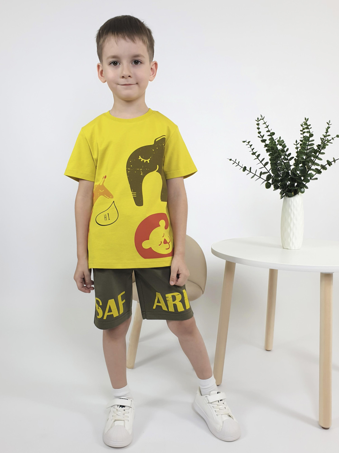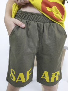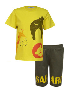 Кулирное полотно: 100% х/б. Фуфайка-прямая,перед и спинка с печатью.Рукав втачной,короткий.Горловина обработана ластиком. Шорты-укороченные с притачным поясом и резинкой.Два боковых кармана.Печать внизу,по переду.