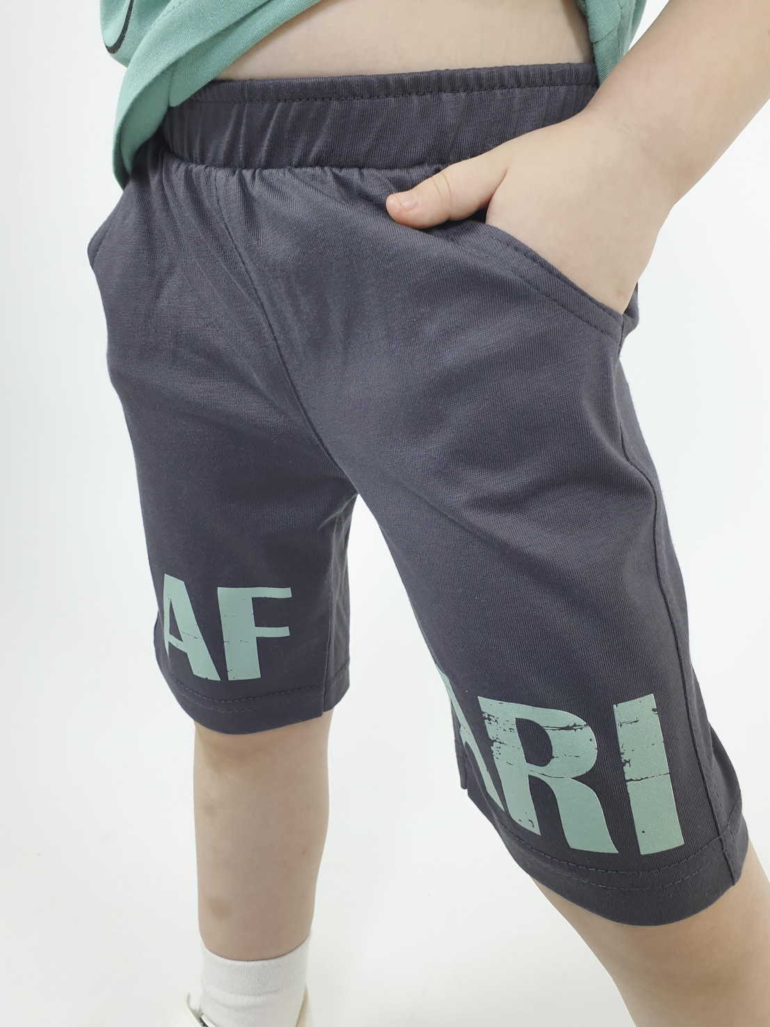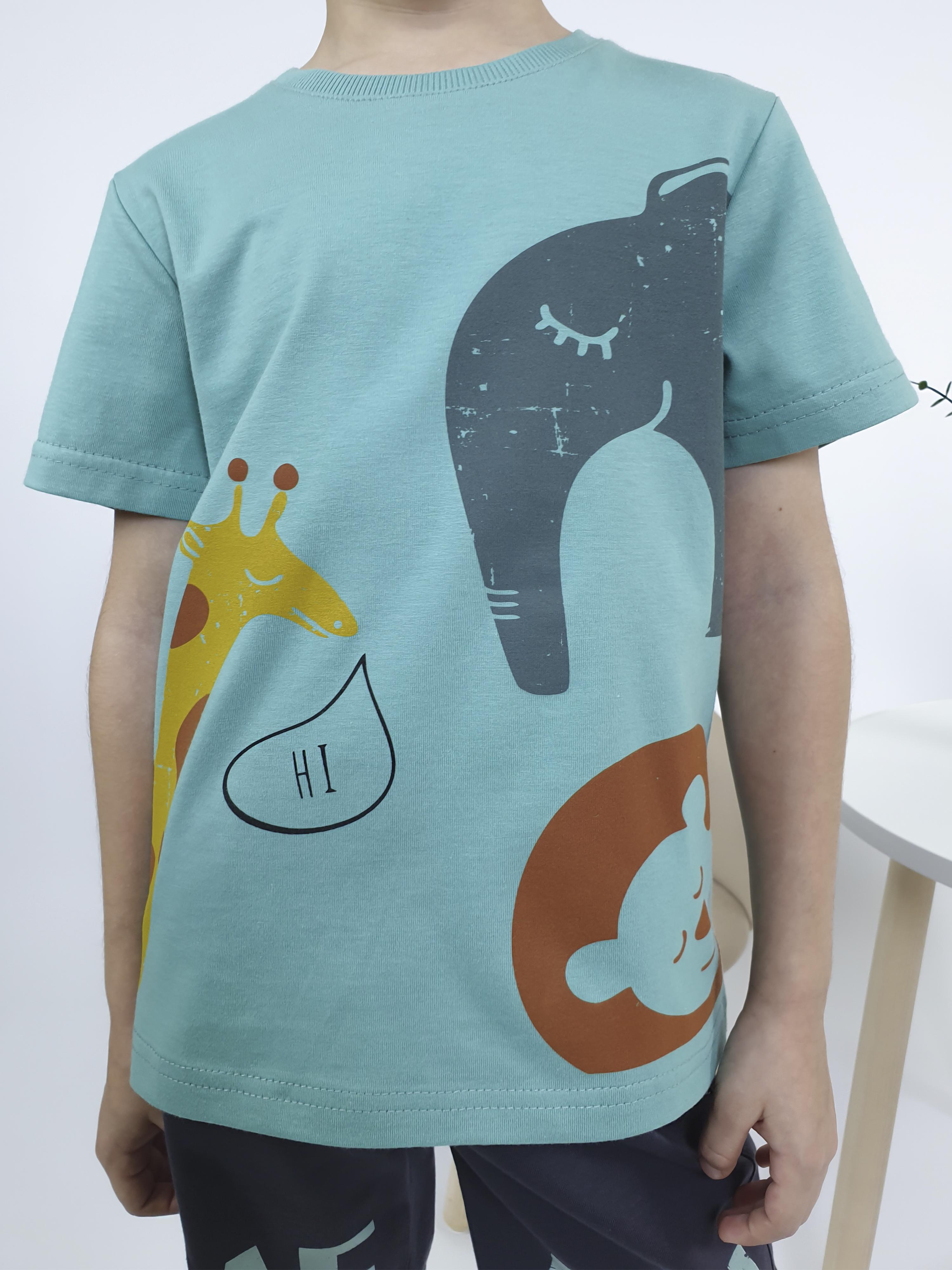 Кулирное полотно: 100% х/б. Фуфайка-прямая,перед и спинка с печатью.Рукав втачной,короткий.Горловина обработана ластиком. Шорты-укороченные с притачным поясом и резинкой.Два боковых кармана.Печать внизу,по переду.