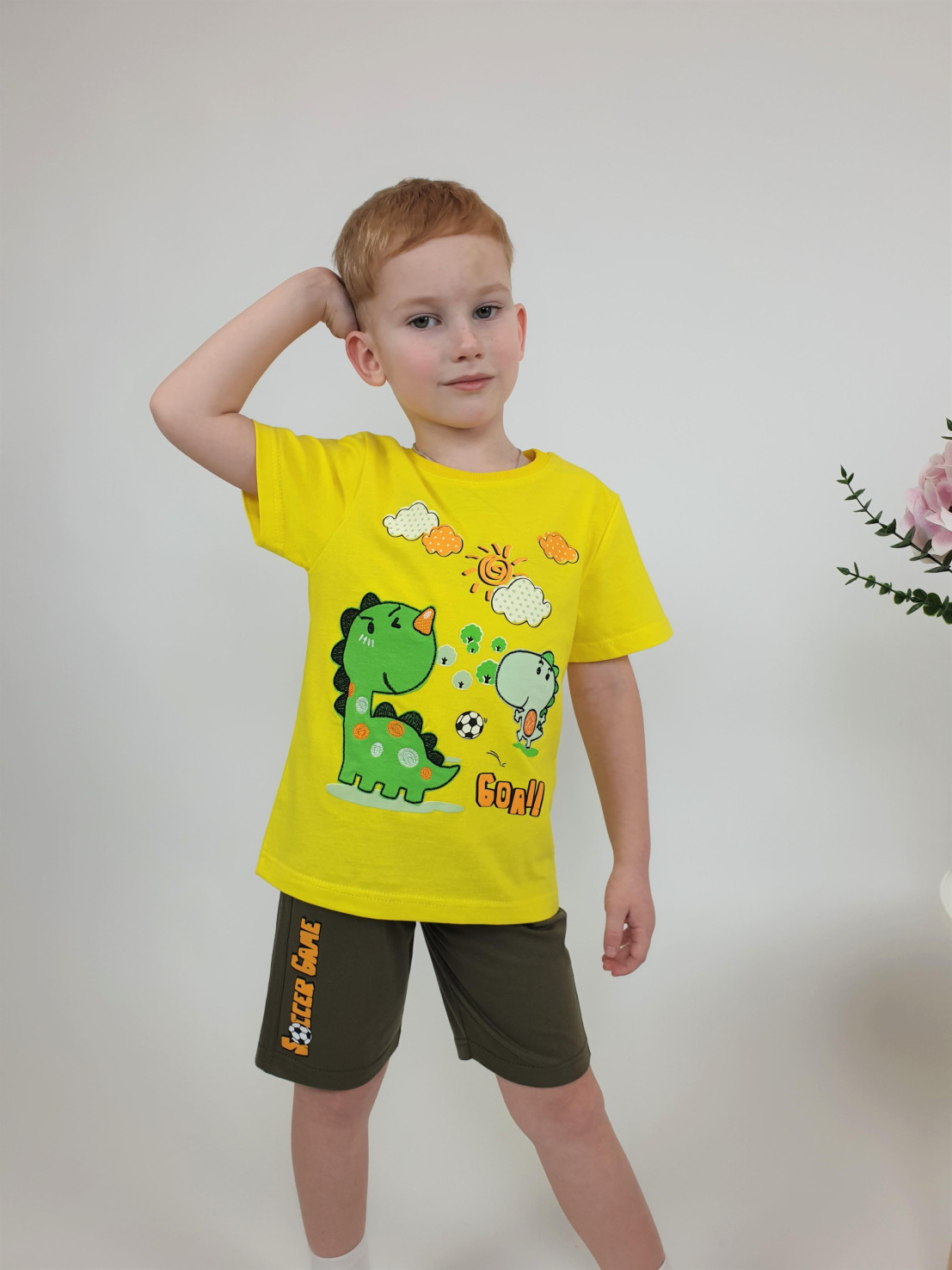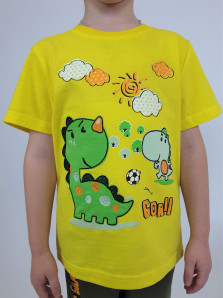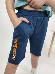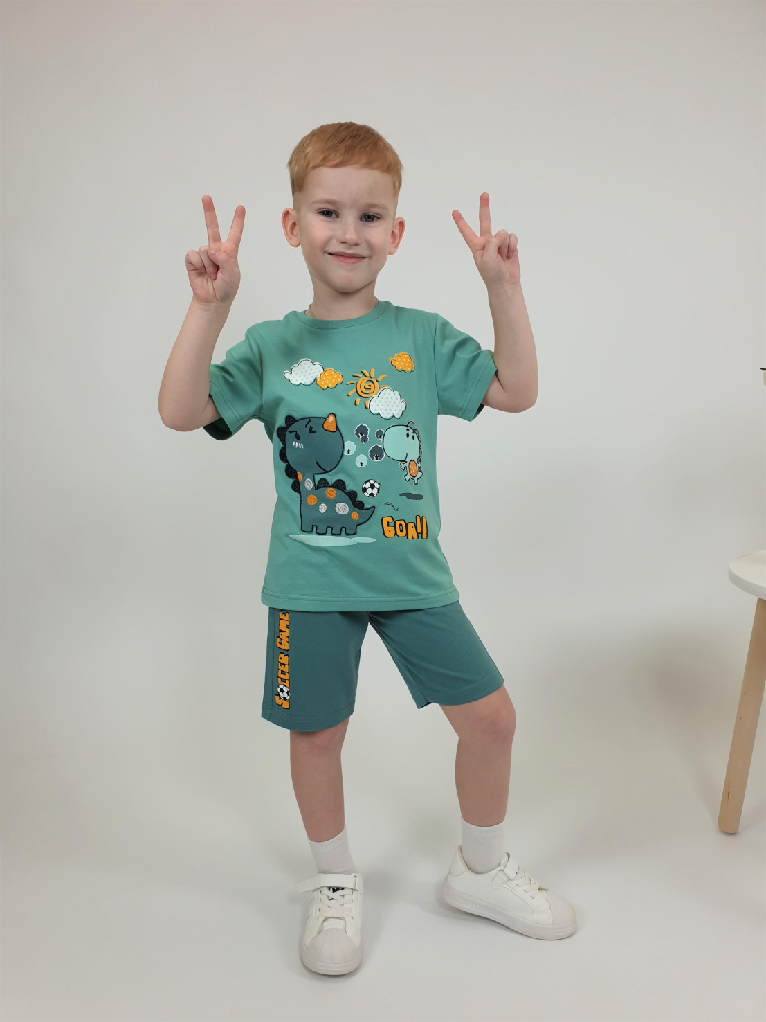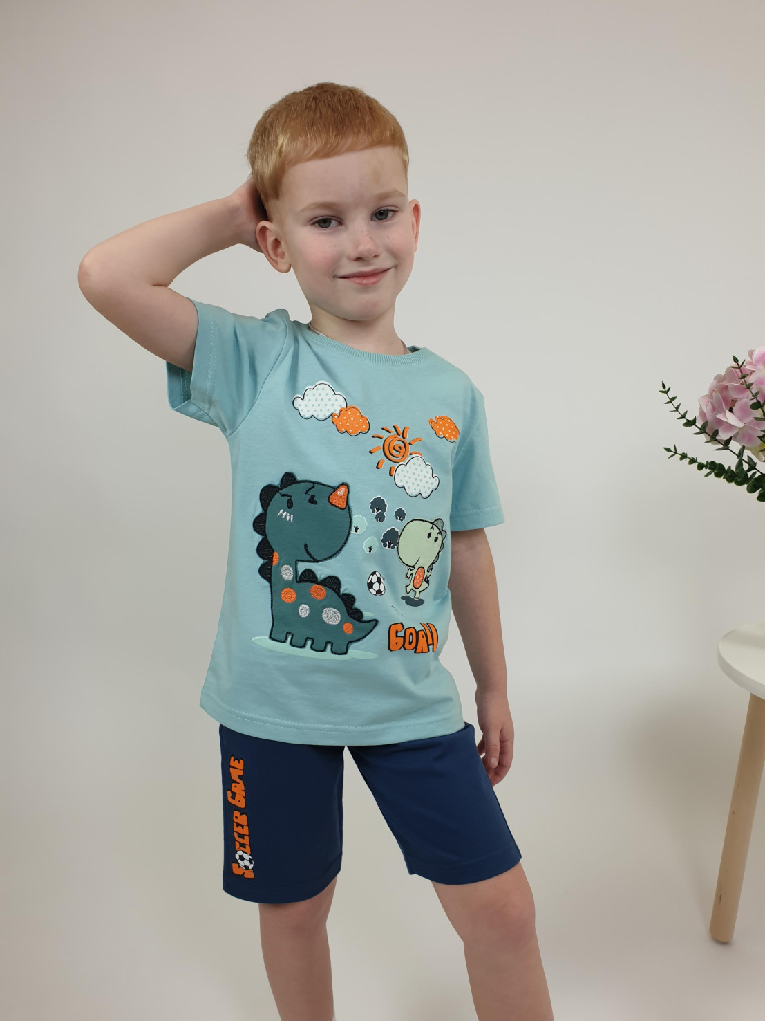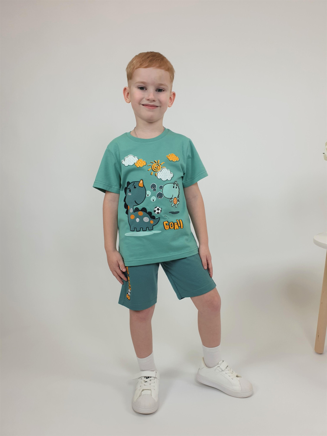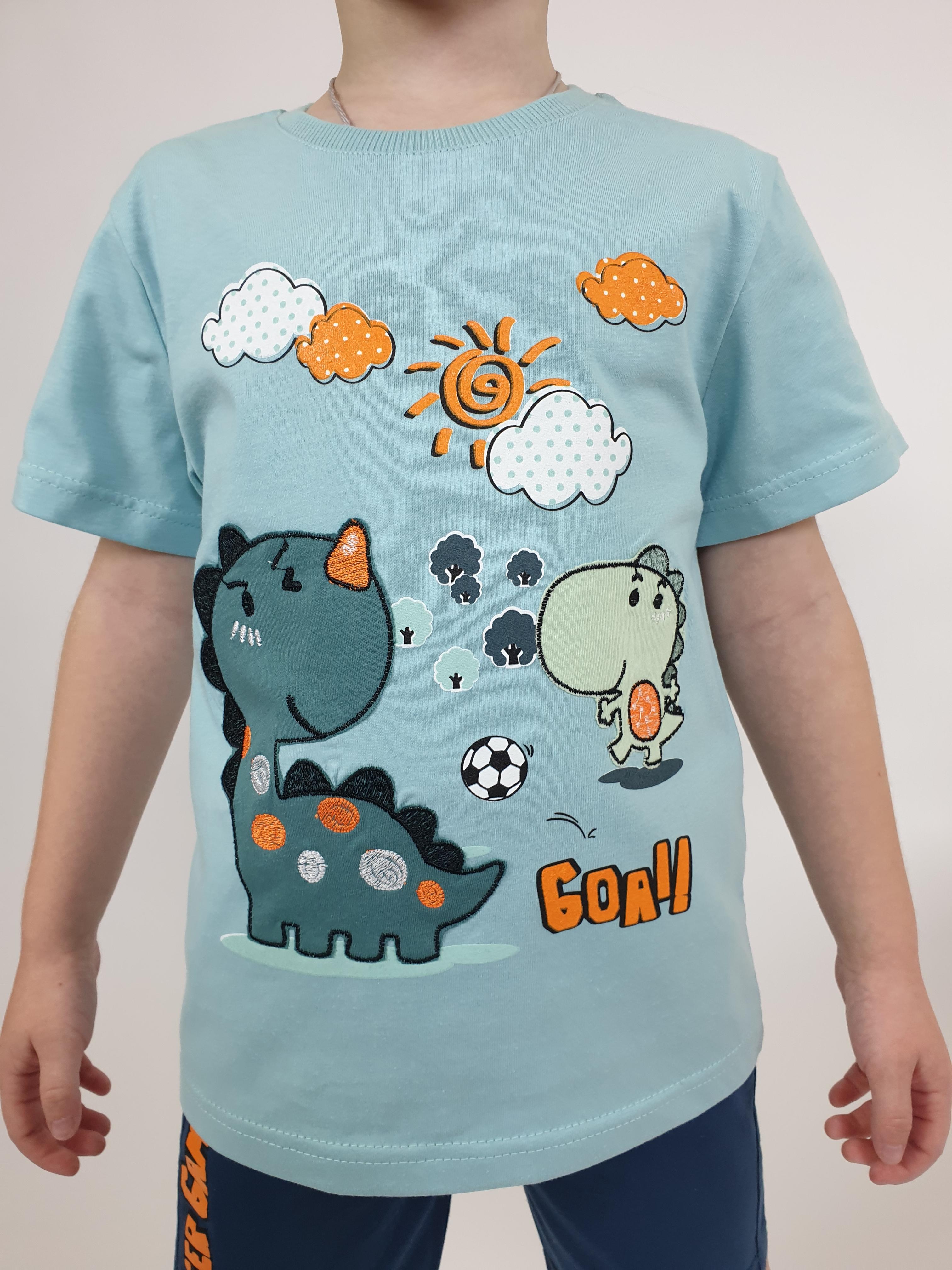 Кулирное полотно: 100% х/б. Фуфайка-прямая,перед с печатью и вышивкой.Рукав втачной,короткий.Горловина обработана ластиком. Шорты-укороченные с притачным поясом и резинкой.Два боковых кармана.Печать на передней правой половинке.