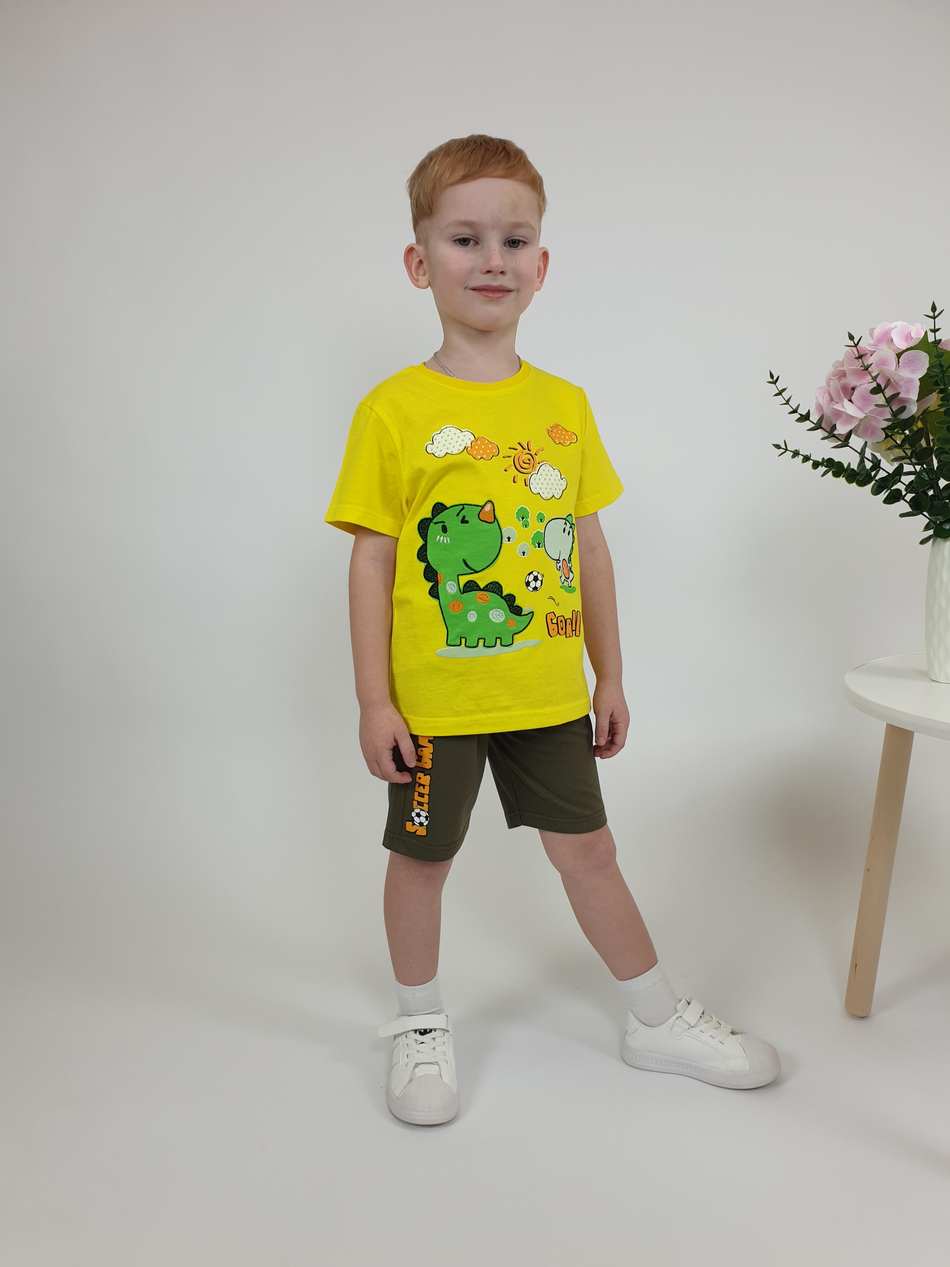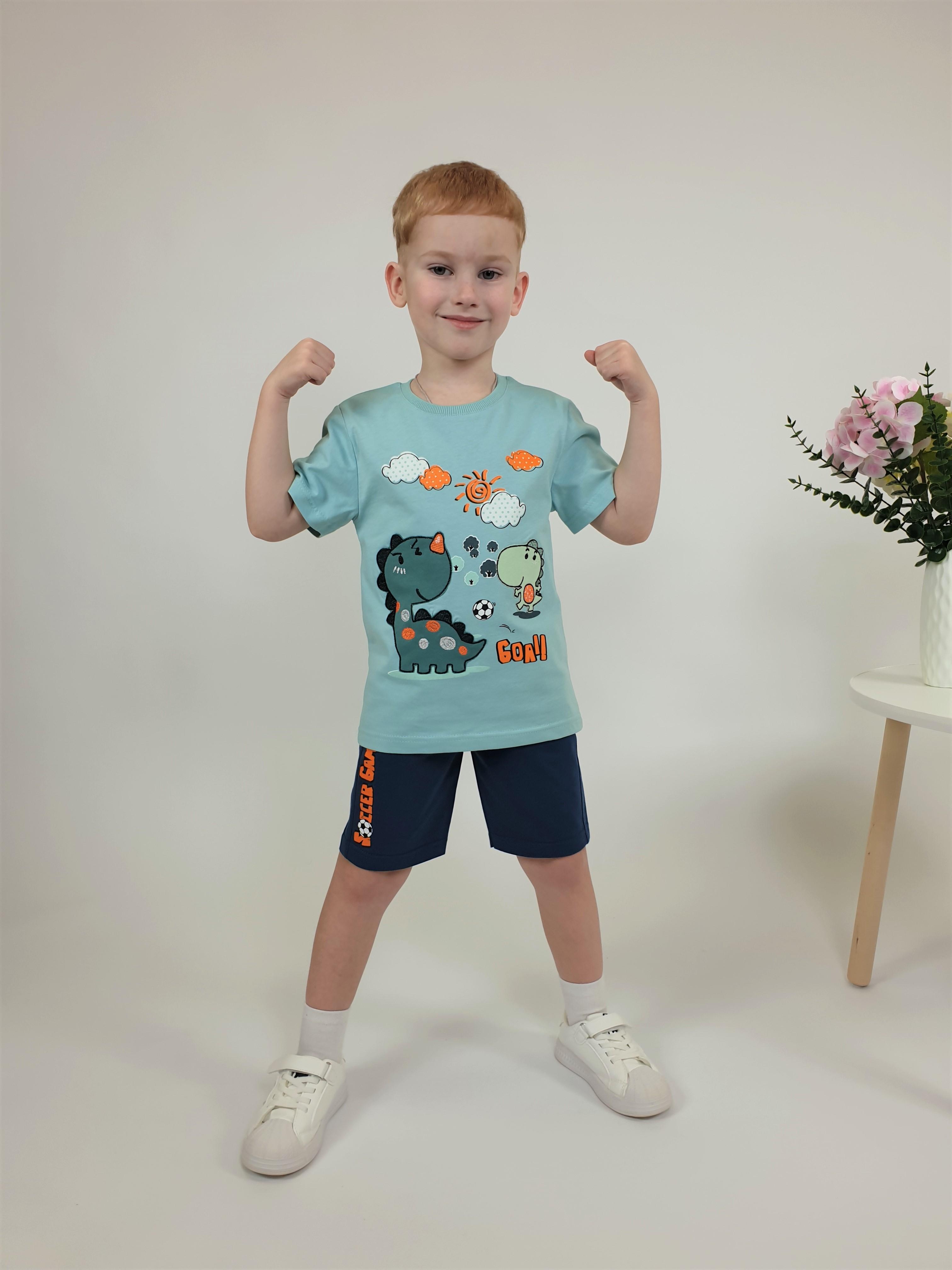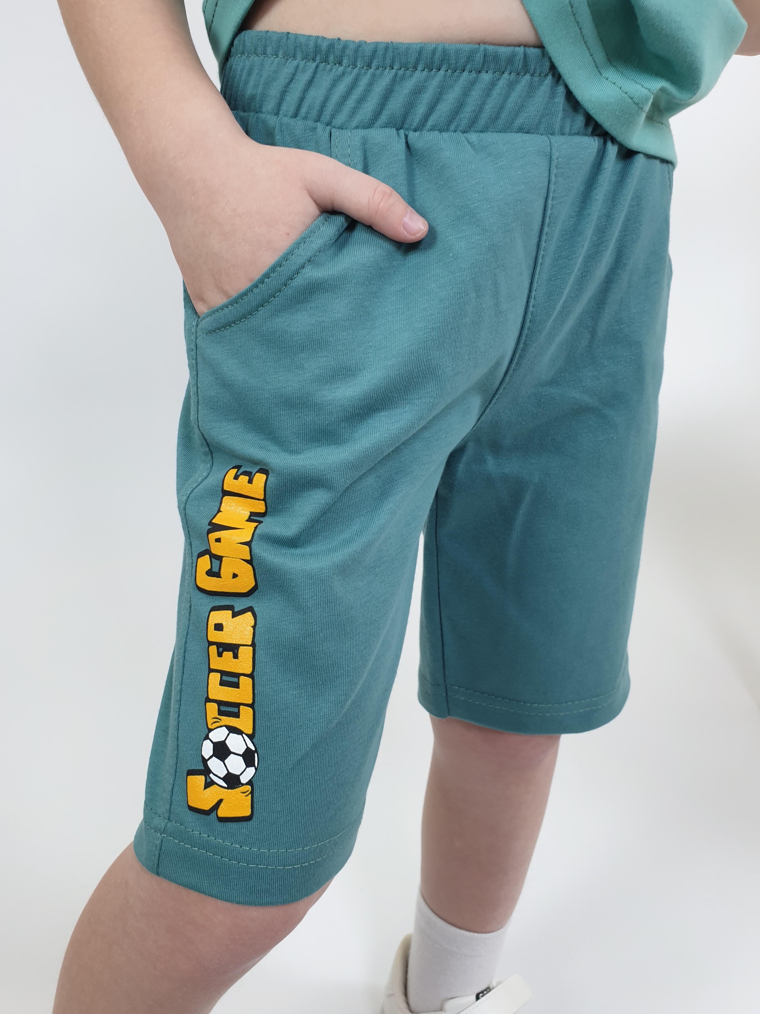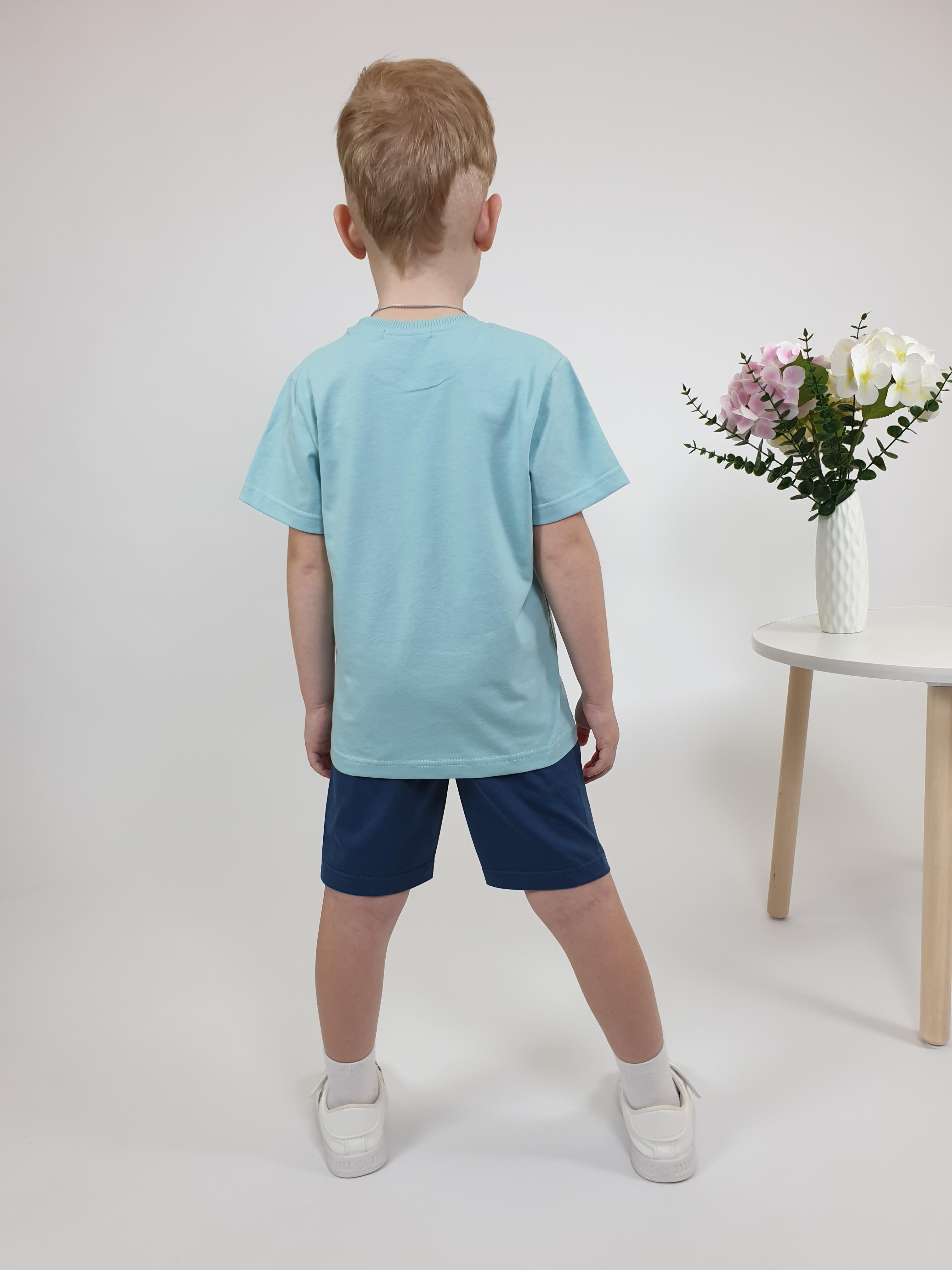 Кулирное полотно: 100% х/б. Фуфайка-прямая,перед с печатью и вышивкой.Рукав втачной,короткий.Горловина обработана ластиком. Шорты-укороченные с притачным поясом и резинкой.Два боковых кармана.Печать на передней правой половинке.
