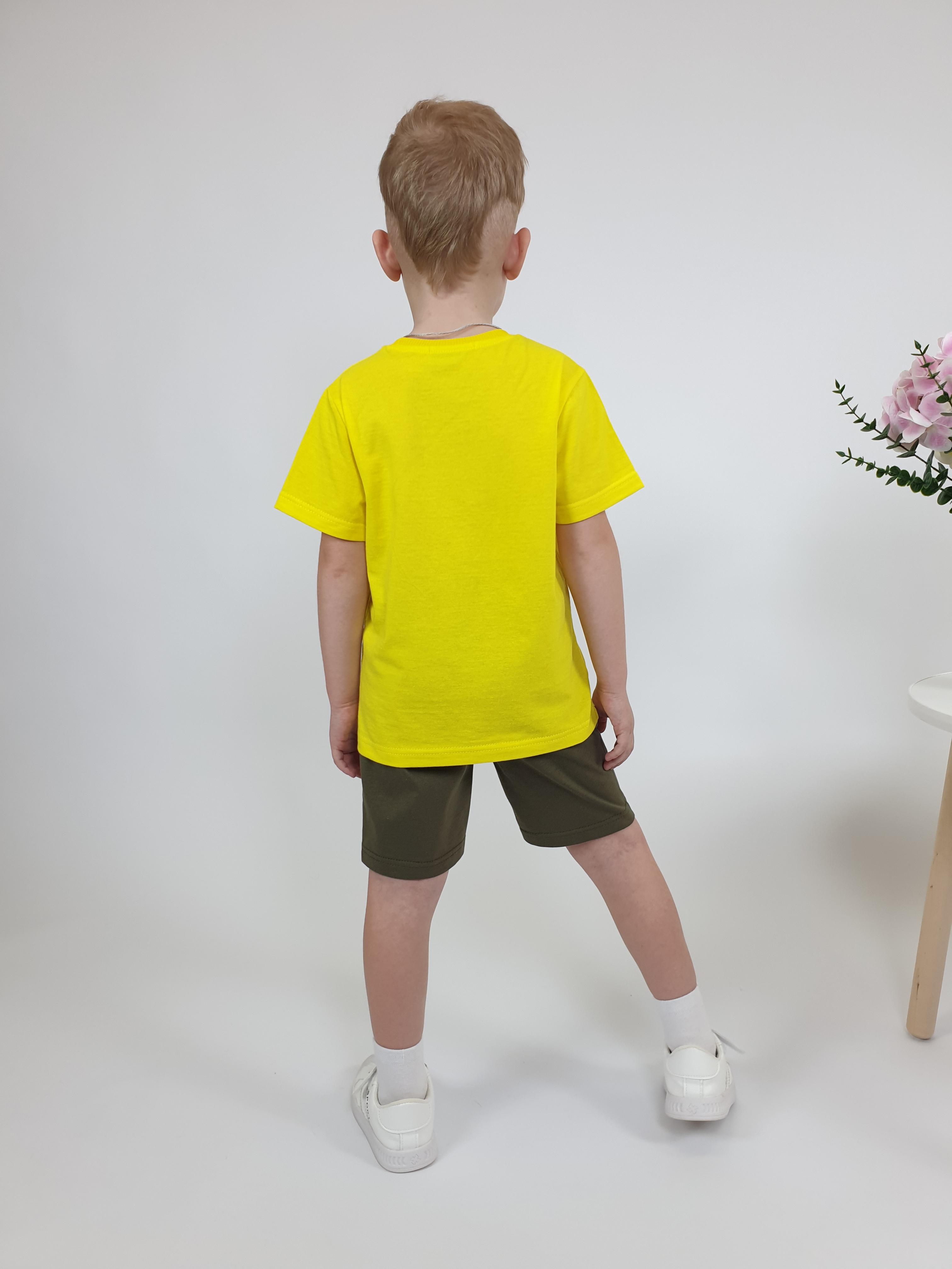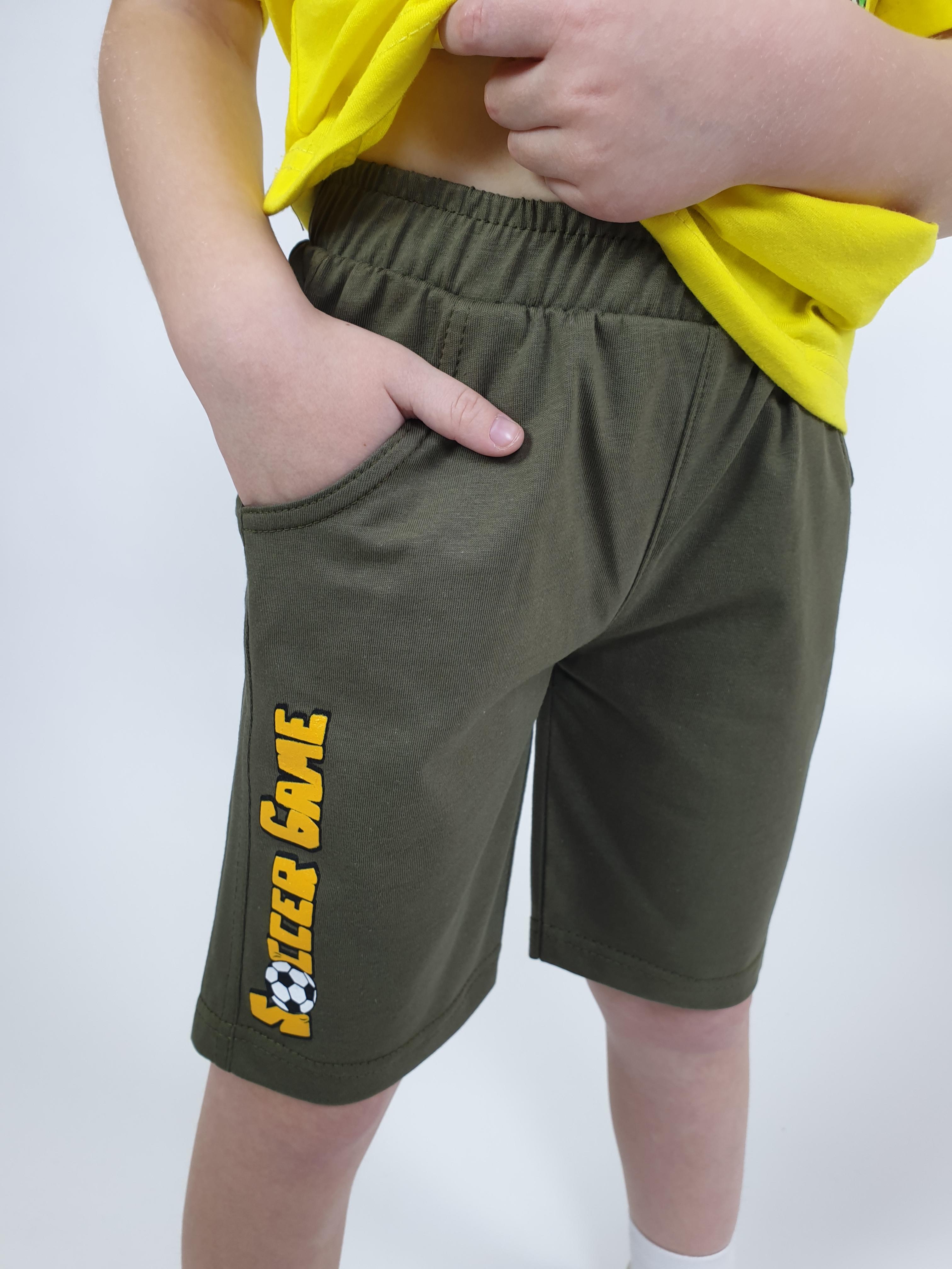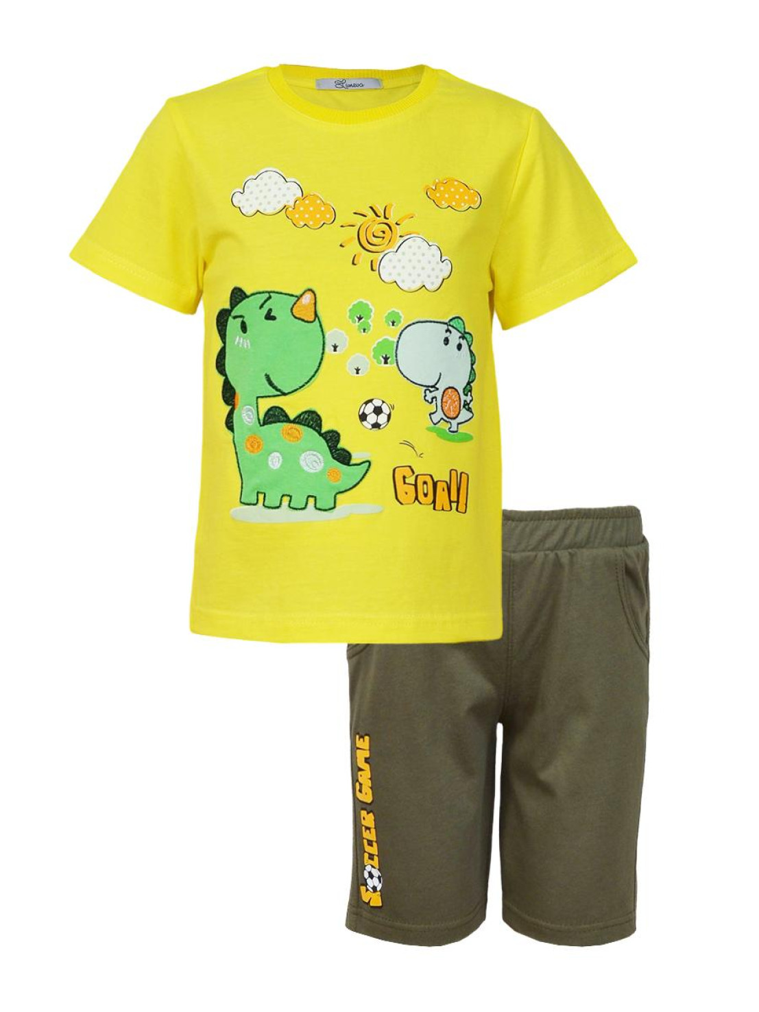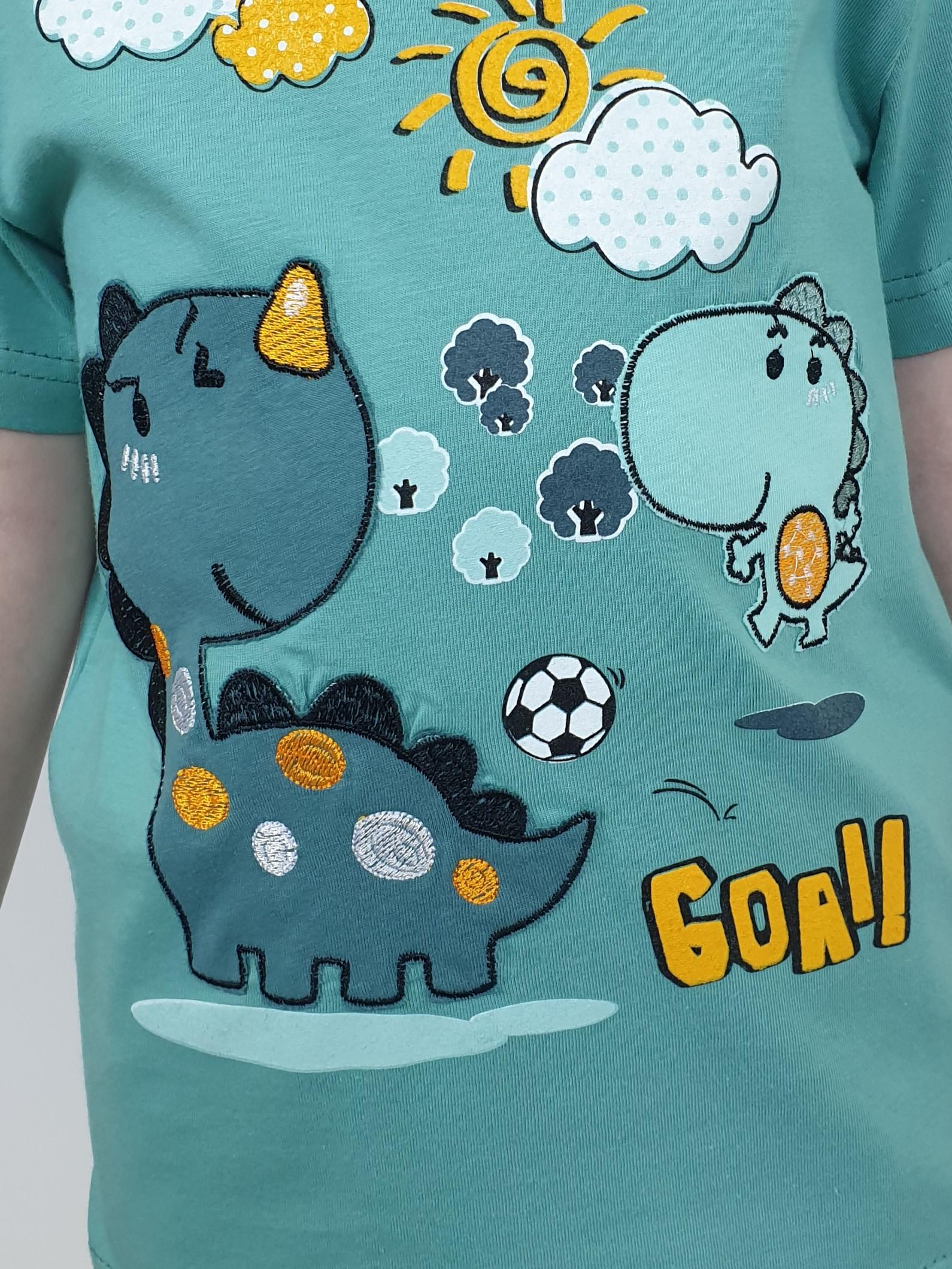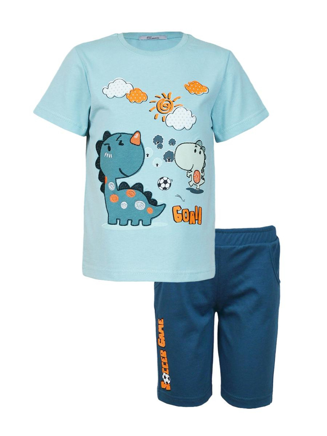 Кулирное полотно: 100% х/б. Фуфайка-прямая,перед с печатью и вышивкой.Рукав втачной,короткий.Горловина обработана ластиком. Шорты-укороченные с притачным поясом и резинкой.Два боковых кармана.Печать на передней правой половинке.