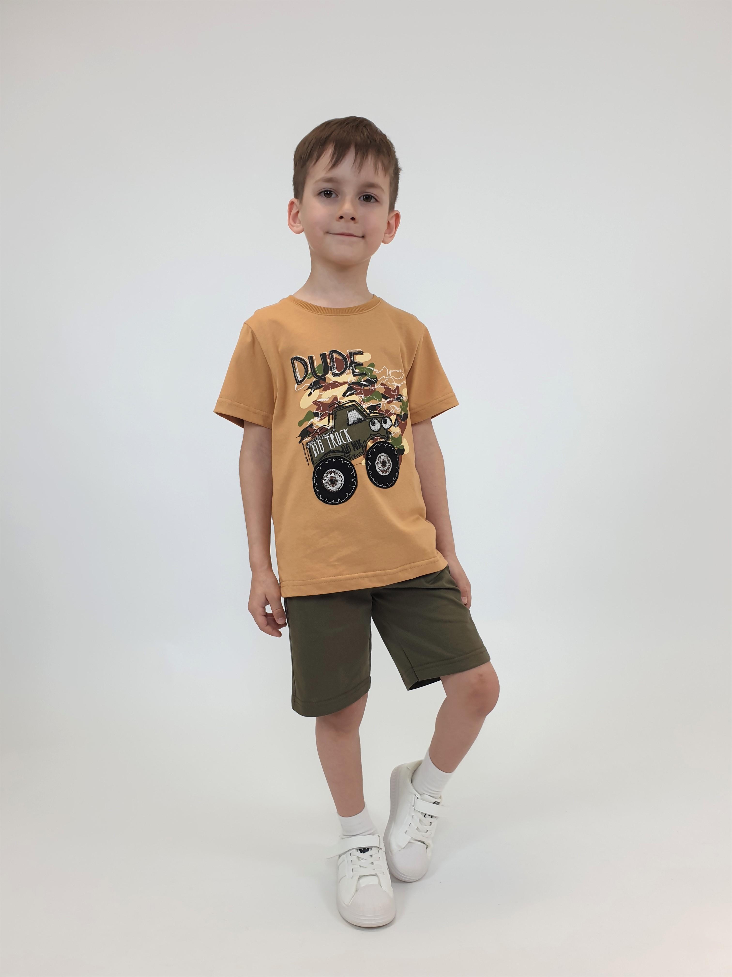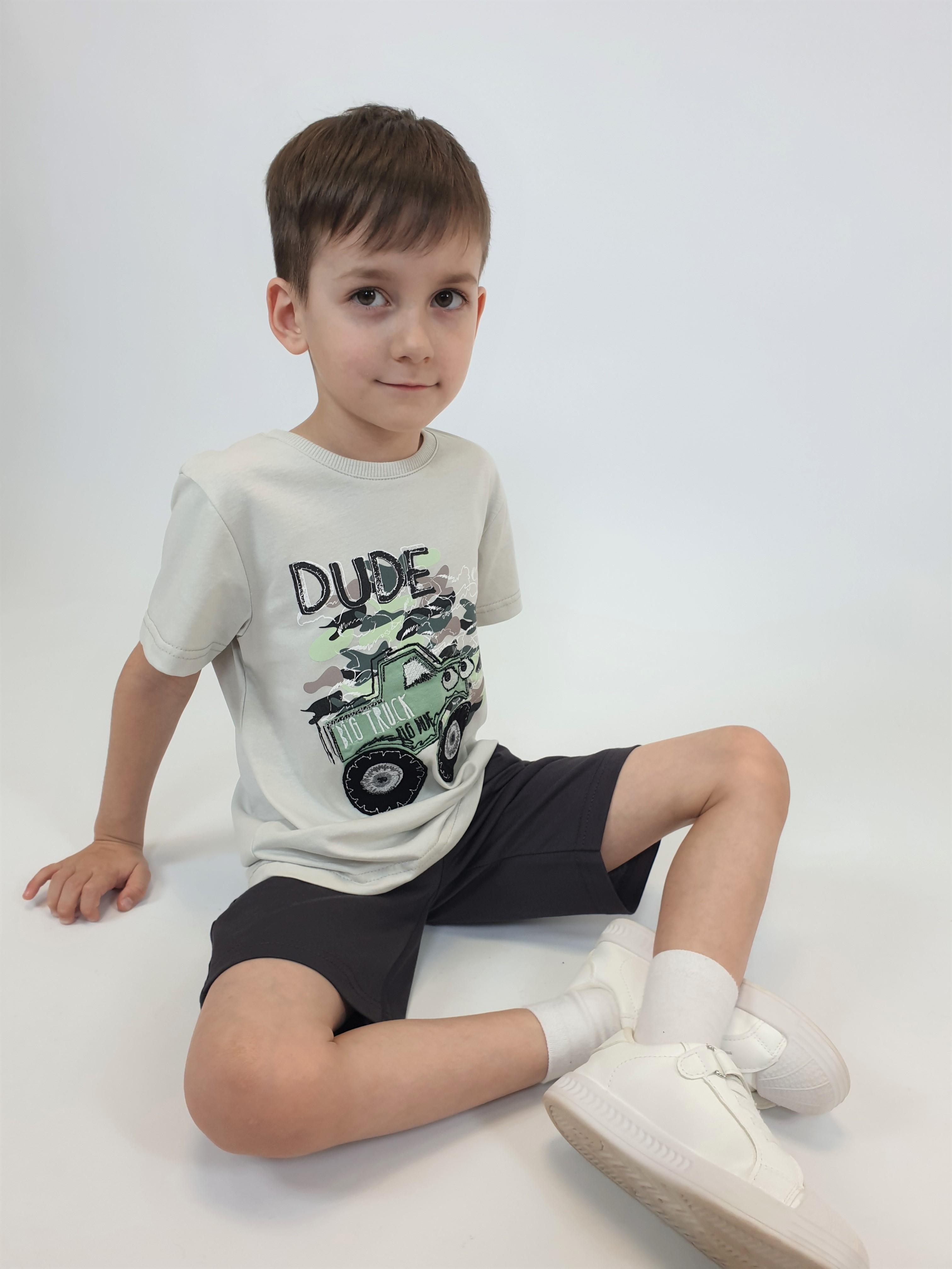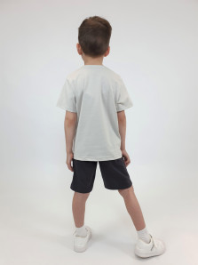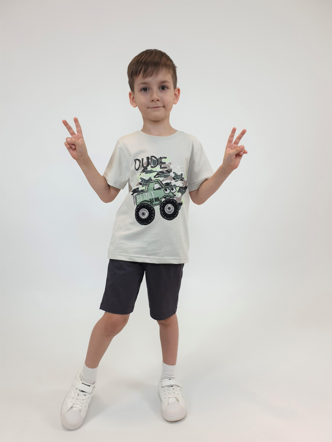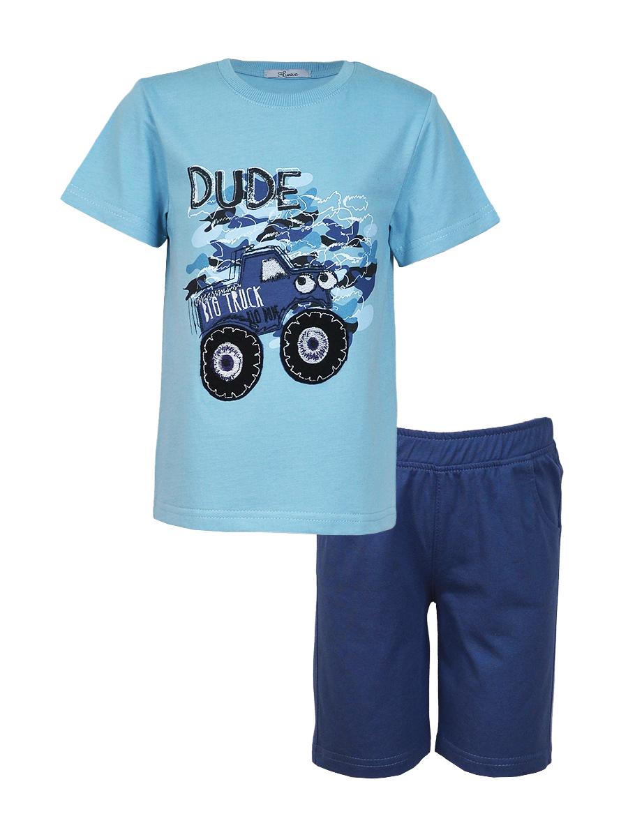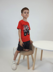Кулирное полотно: 100% х/б. Фуфайка-прямая,перед с печатью и вышивкой.Рукав втачной,короткий.Горловина обработана ластиком. Шорты-укороченные с притачным поясом и резинкой.Два боковых кармана.