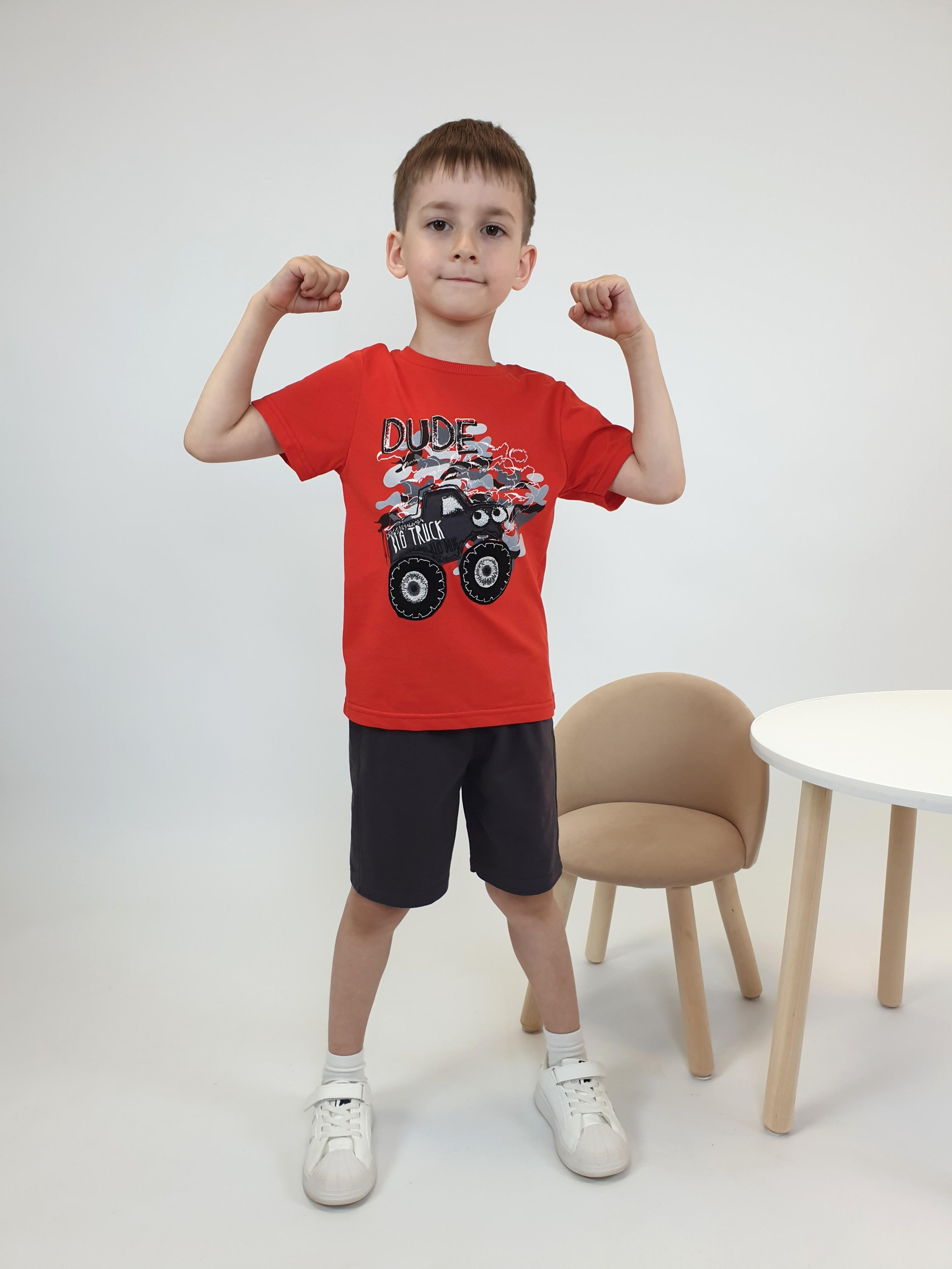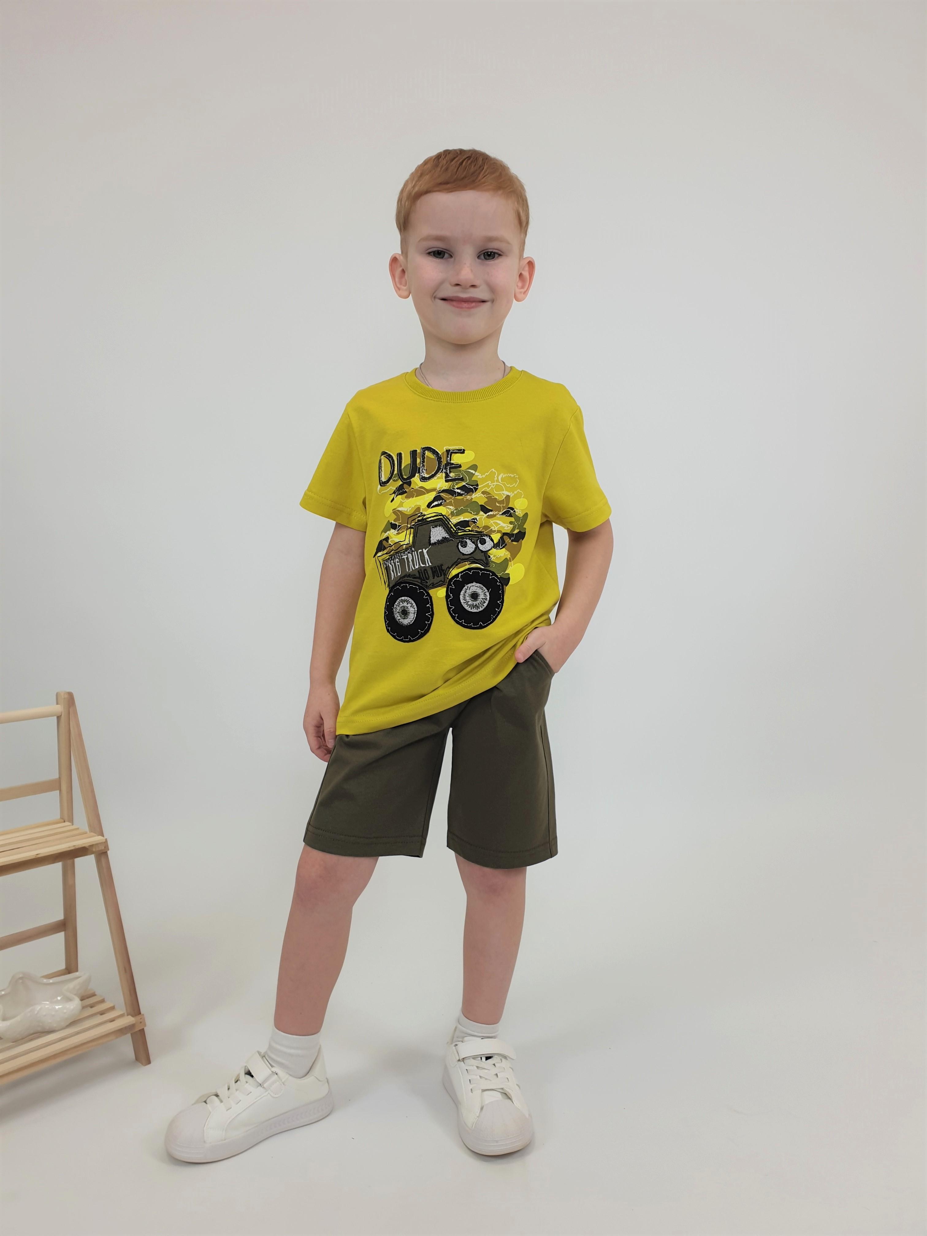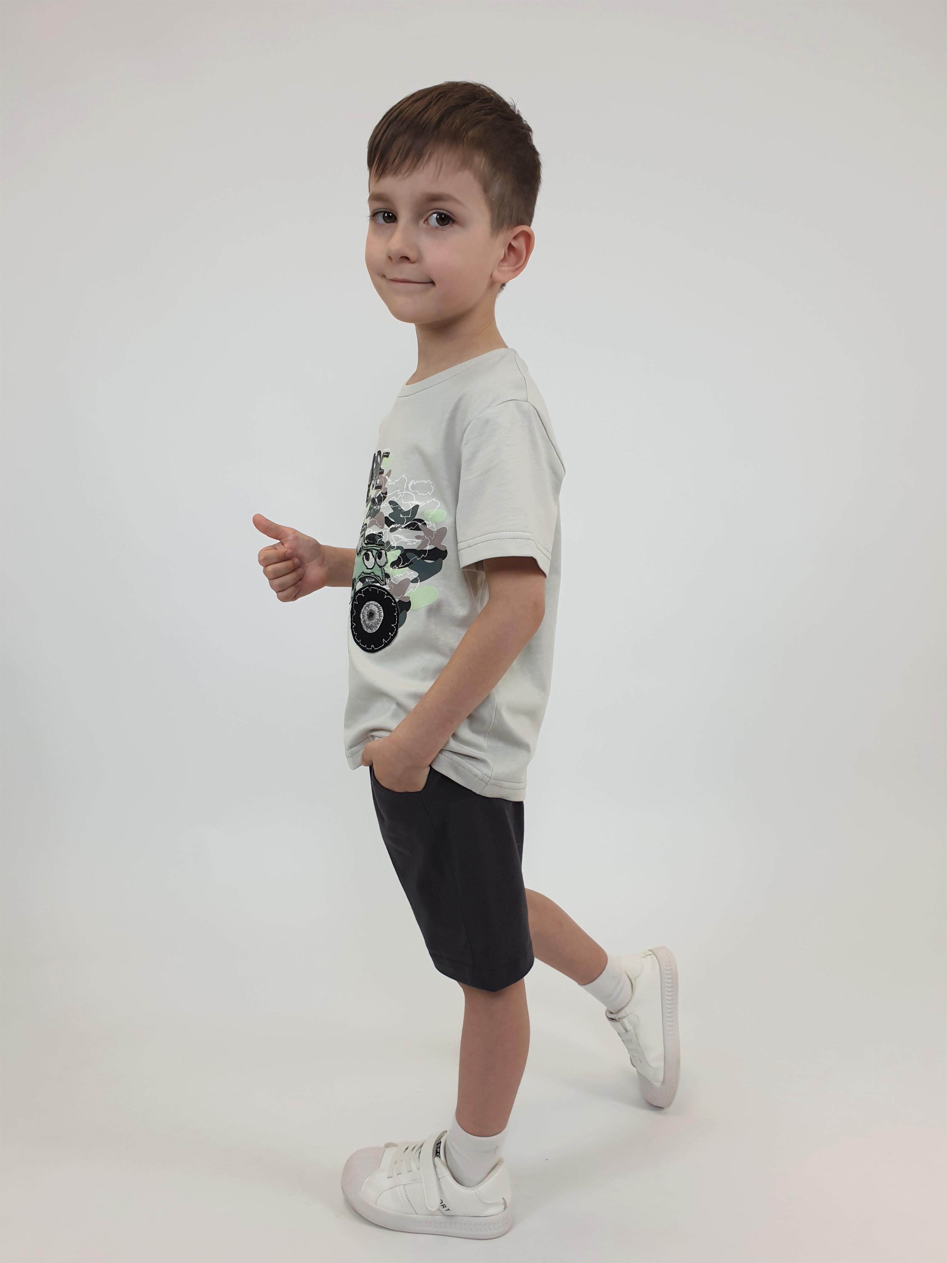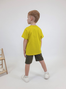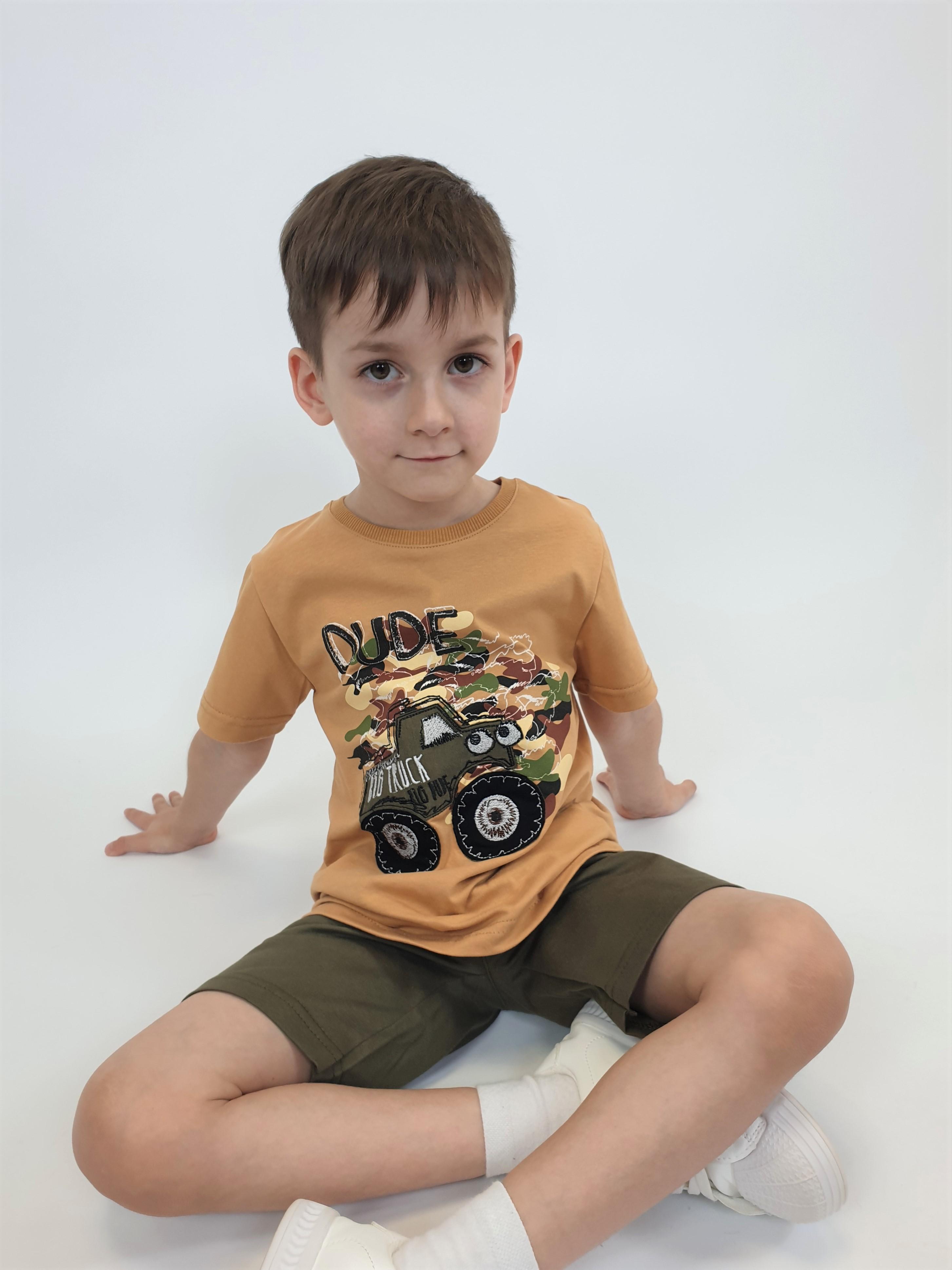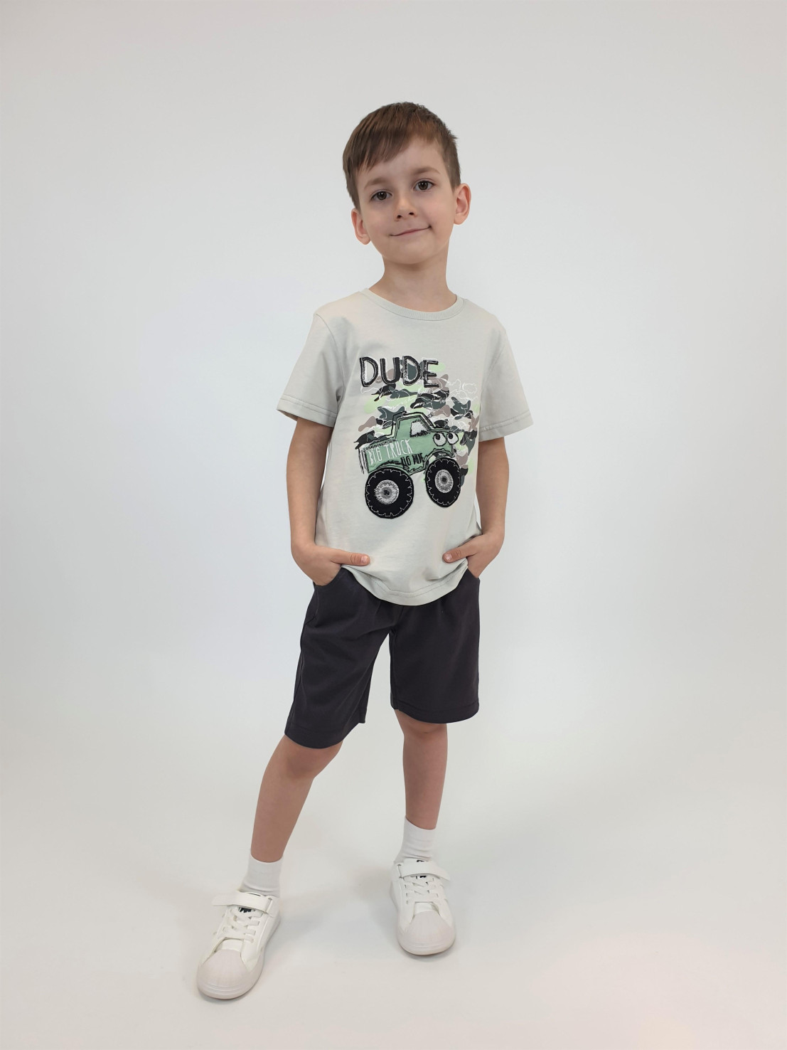 Кулирное полотно: 100% х/б. Фуфайка-прямая,перед с печатью и вышивкой.Рукав втачной,короткий.Горловина обработана ластиком. Шорты-укороченные с притачным поясом и резинкой.Два боковых кармана.