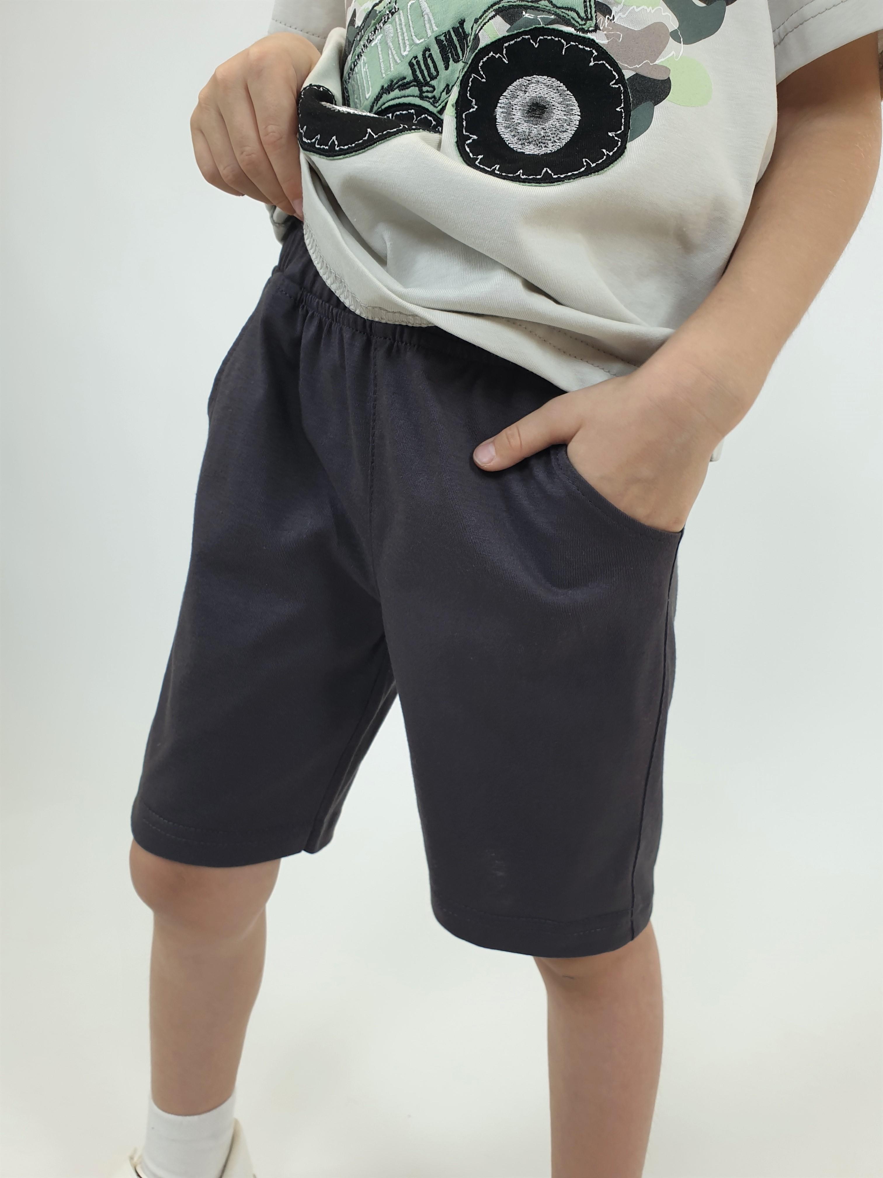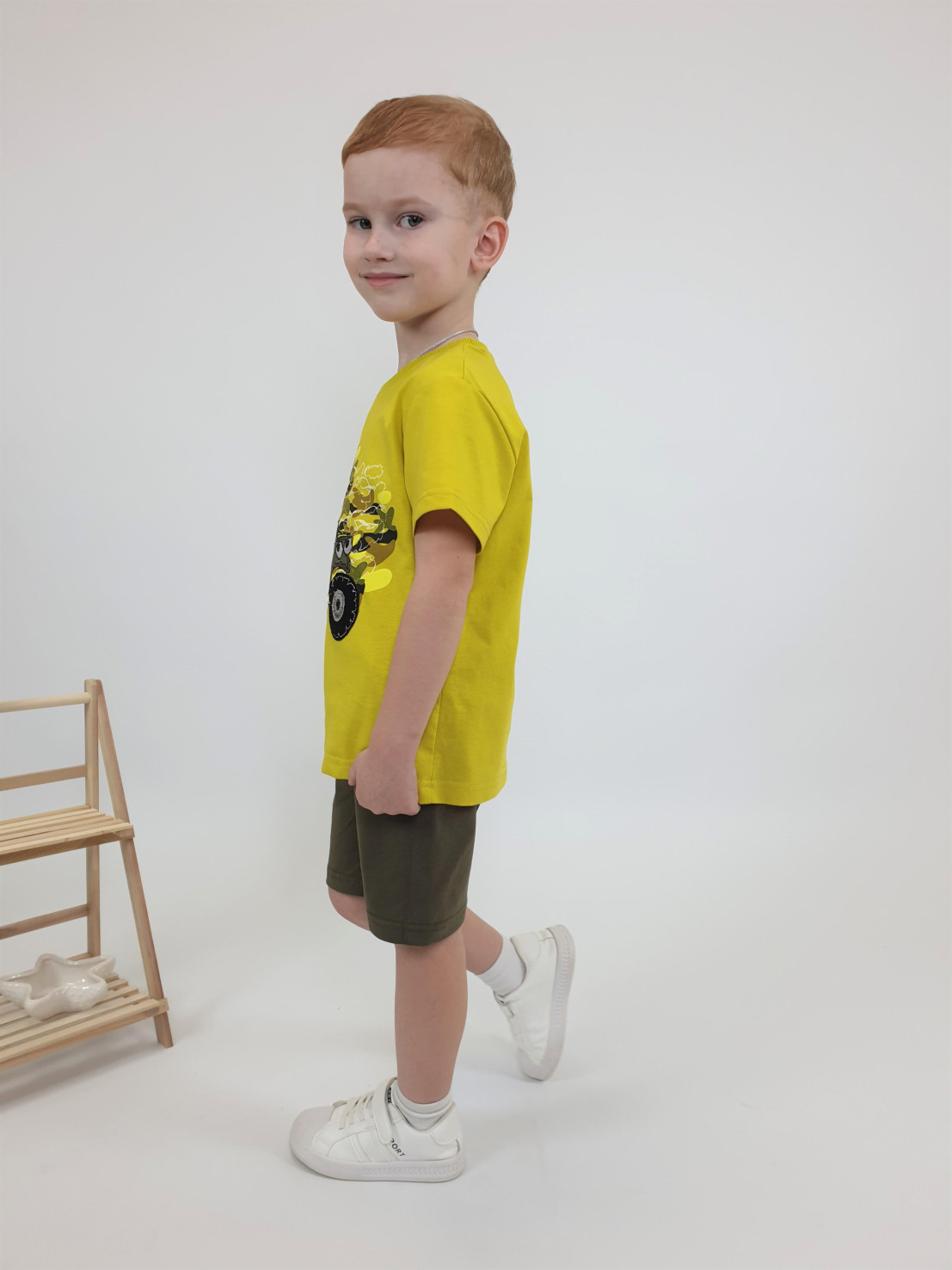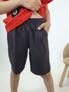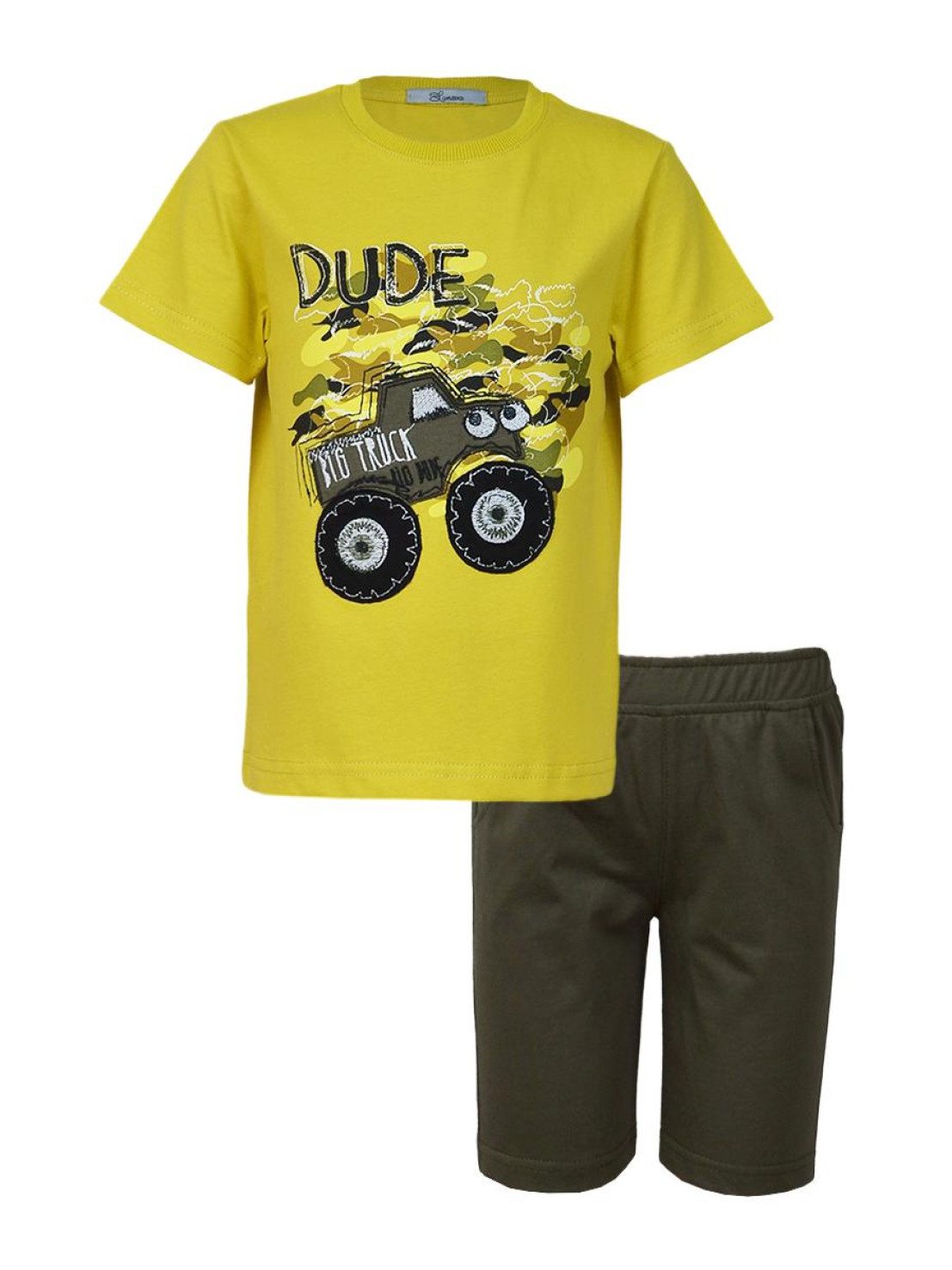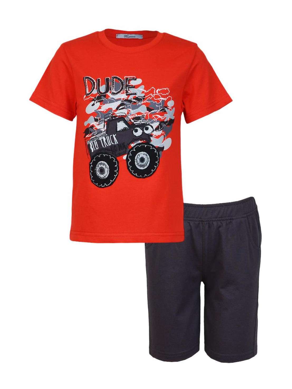 Кулирное полотно: 100% х/б. Фуфайка-прямая,перед с печатью и вышивкой.Рукав втачной,короткий.Горловина обработана ластиком. Шорты-укороченные с притачным поясом и резинкой.Два боковых кармана.