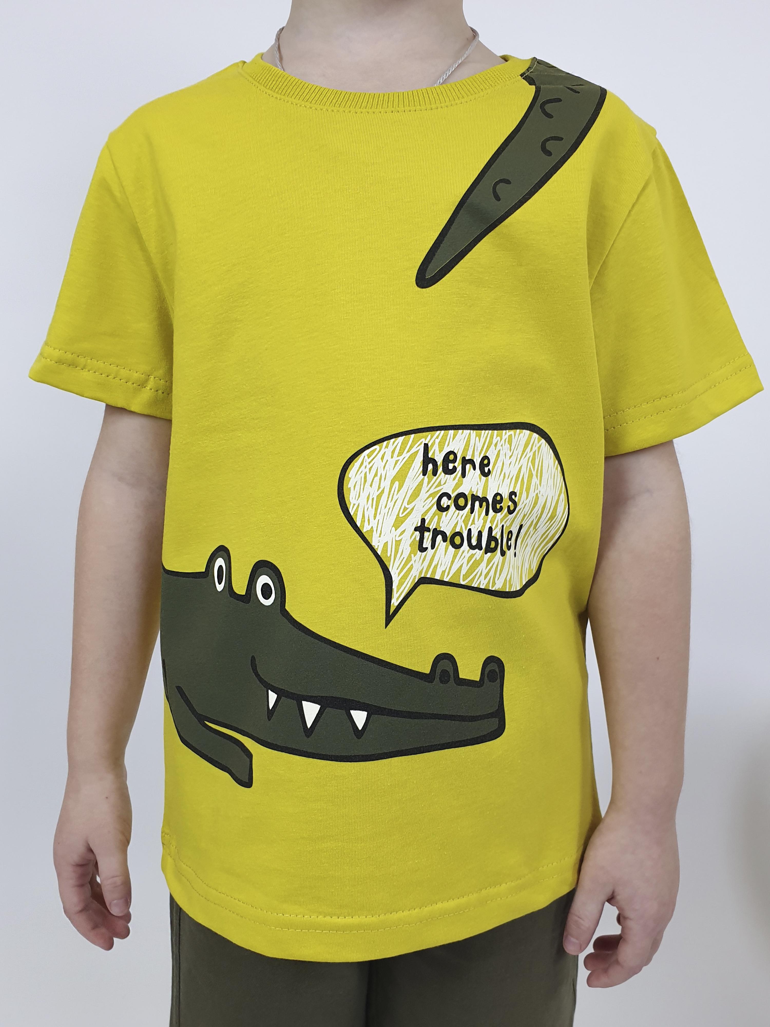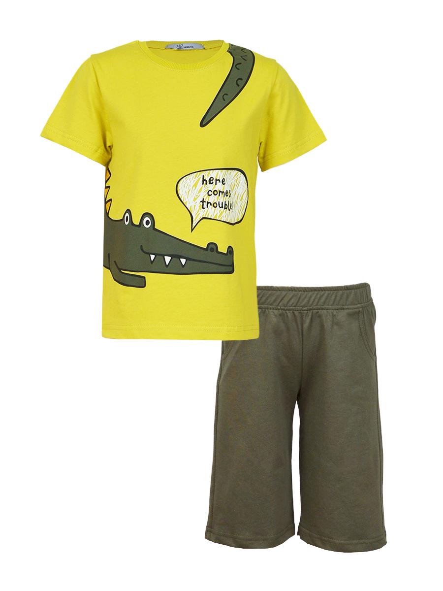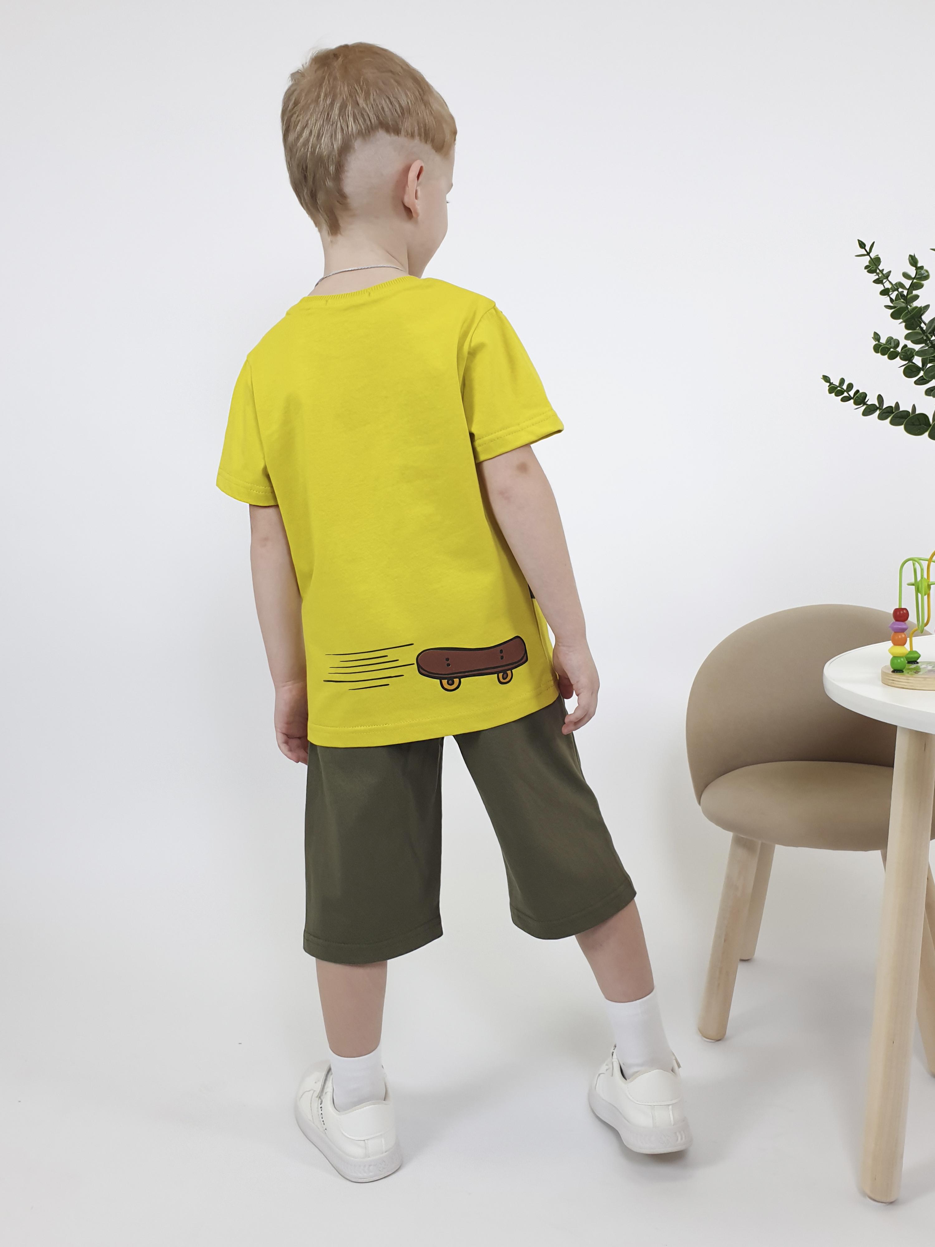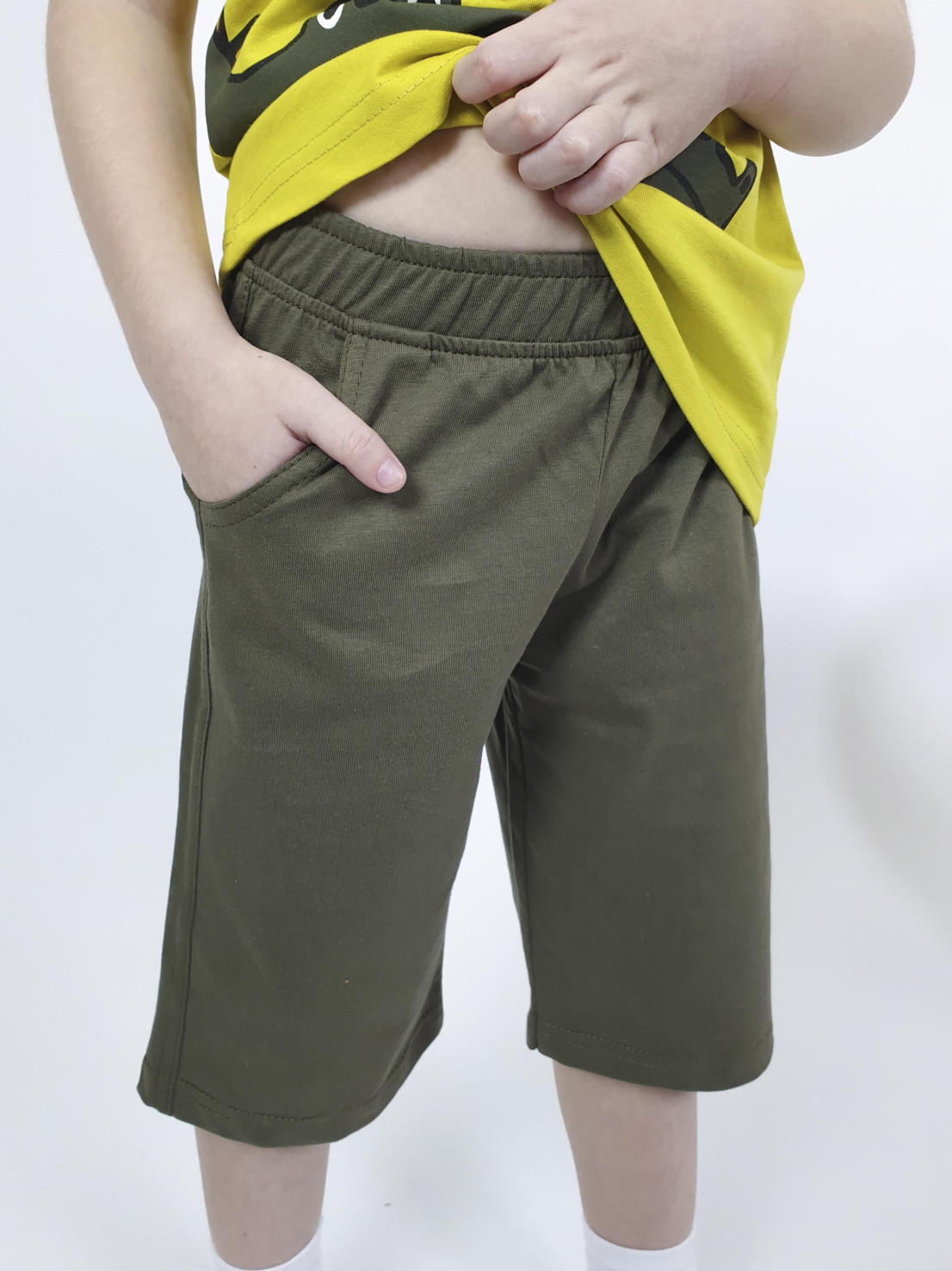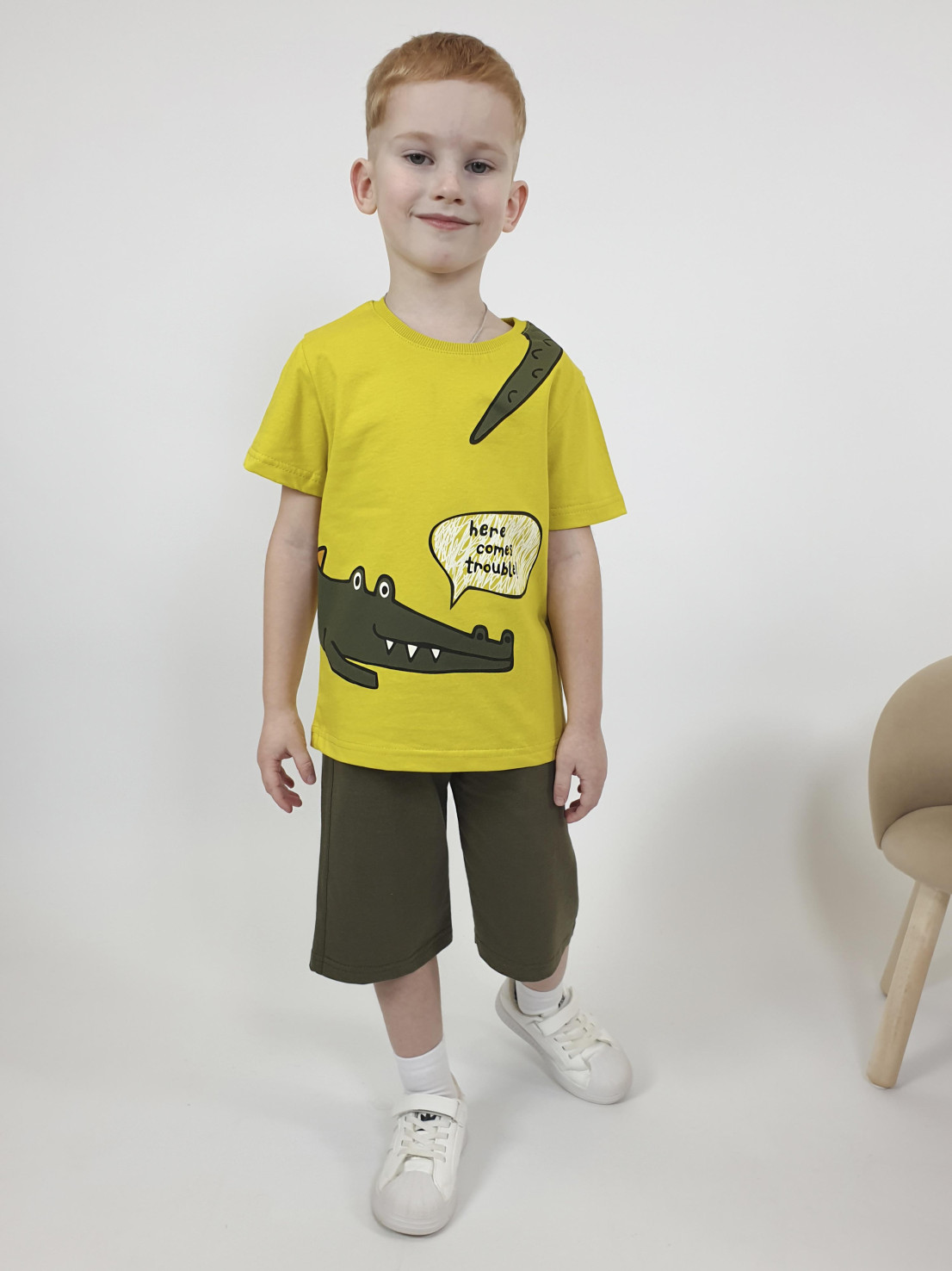 Кулирное полотно: 100% х/б. Фуфайка-прямая,перед с печатью.Рукав втачной,короткий.Горловина обработана ластиком. Шорты-удлиненные с притачным поясом и резинкой.Два боковых кармана.