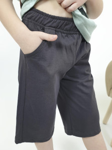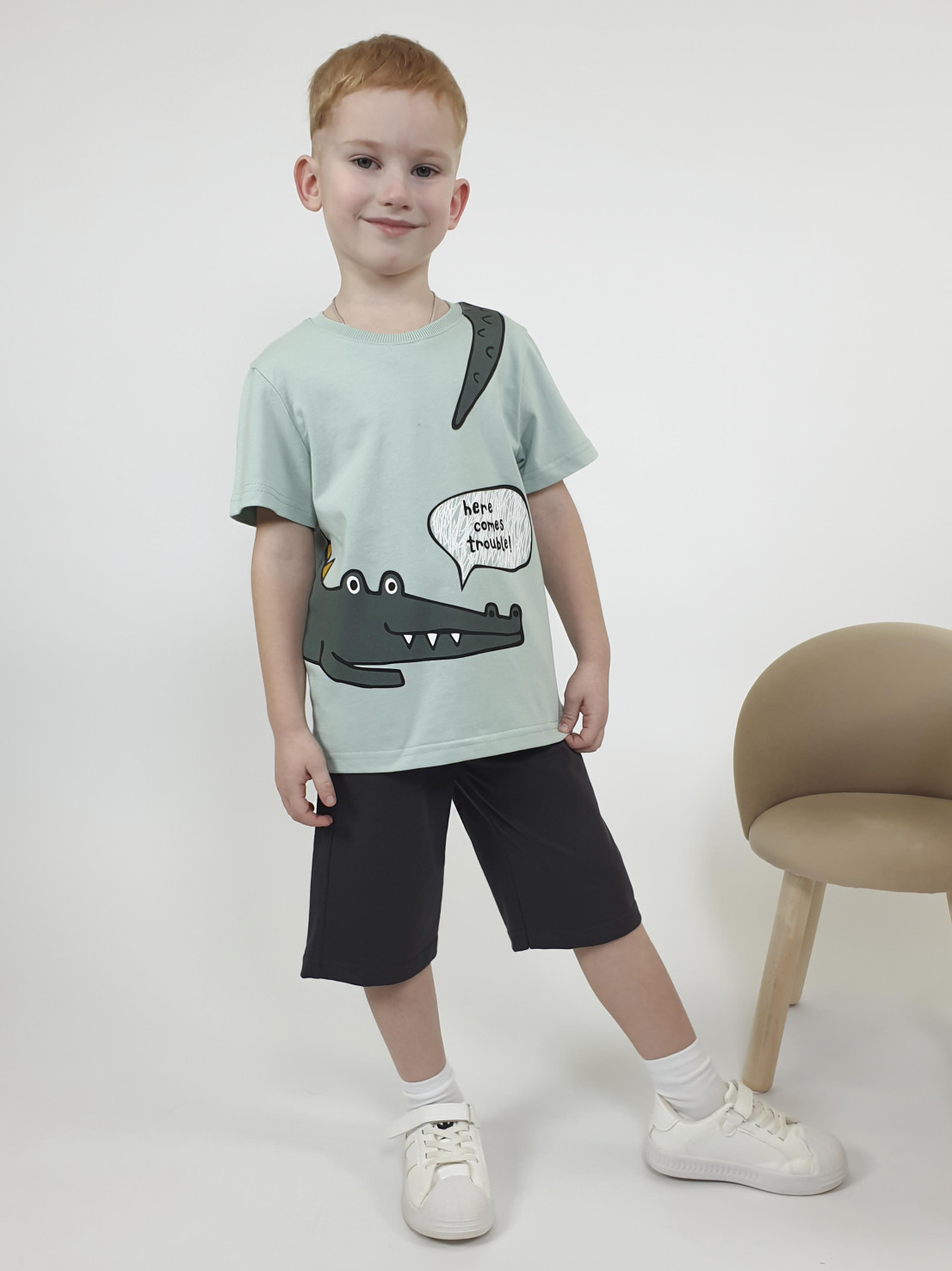 Кулирное полотно: 100% х/б. Фуфайка-прямая,перед с печатью.Рукав втачной,короткий.Горловина обработана ластиком. Шорты-удлиненные с притачным поясом и резинкой.Два боковых кармана.