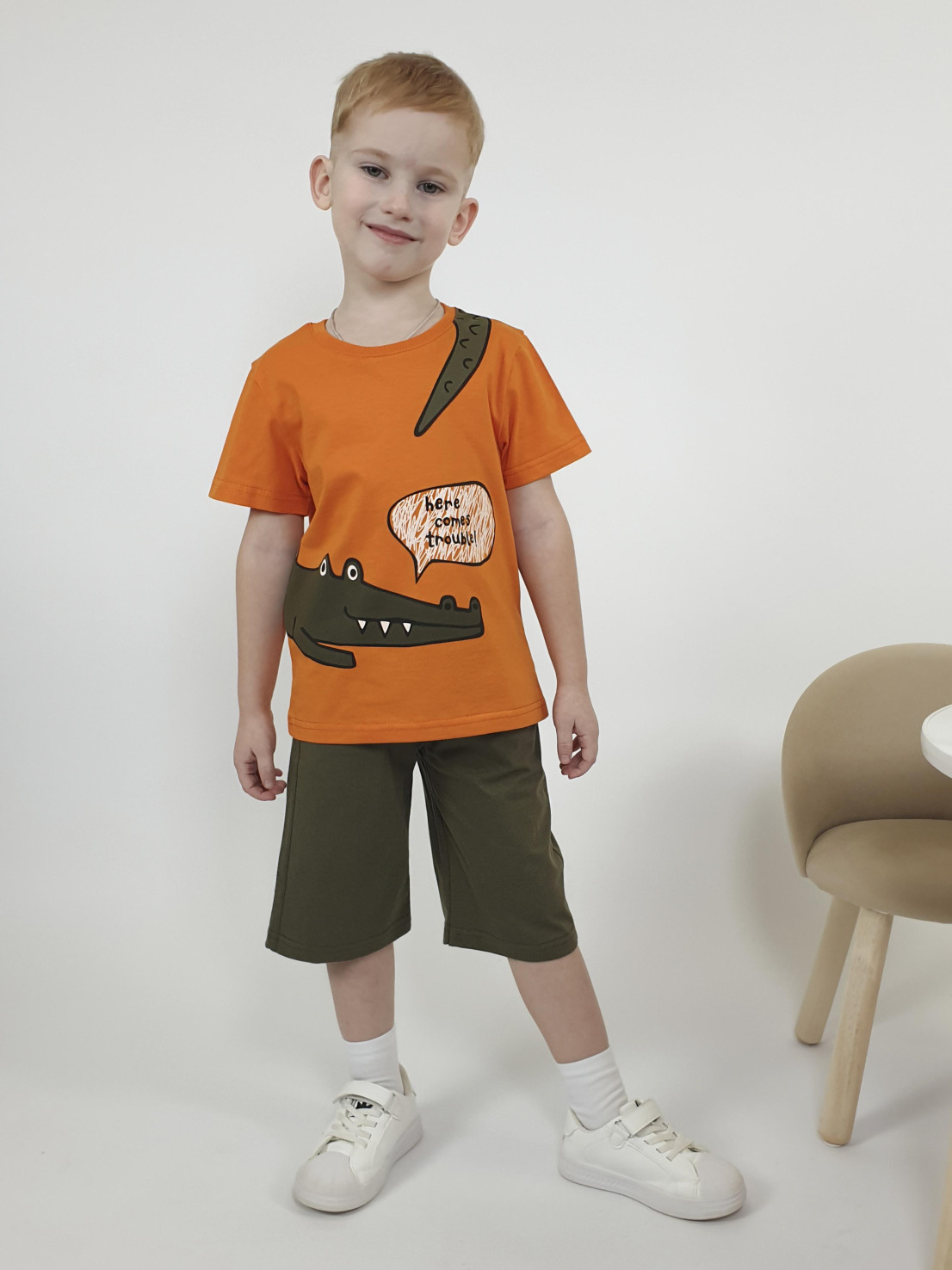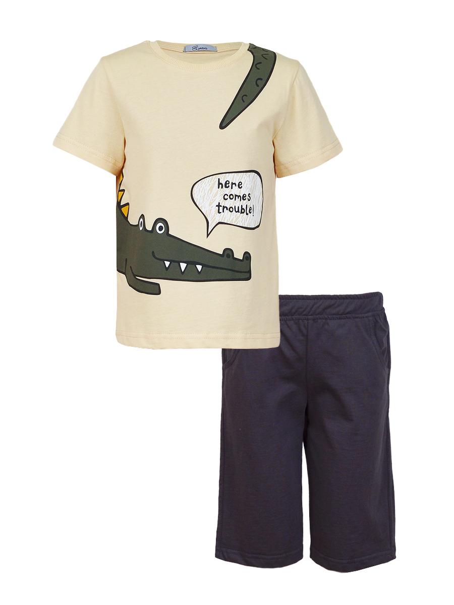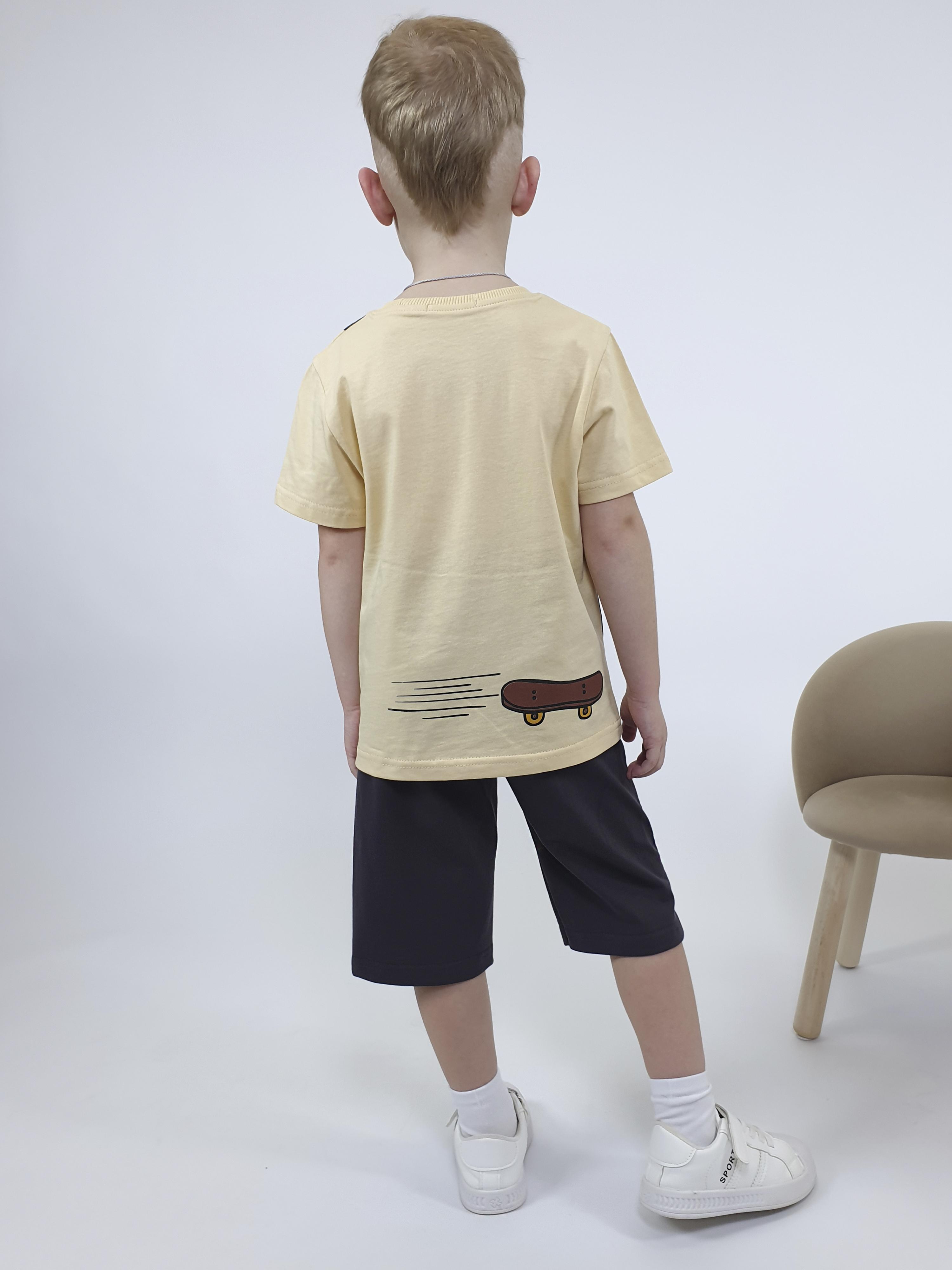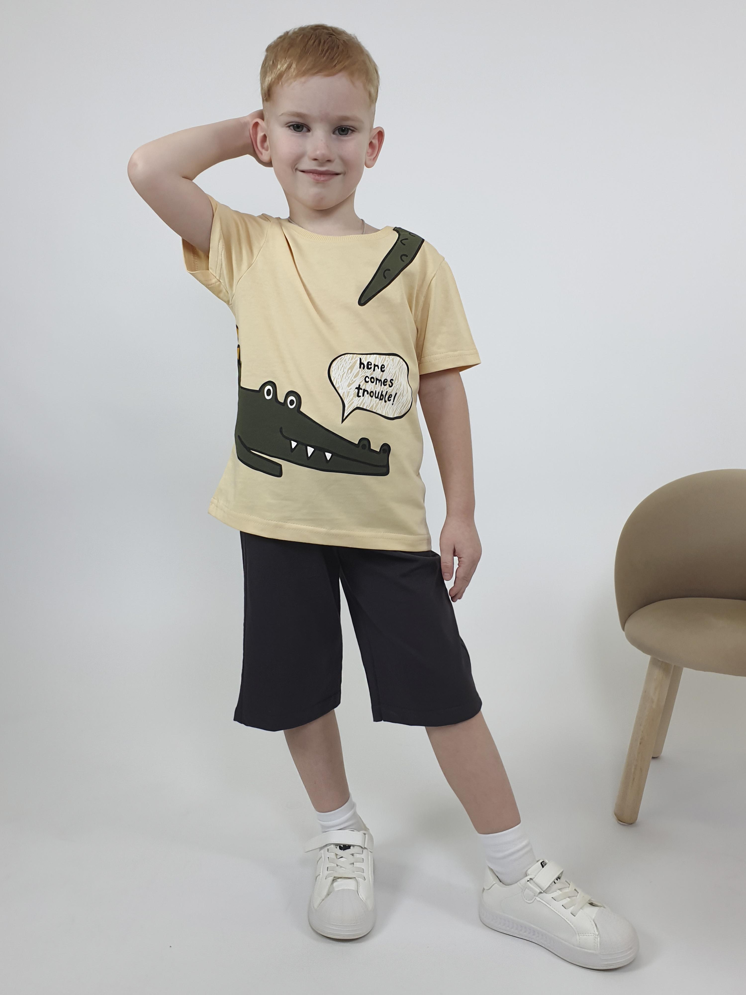Кулирное полотно: 100% х/б. Фуфайка-прямая,перед с печатью.Рукав втачной,короткий.Горловина обработана ластиком. Шорты-удлиненные с притачным поясом и резинкой.Два боковых кармана.