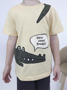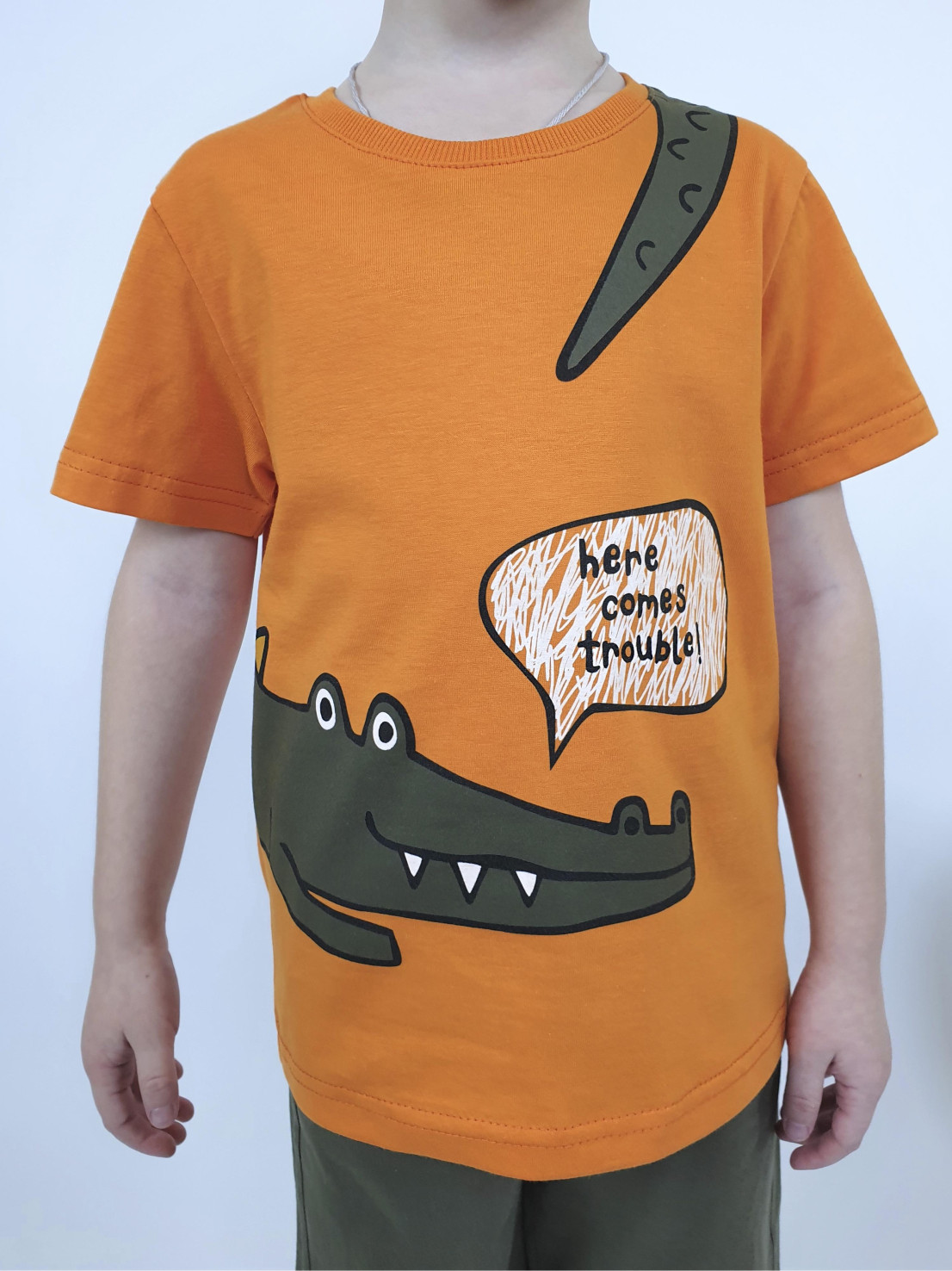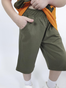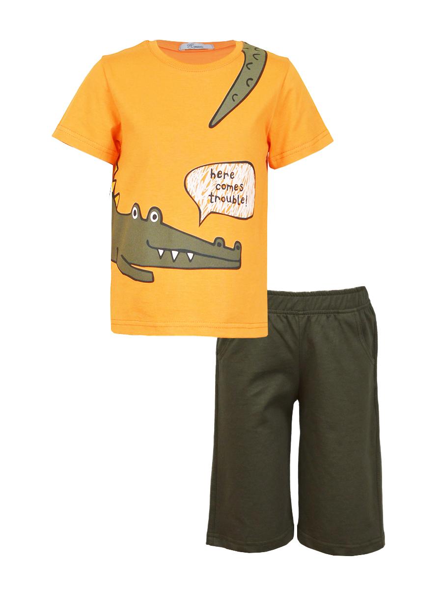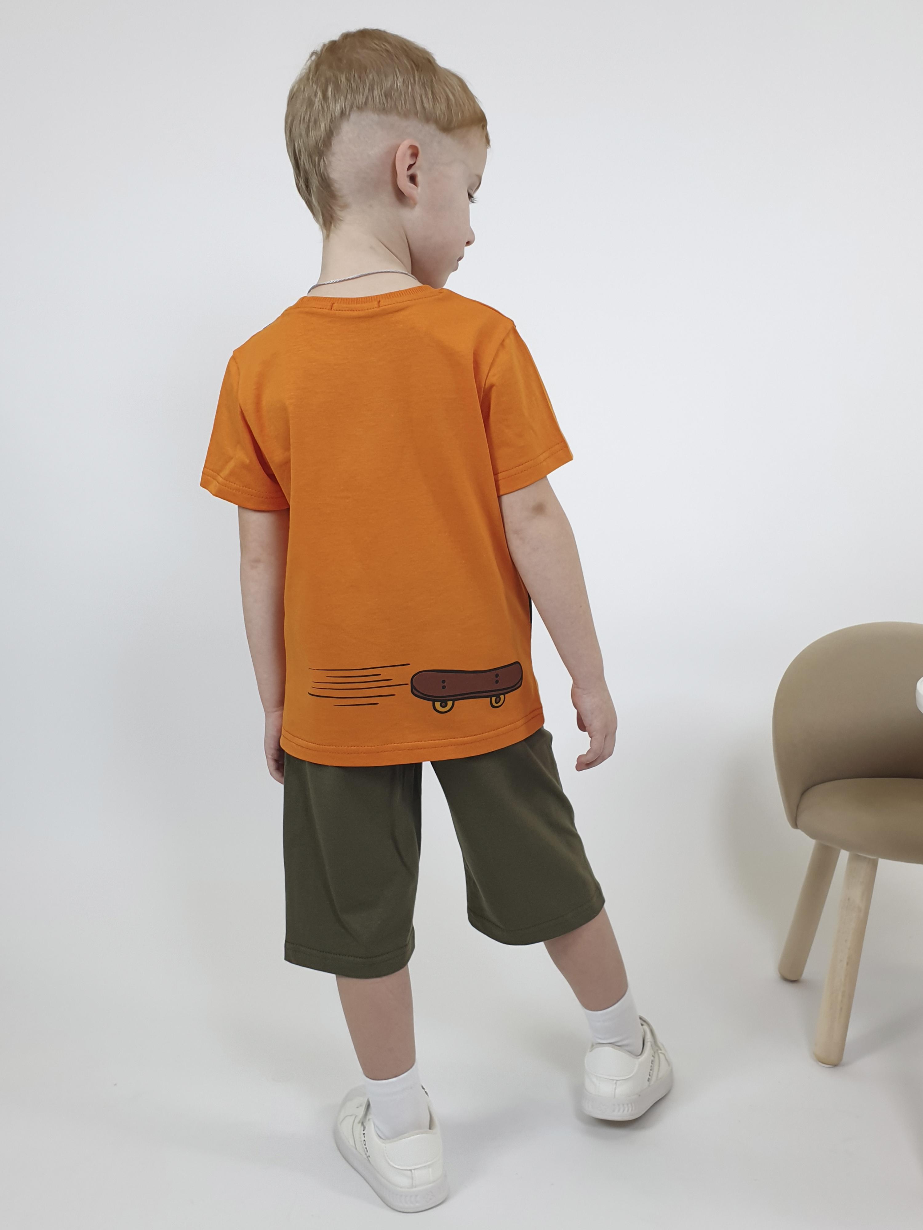 Кулирное полотно: 100% х/б. Фуфайка-прямая,перед с печатью.Рукав втачной,короткий.Горловина обработана ластиком. Шорты-удлиненные с притачным поясом и резинкой.Два боковых кармана.