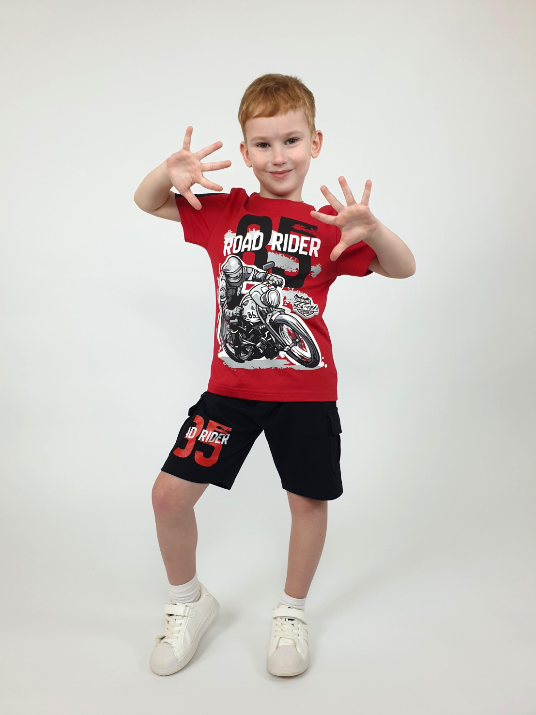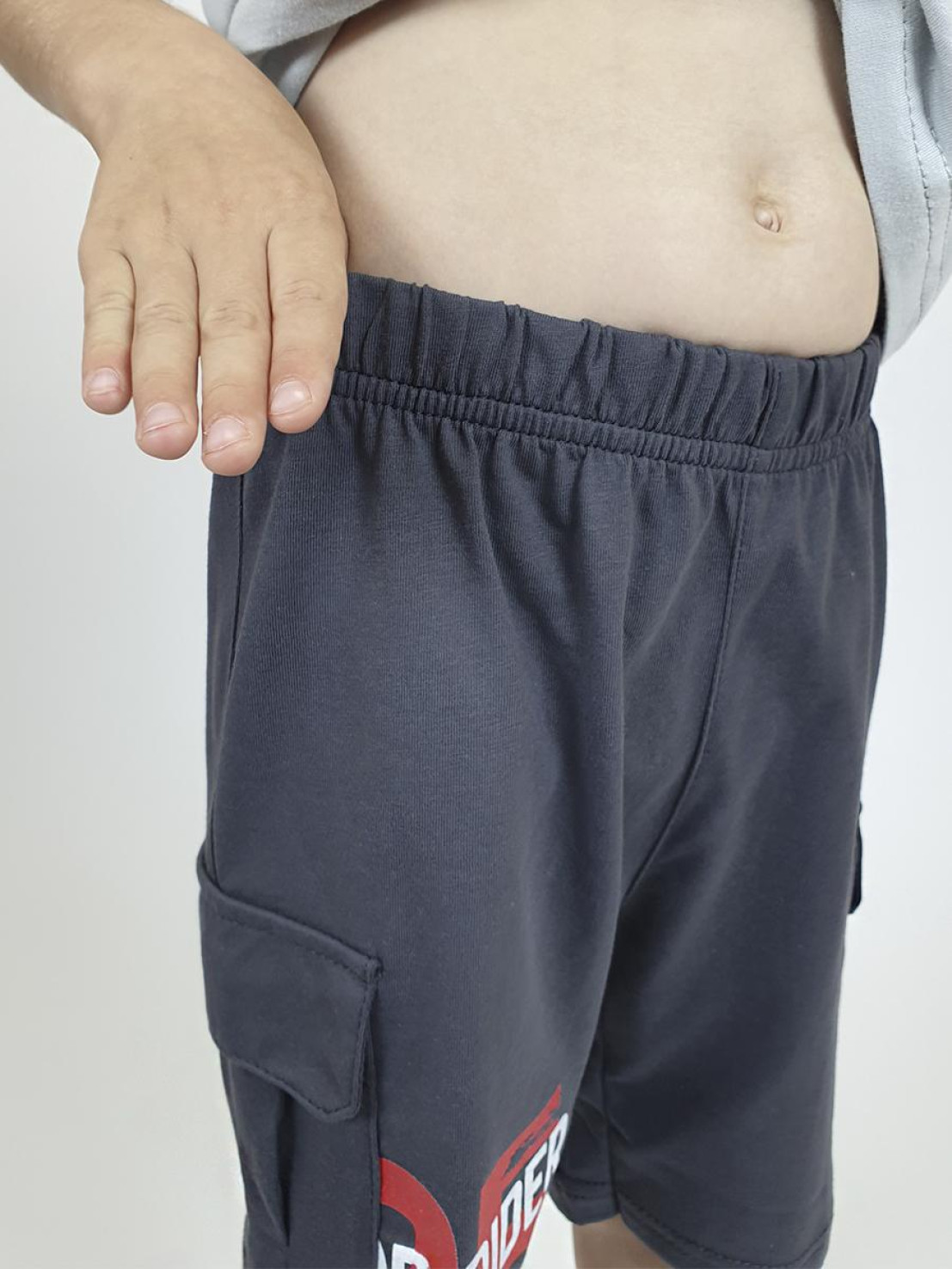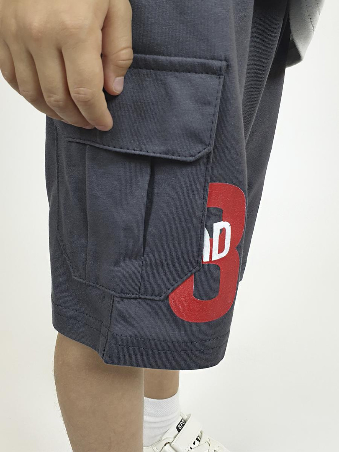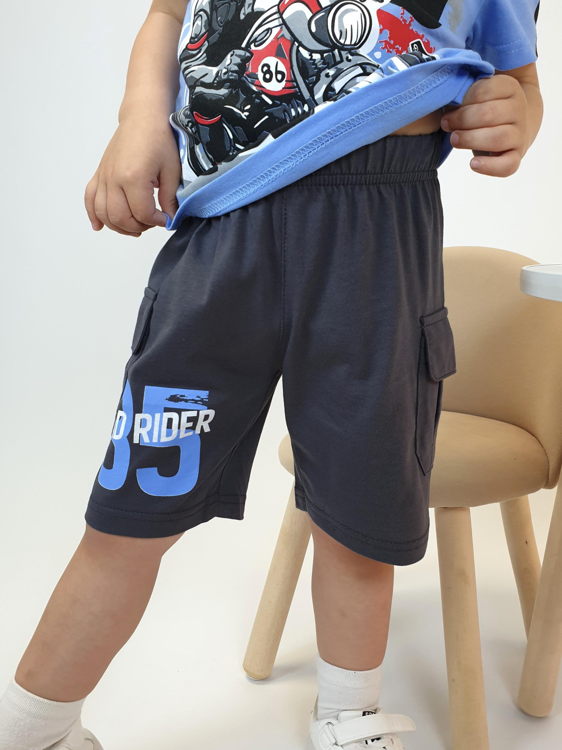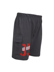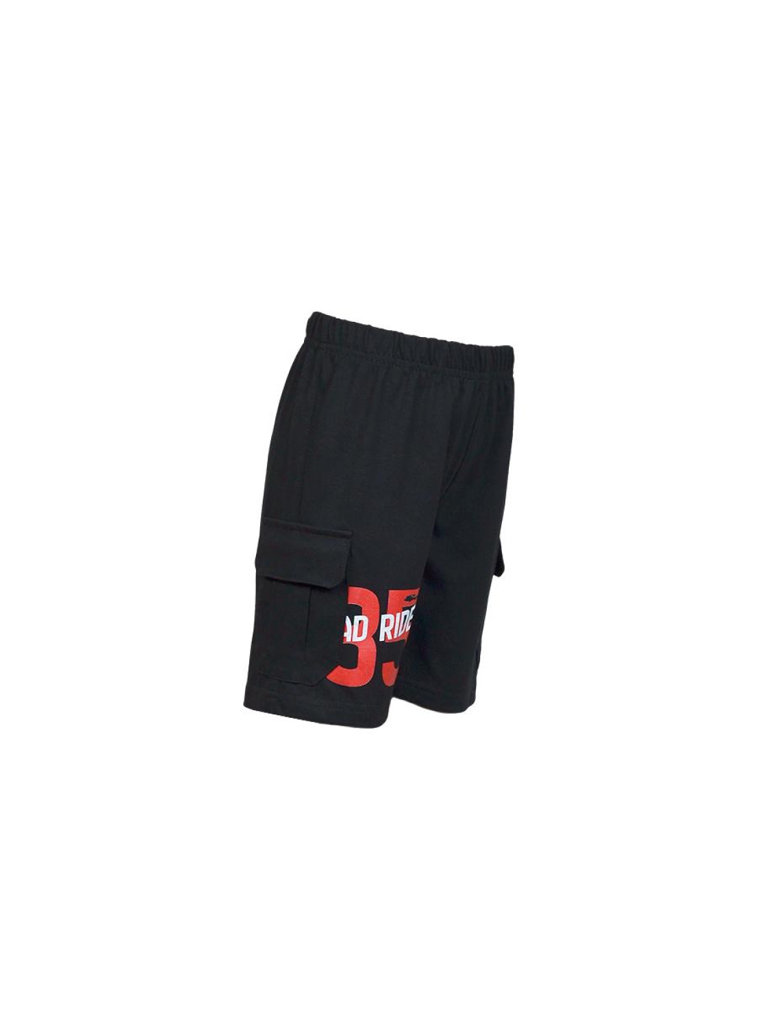 Кулирное полотно: 100 % х/б. Фуфайка-прямая,короткий втачной рукав,перед и рукава с печатью.Горловина обработана ластиком. Шорты -удлиненные,притачной пояс с резинкой.Два накладных кармана с клапаном сбоку.Печать на правой передней половинке шорт внизу.