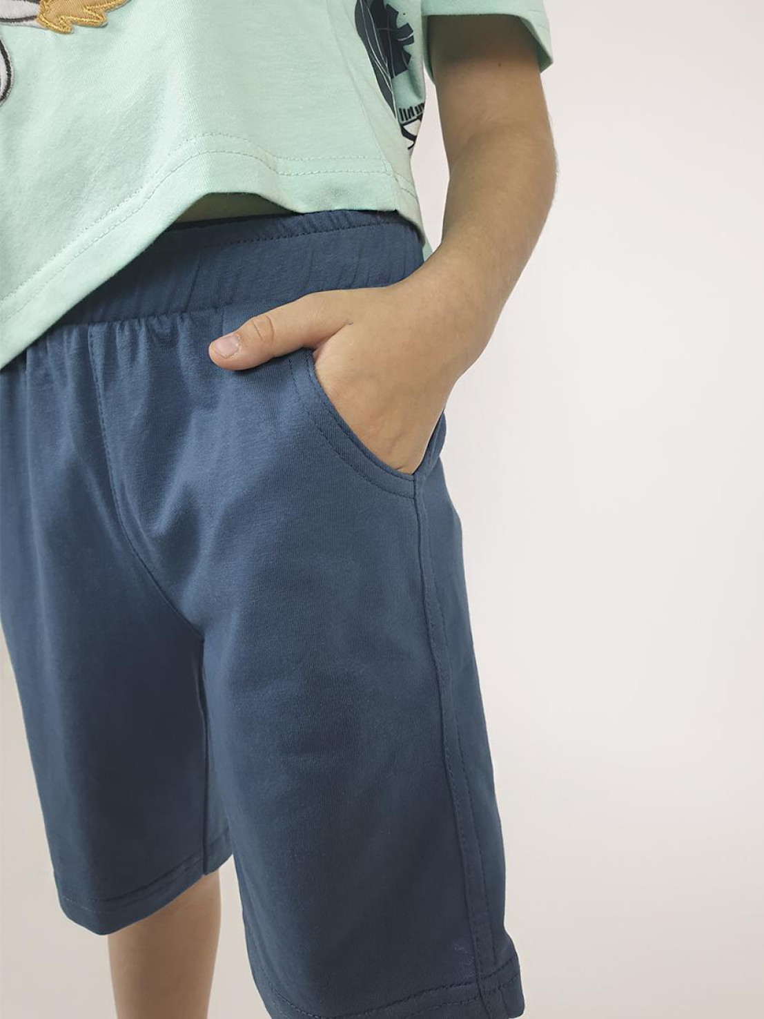 Кулирное полотно: 100% х/б. Фуфайка-прямая,перед и спинка с печатью.Вышивка(аппликация) на переде.Рукав втачной,короткий.Горловина обработана ластиком. Шорты-укороченные с притачным поясом и резинкой.Два боковых кармана по переду.