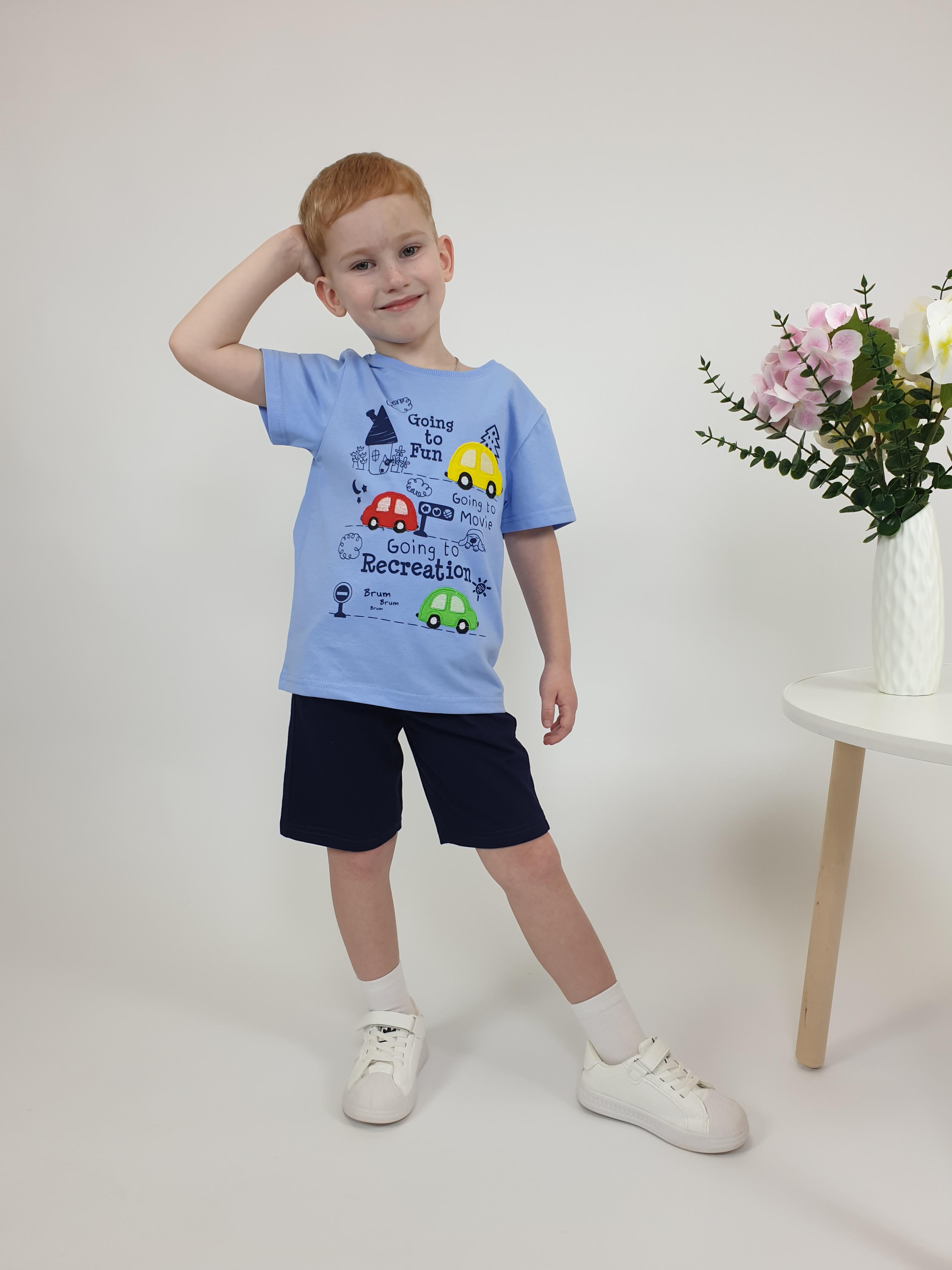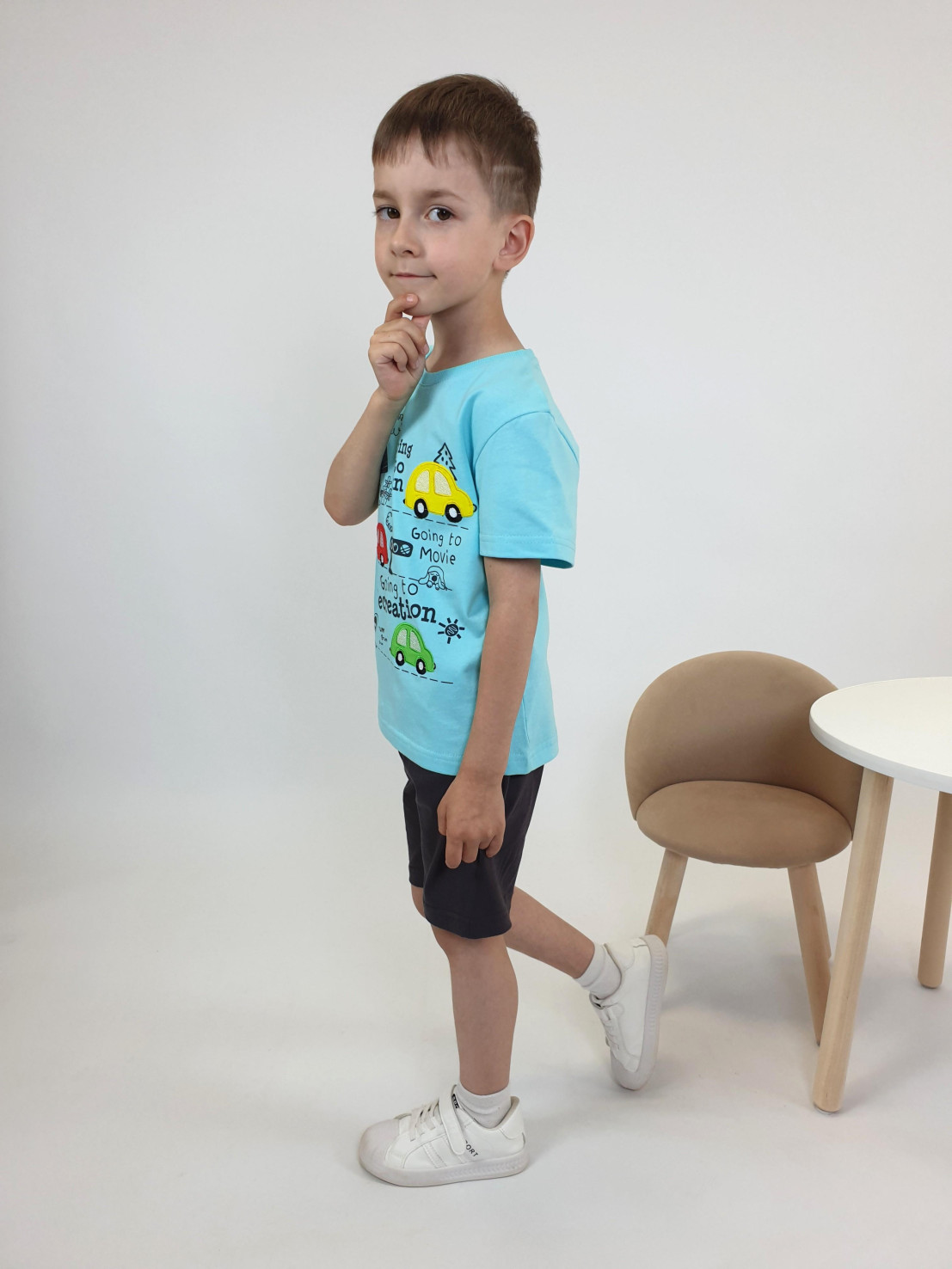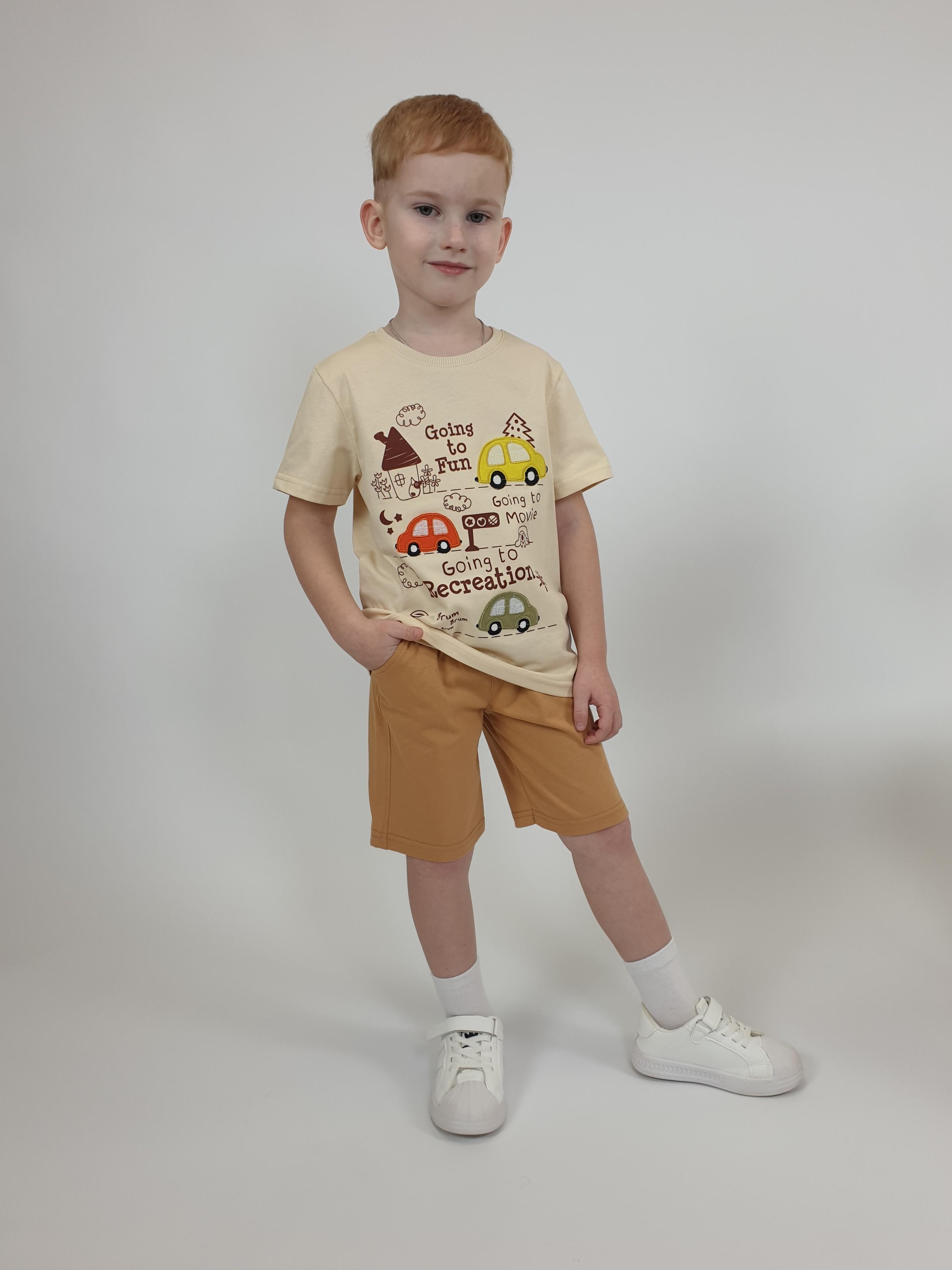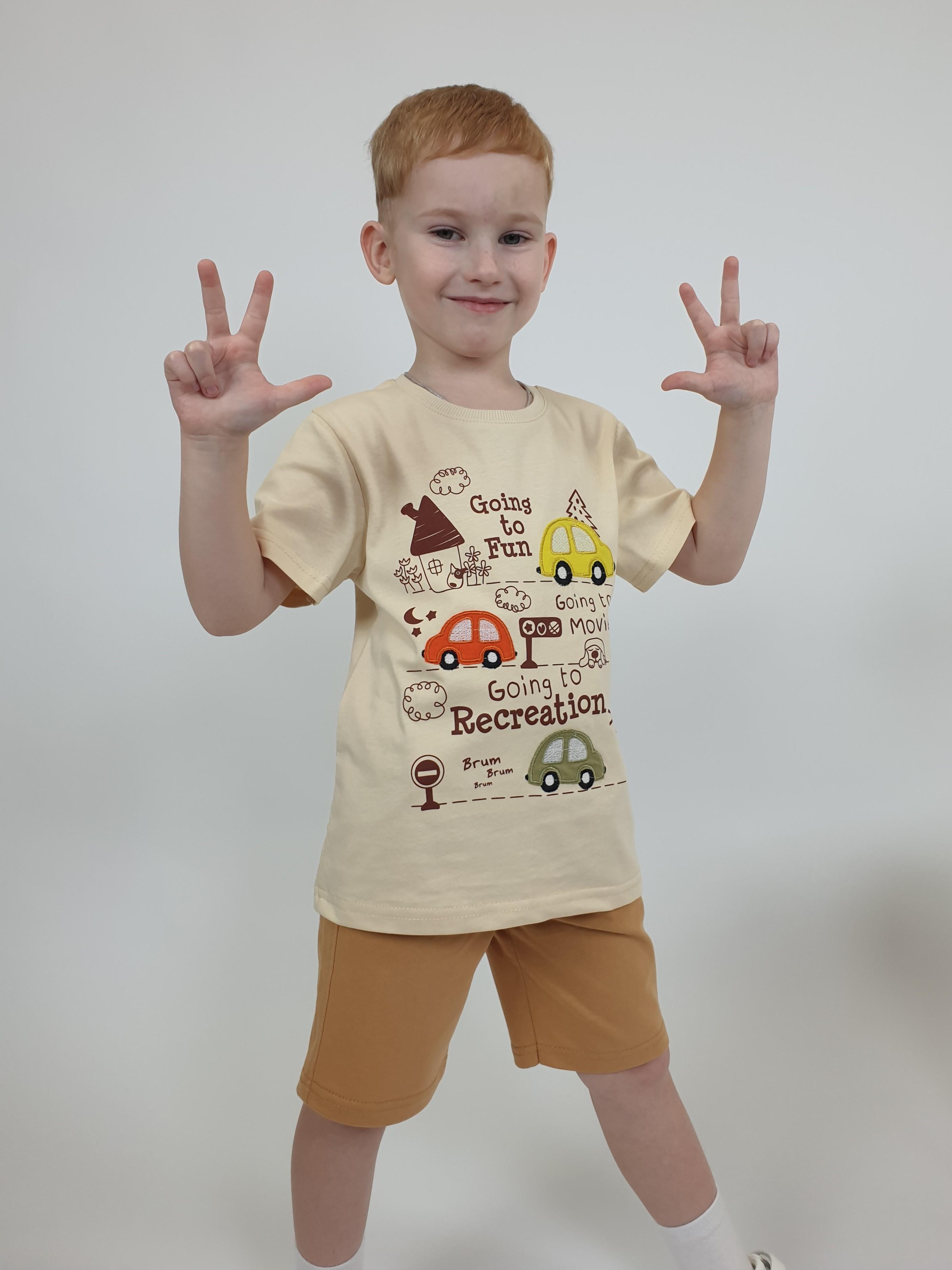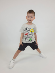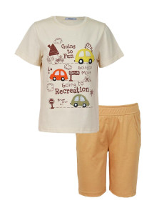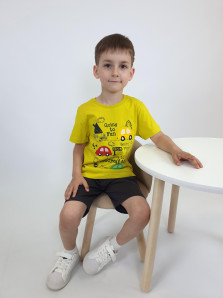 Кулирное полотно: 100% х/б. Фуфайка-прямая,перед с печатью и вышивкой(аппликацией).Рукав втачной,короткий.Горловина обработана ластиком. Шорты-укороченные с притачным поясом и резинкой.Два боковых кармана.