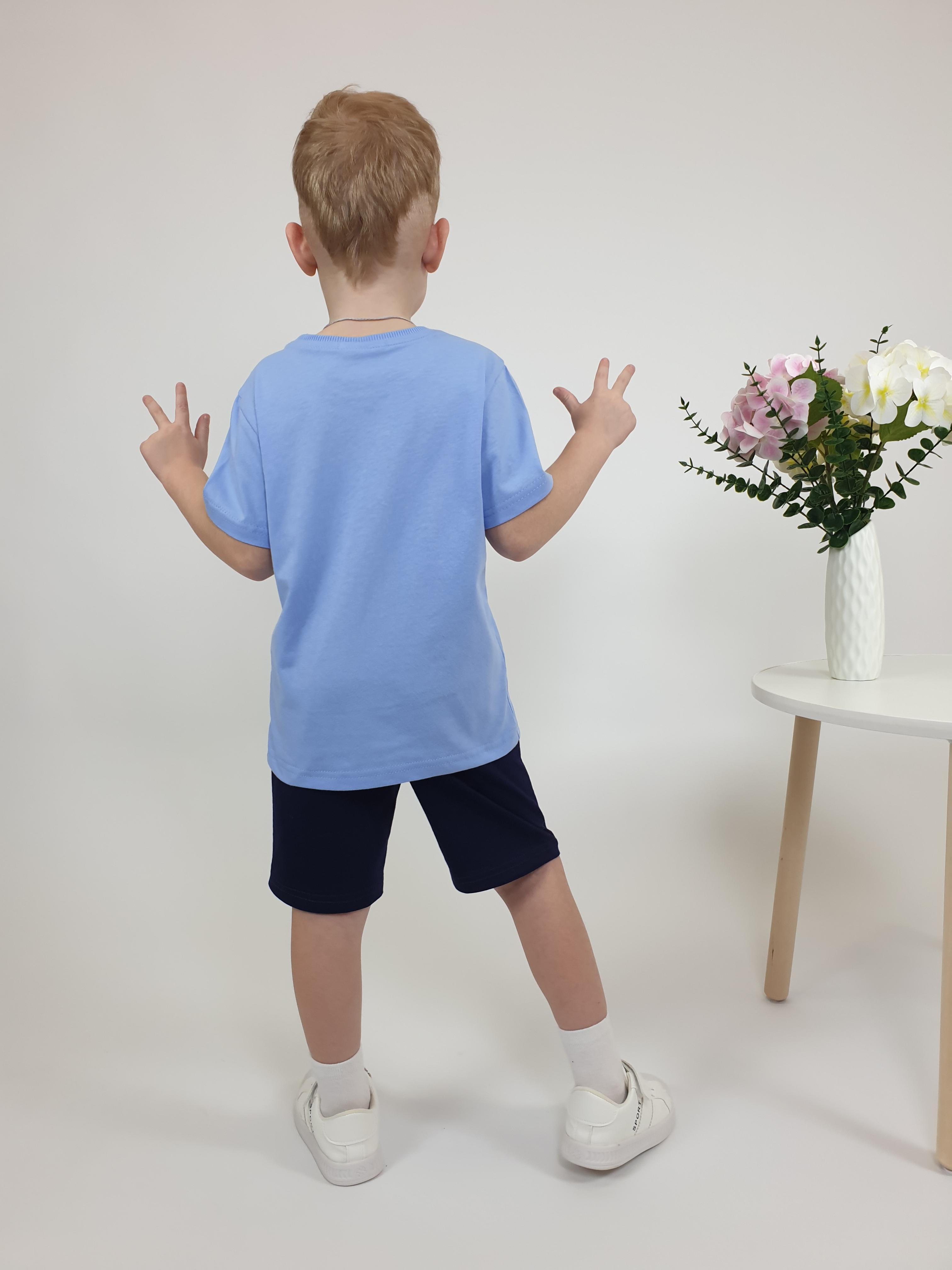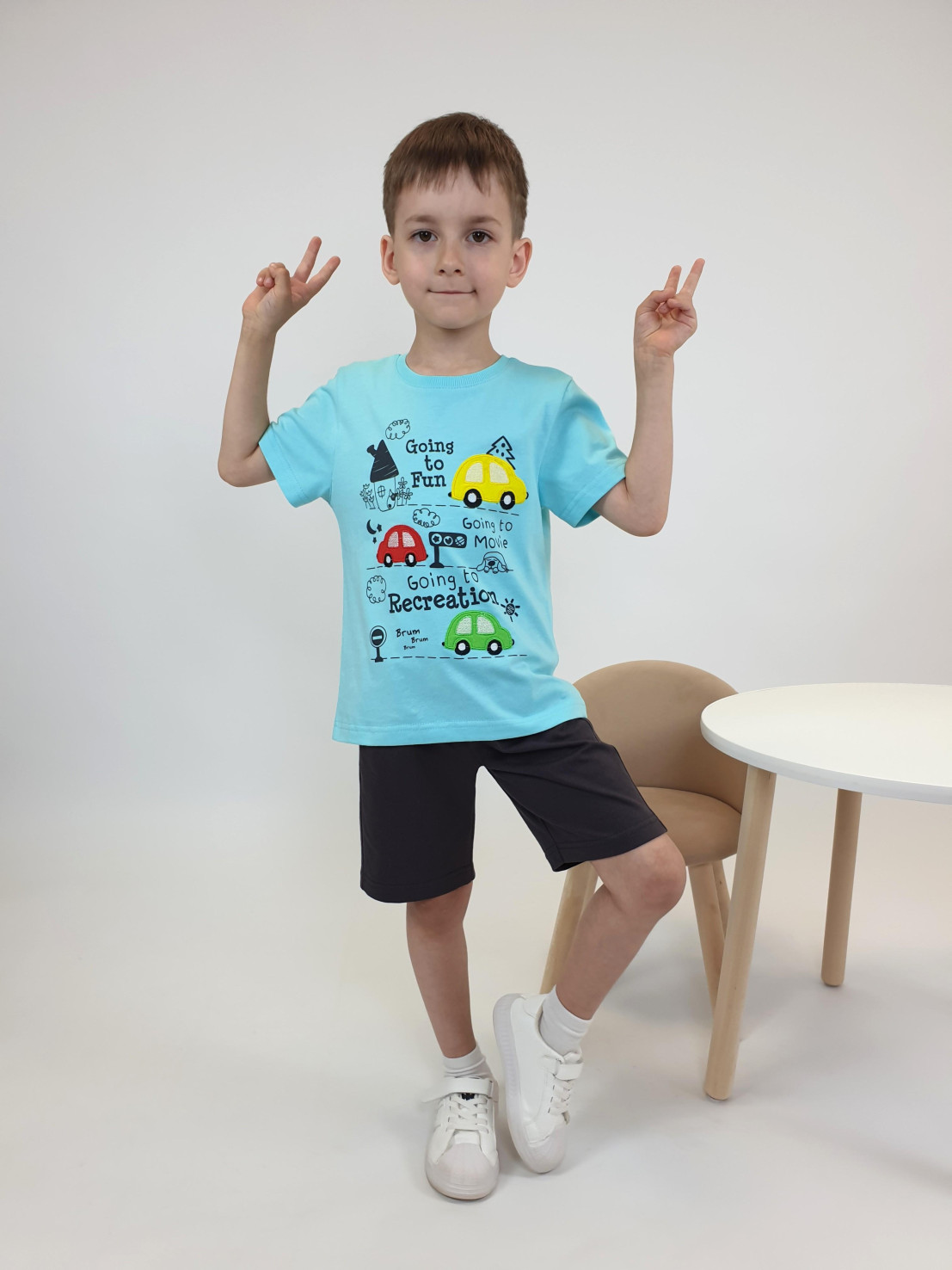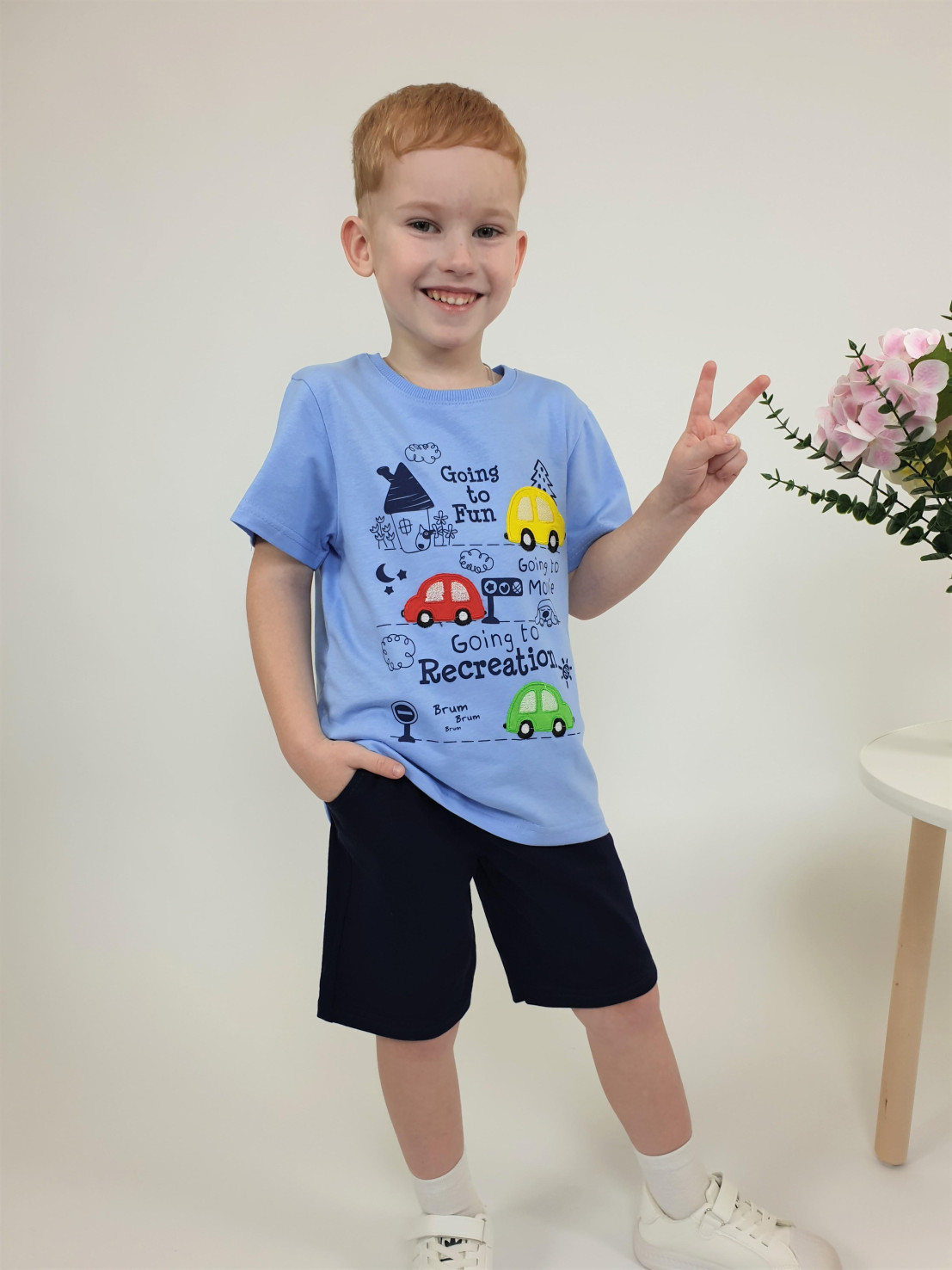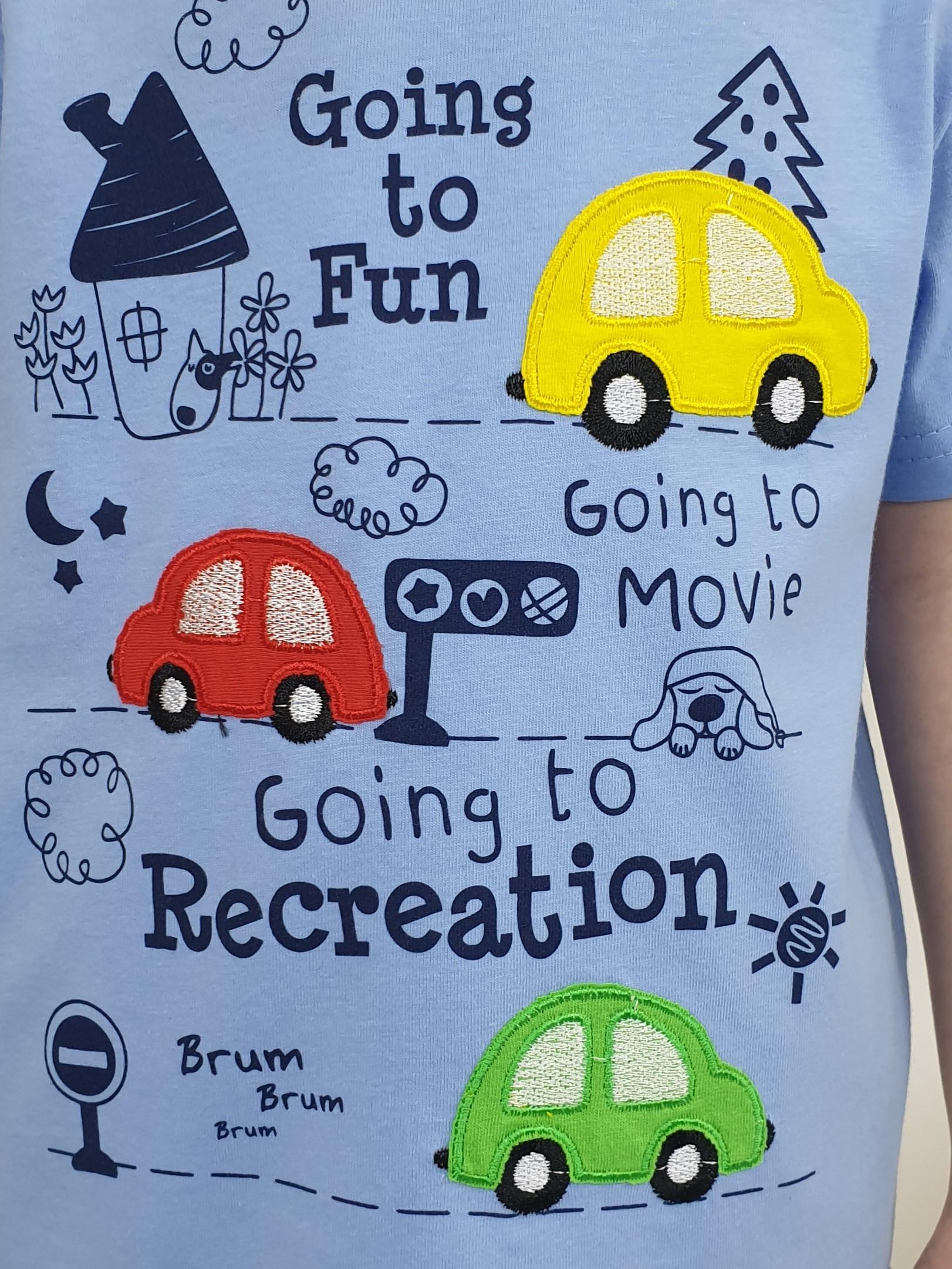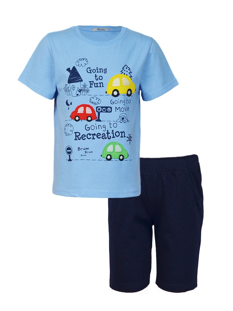 Кулирное полотно: 100% х/б. Фуфайка-прямая,перед с печатью и вышивкой(аппликацией).Рукав втачной,короткий.Горловина обработана ластиком. Шорты-укороченные с притачным поясом и резинкой.Два боковых кармана.