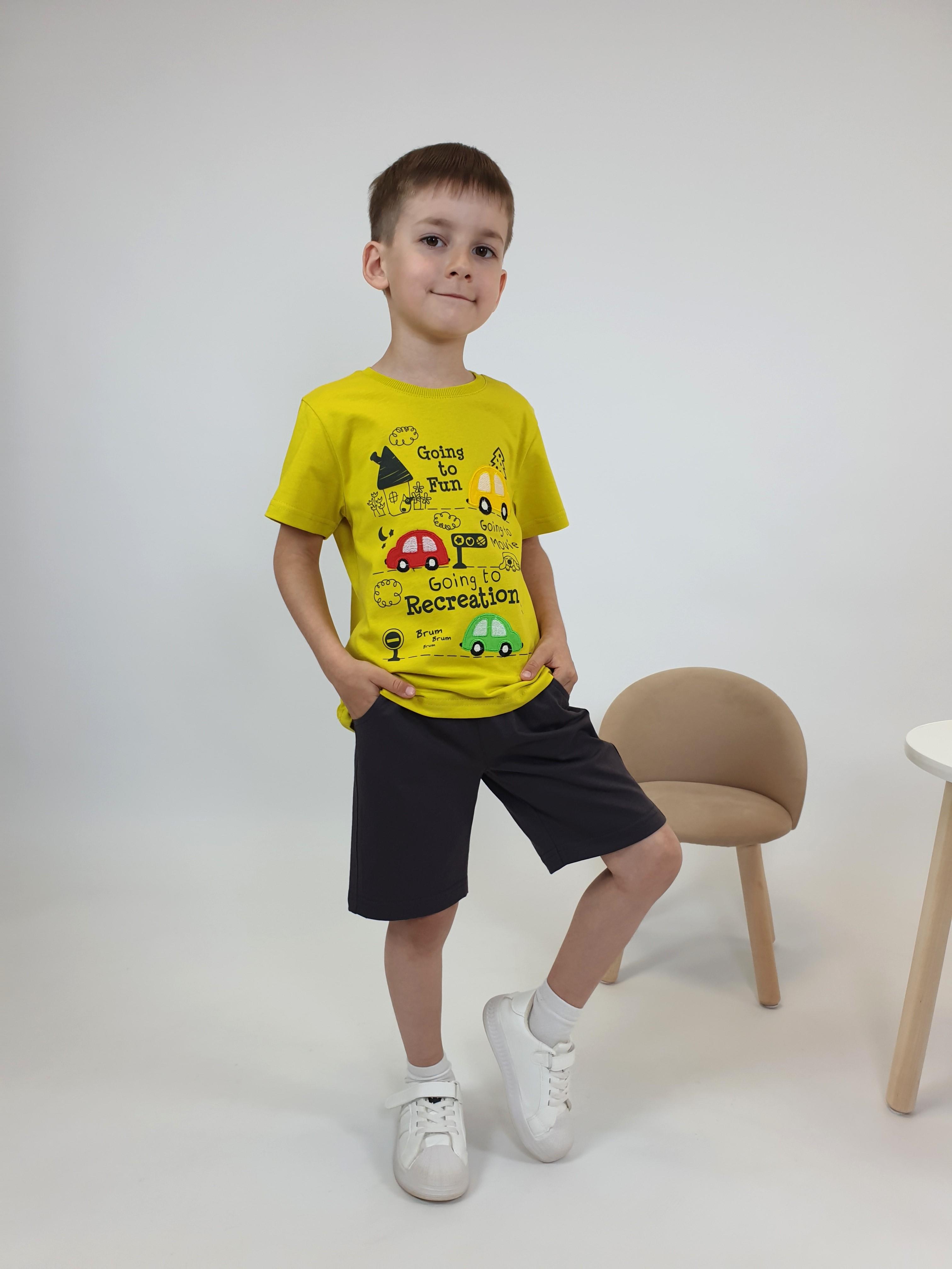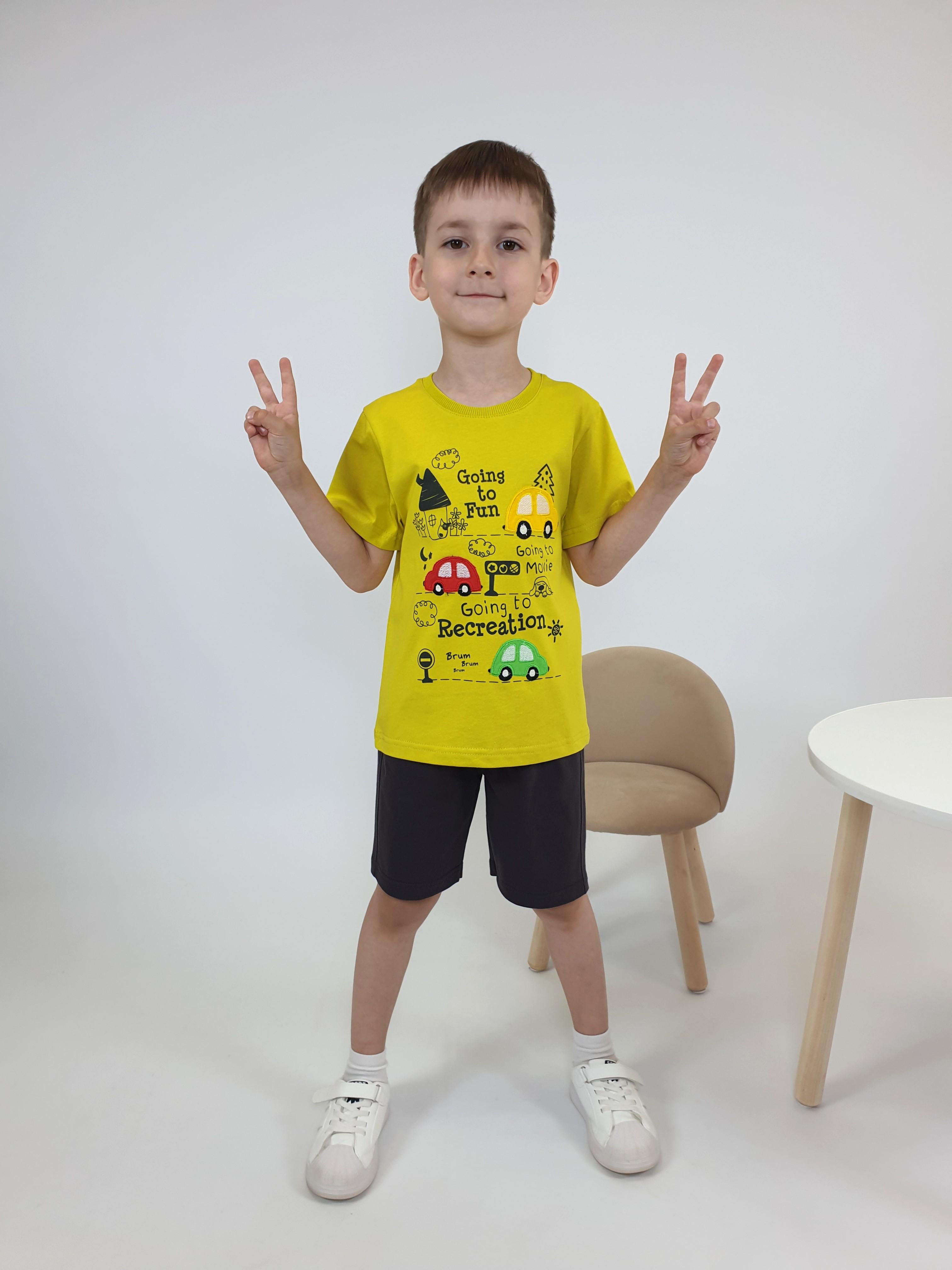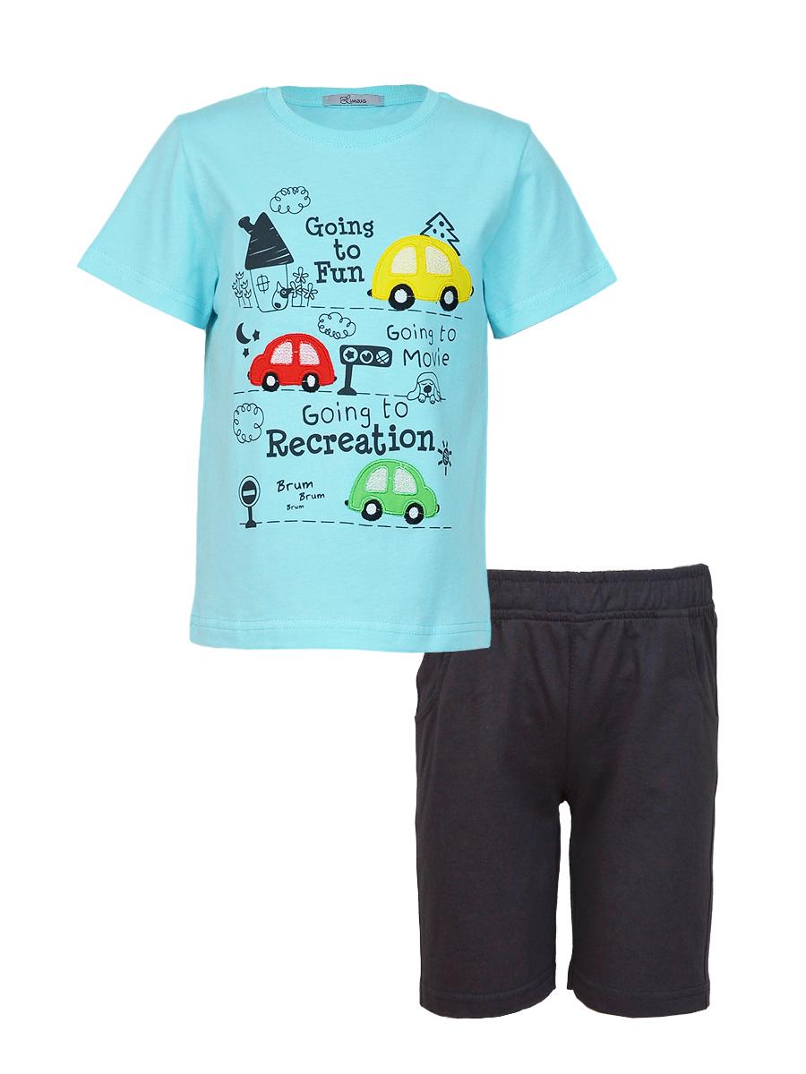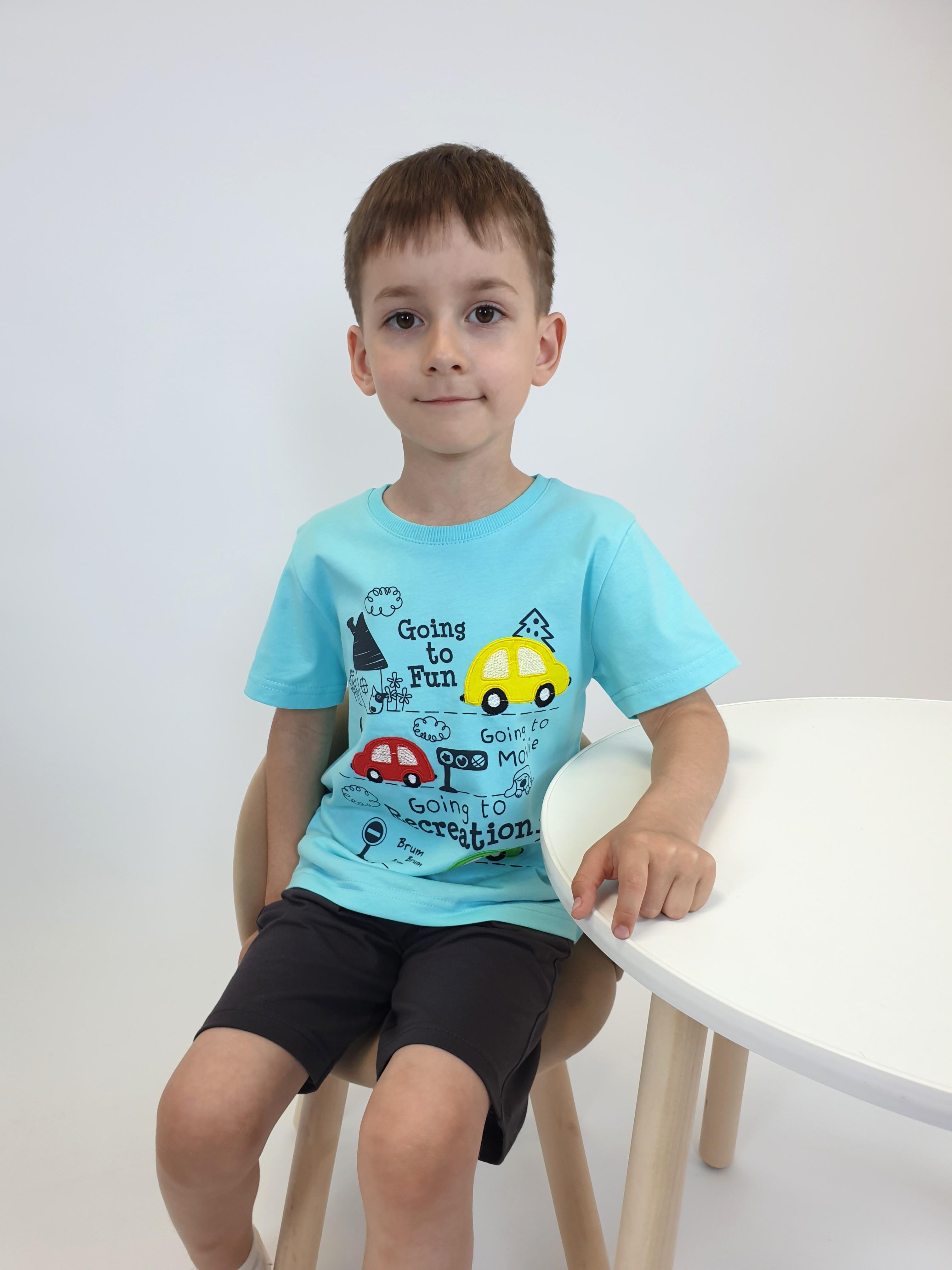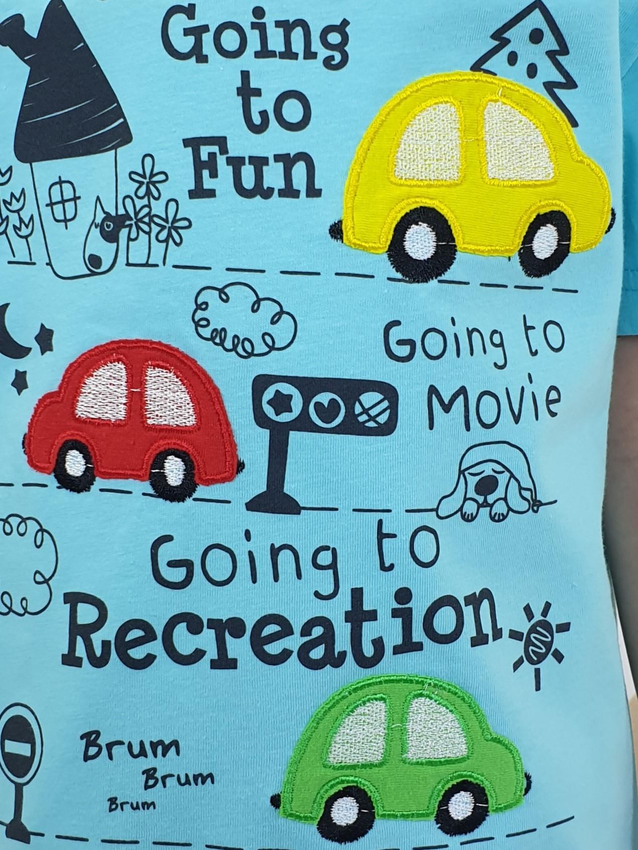 Кулирное полотно: 100% х/б. Фуфайка-прямая,перед с печатью и вышивкой(аппликацией).Рукав втачной,короткий.Горловина обработана ластиком. Шорты-укороченные с притачным поясом и резинкой.Два боковых кармана.
