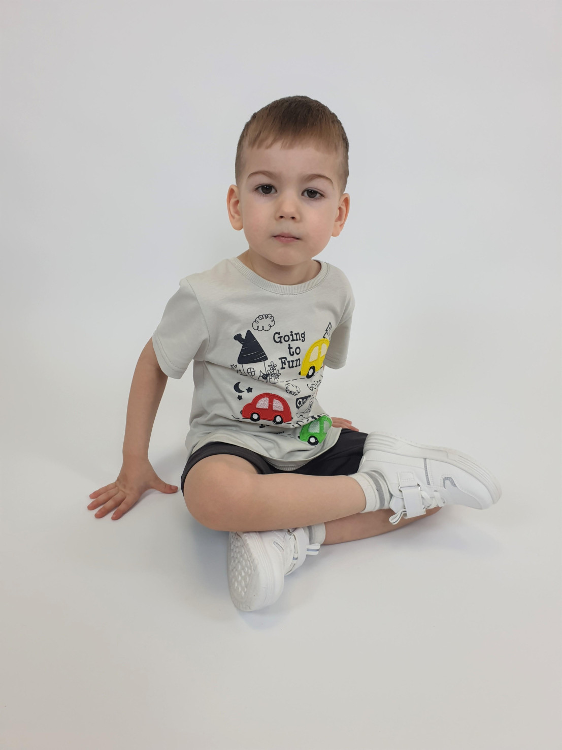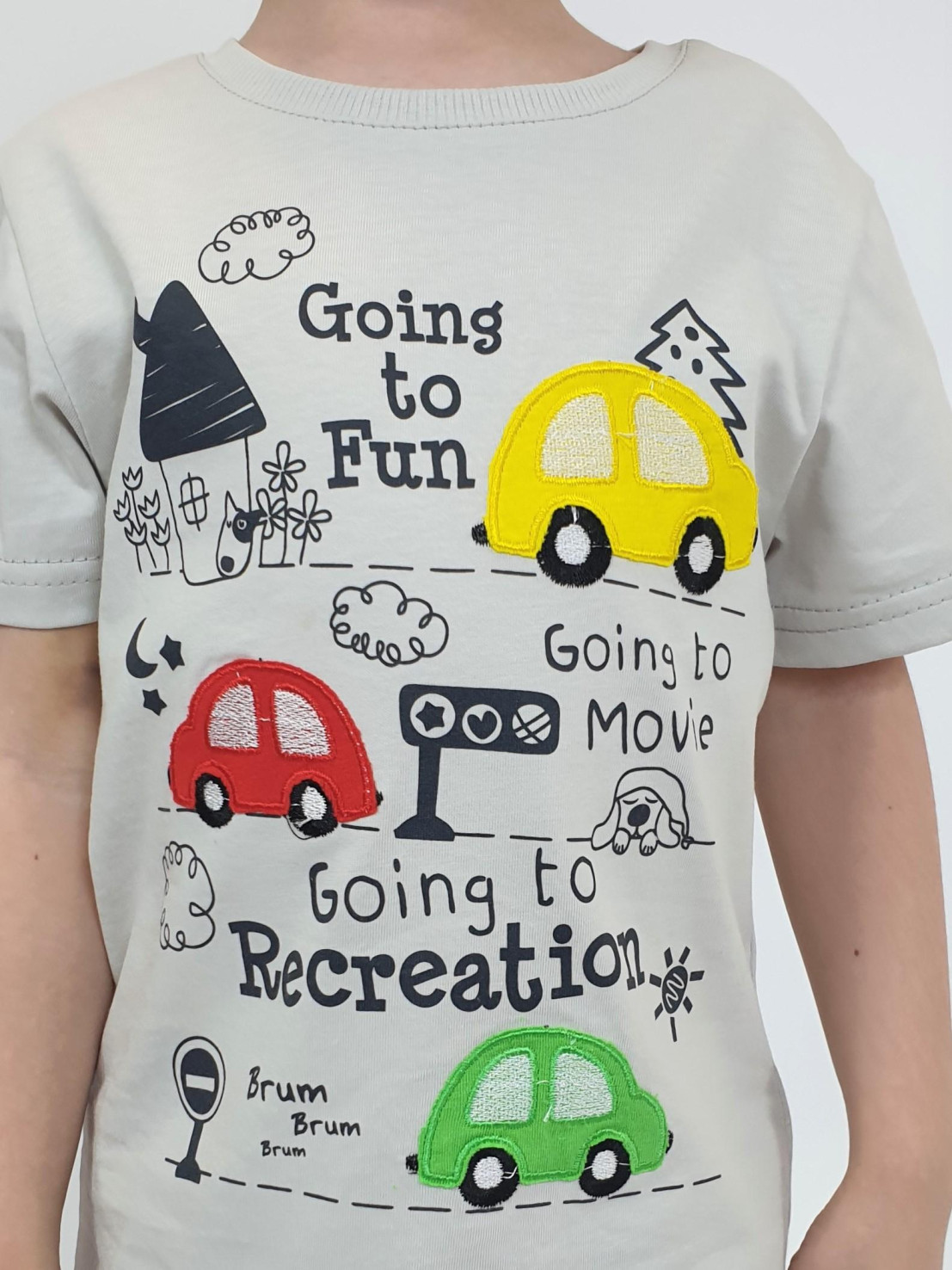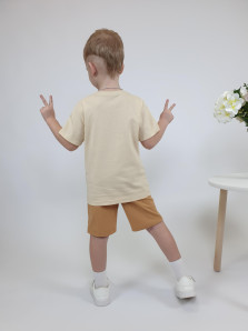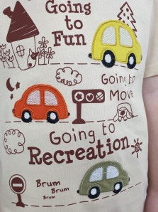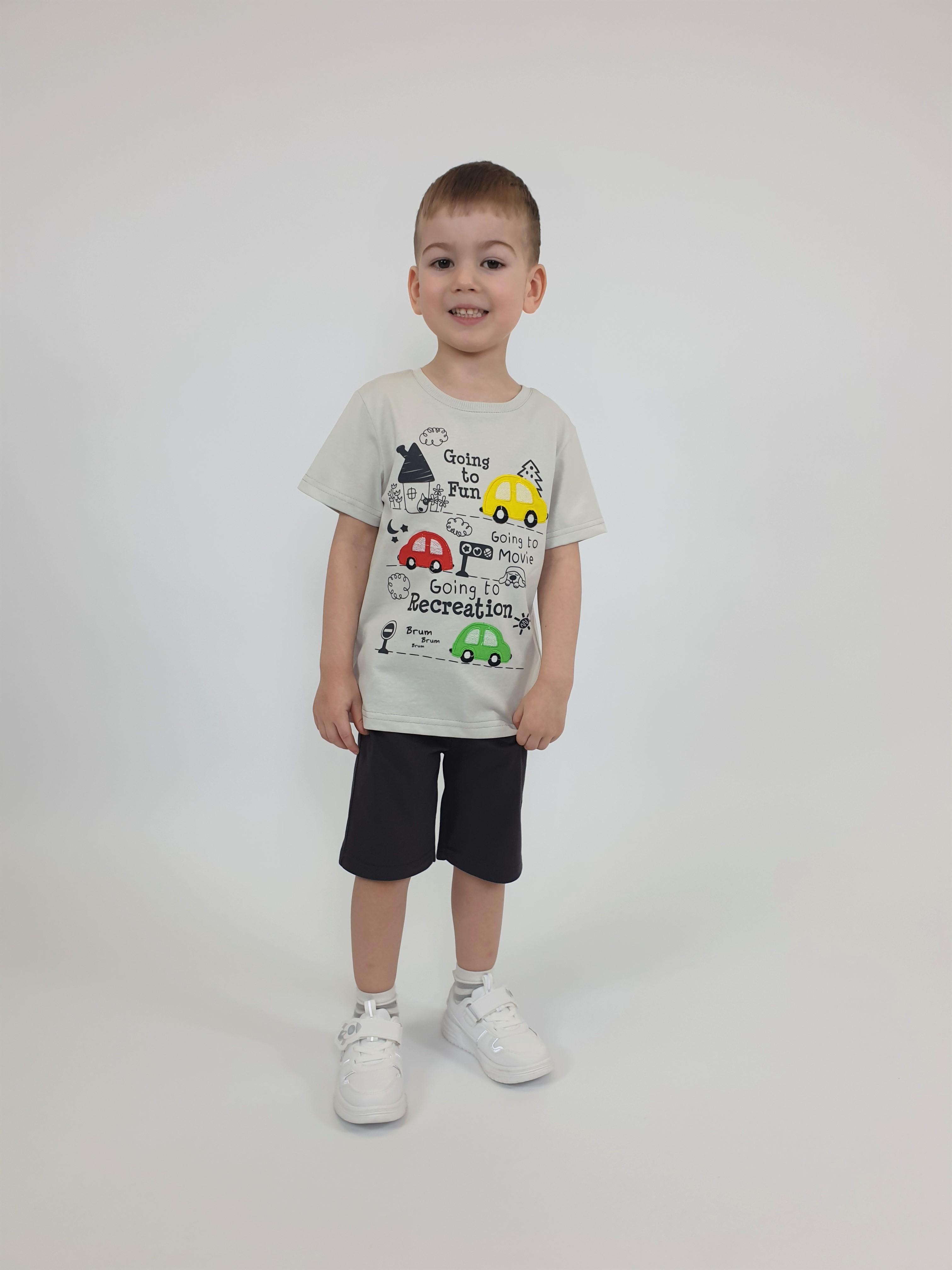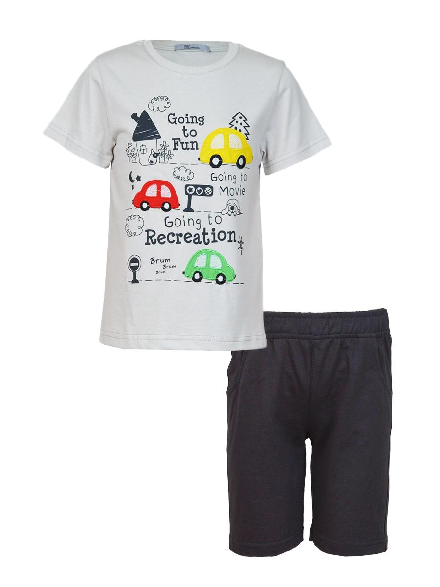 Кулирное полотно: 100% х/б. Фуфайка-прямая,перед с печатью и вышивкой(аппликацией).Рукав втачной,короткий.Горловина обработана ластиком. Шорты-укороченные с притачным поясом и резинкой.Два боковых кармана.