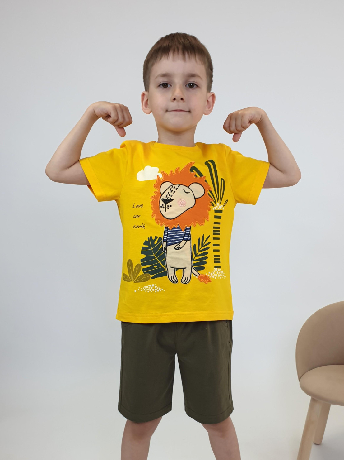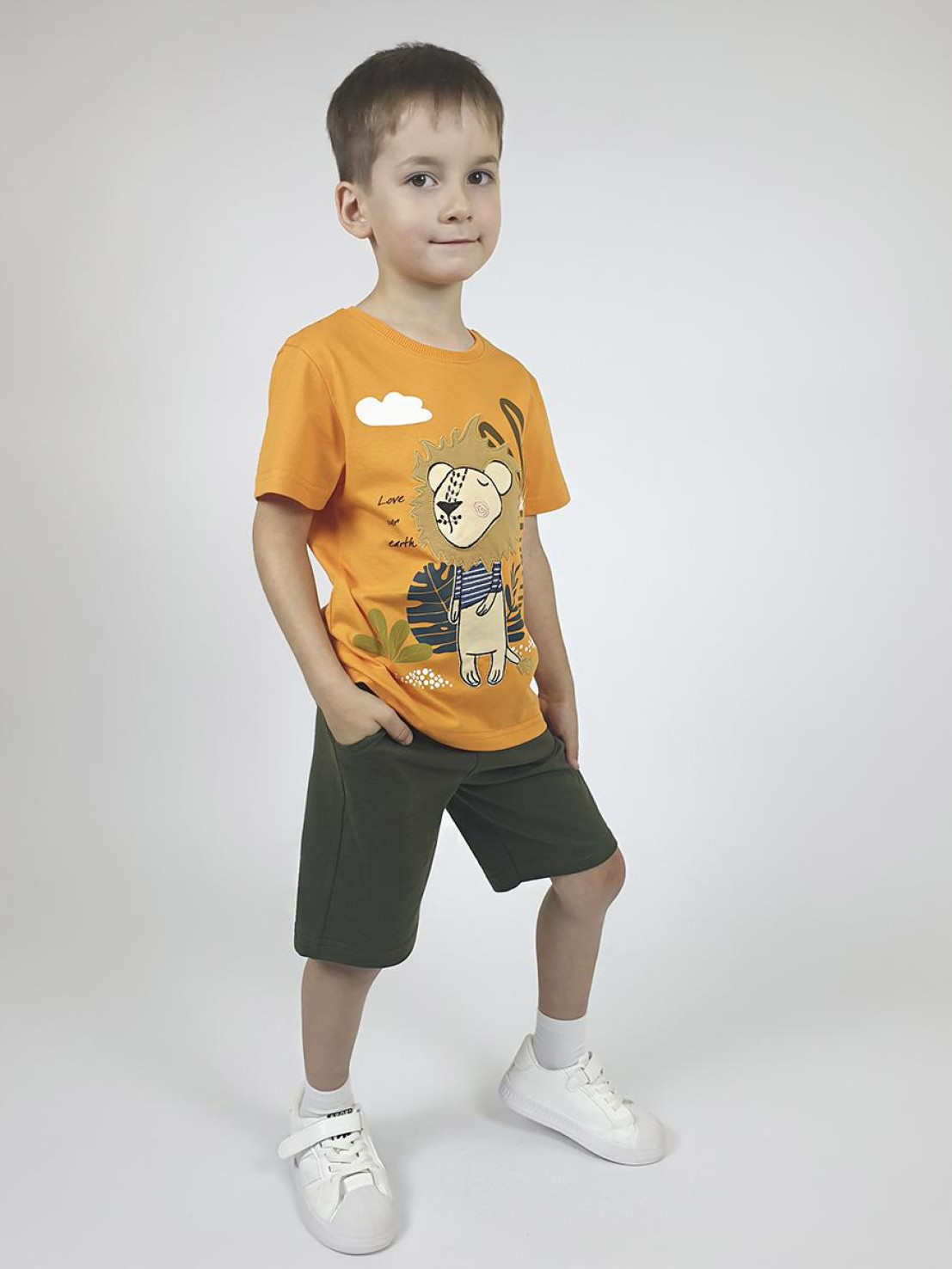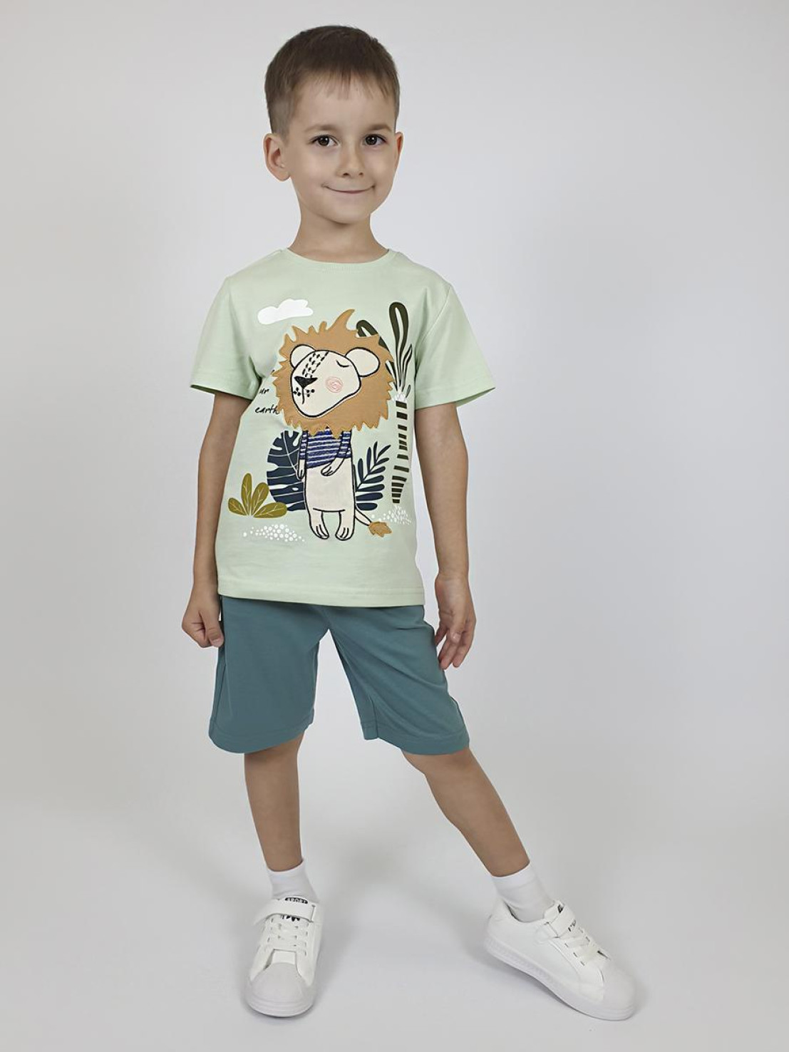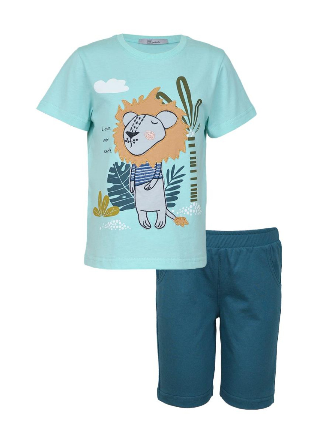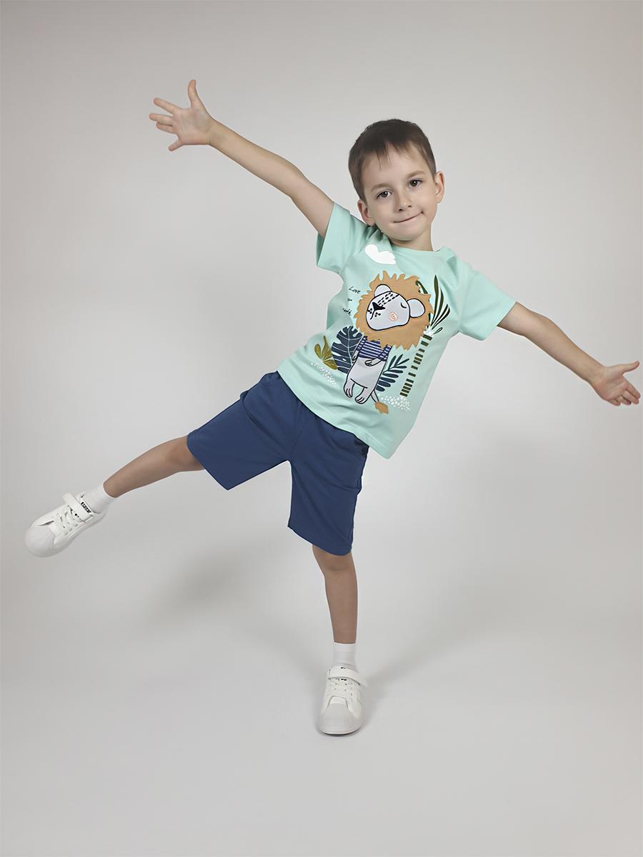 Кулирное полотно: 100% х/б. Фуфайка-прямая,перед и спинка с печатью.Вышивка(аппликация) на переде.Рукав втачной,короткий.Горловина обработана ластиком. Шорты-укороченные с притачным поясом и резинкой.Два боковых кармана по переду.