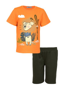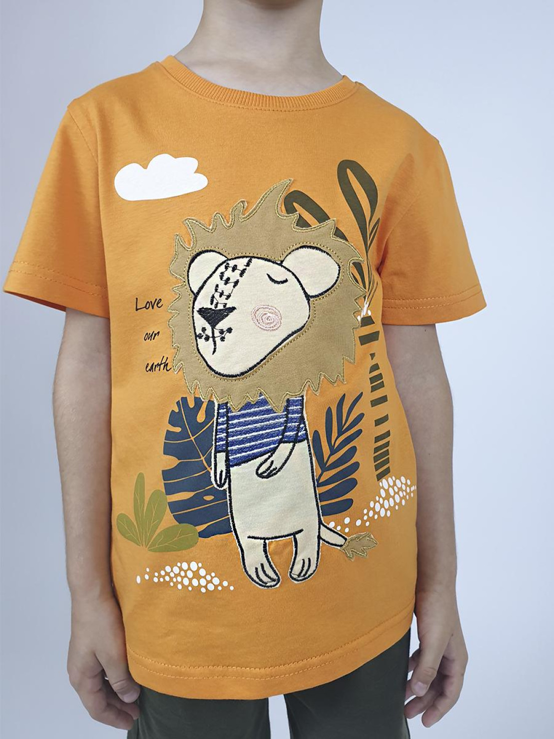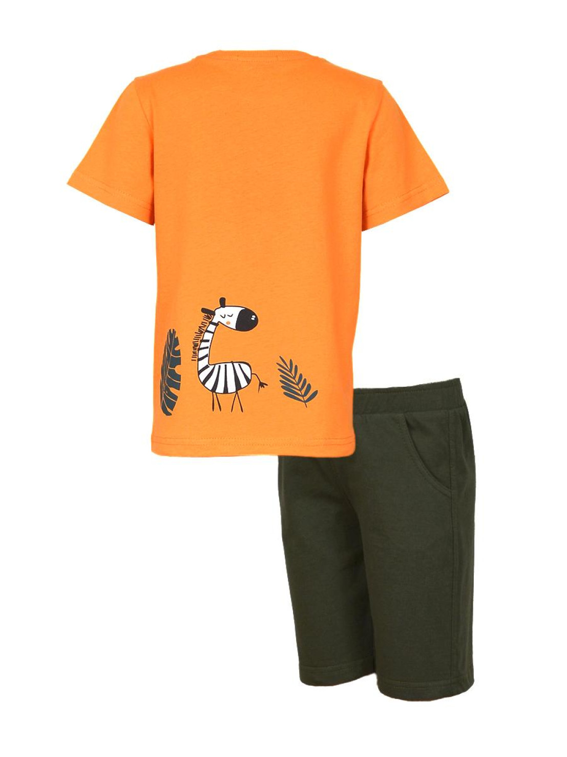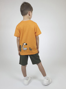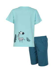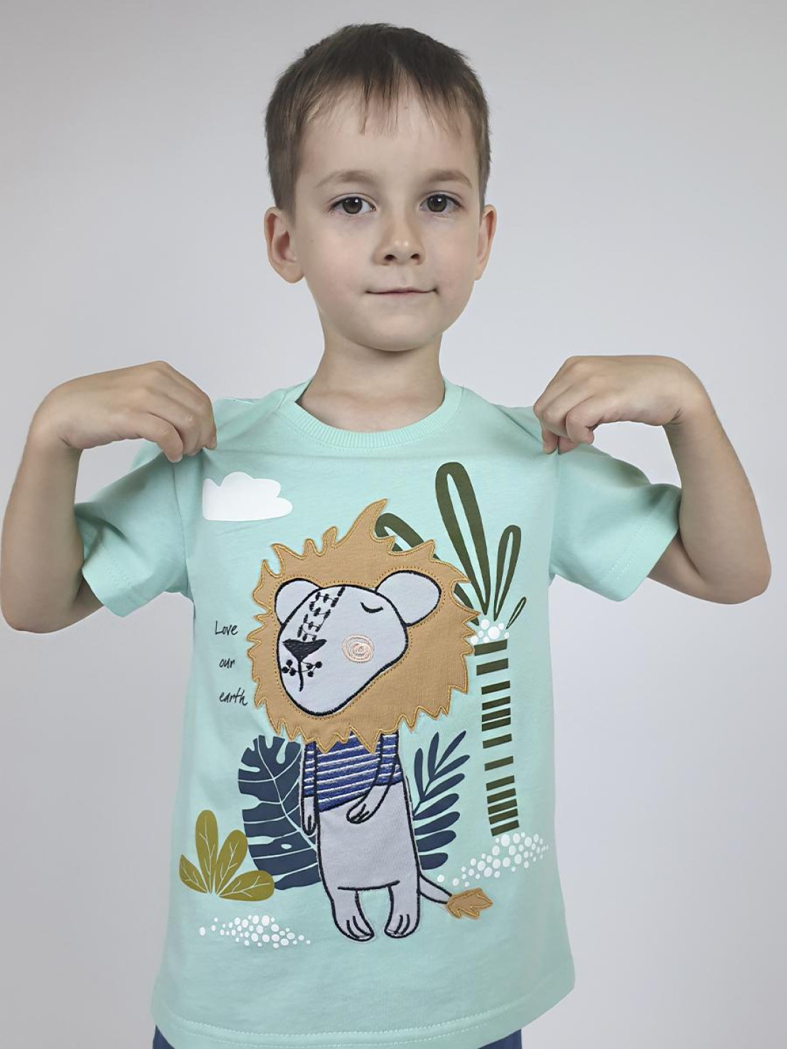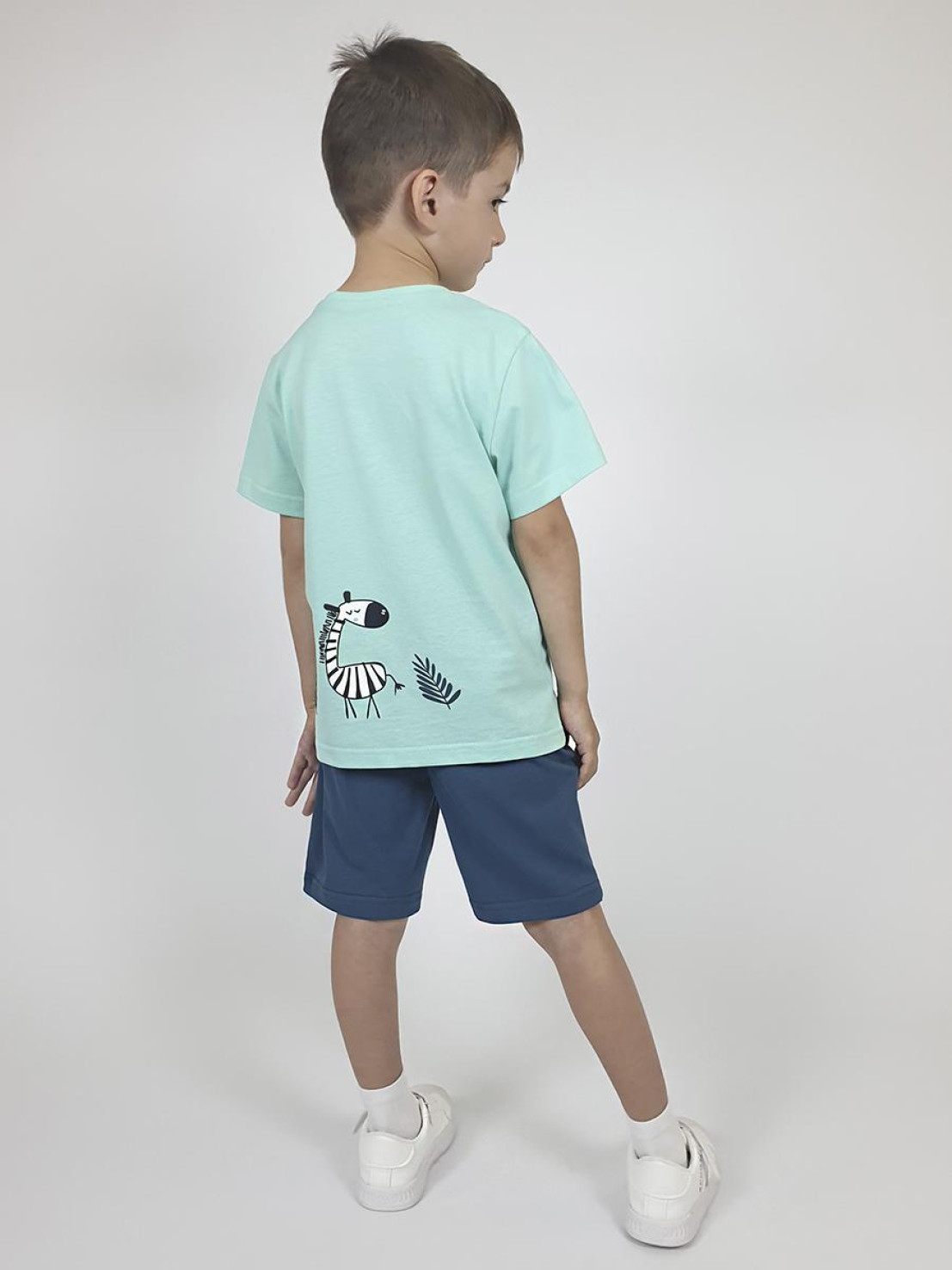 Кулирное полотно: 100% х/б. Фуфайка-прямая,перед и спинка с печатью.Вышивка(аппликация) на переде.Рукав втачной,короткий.Горловина обработана ластиком. Шорты-укороченные с притачным поясом и резинкой.Два боковых кармана по переду.