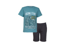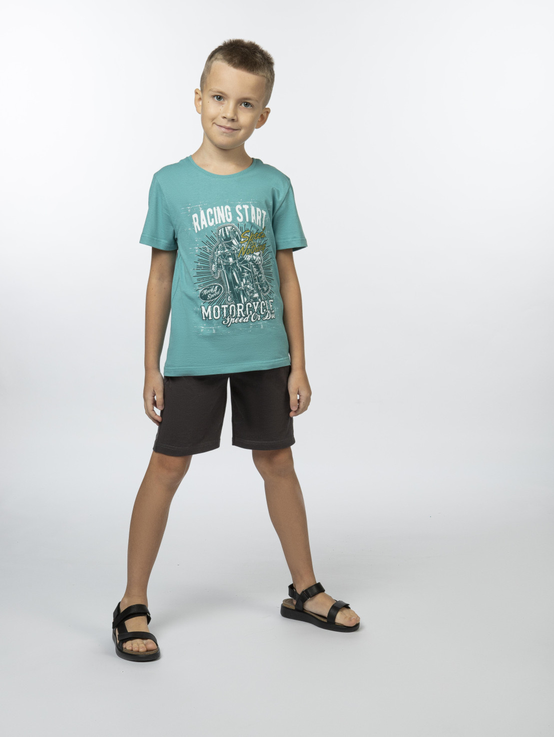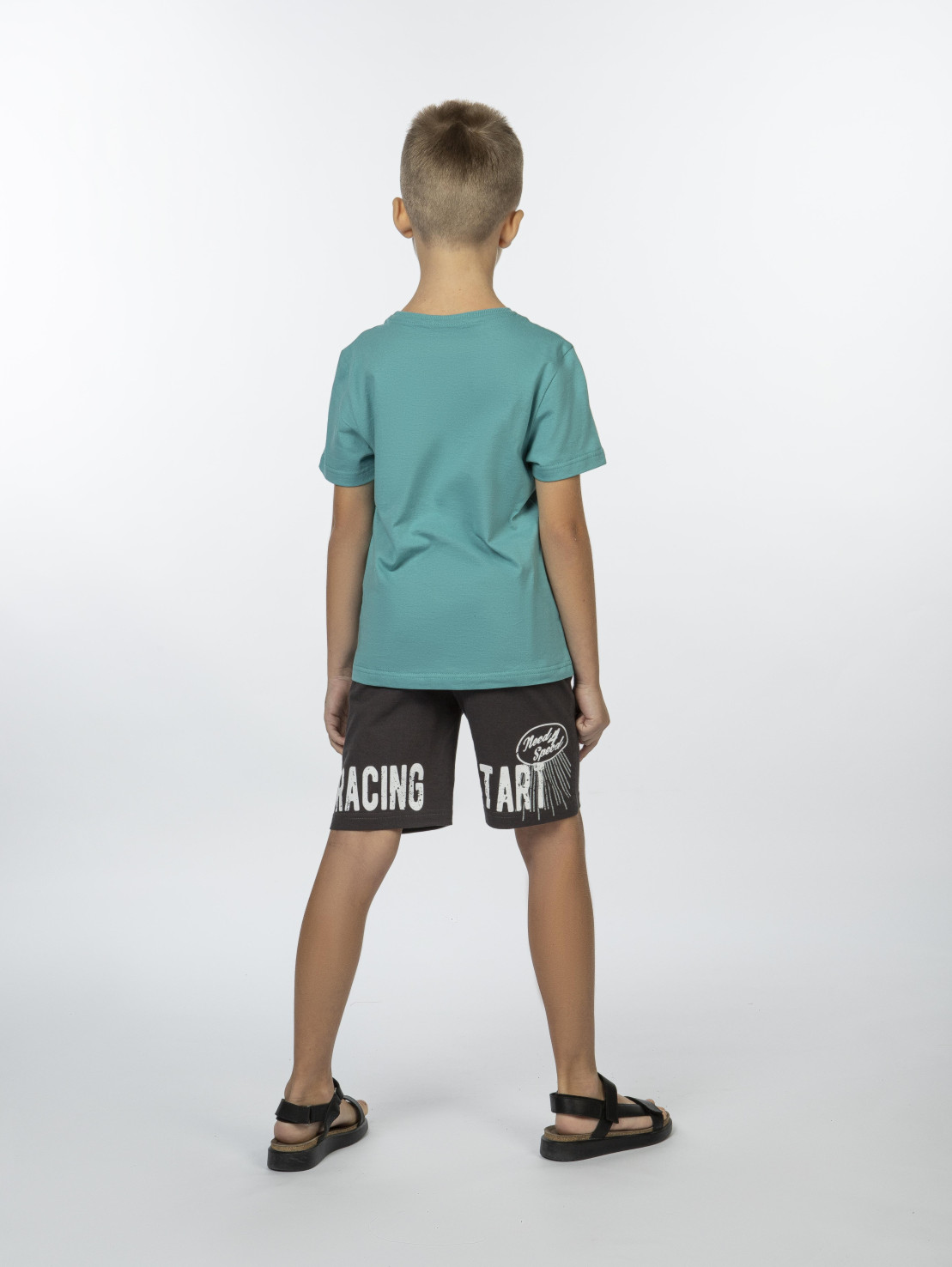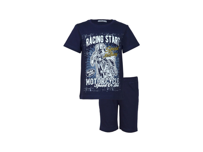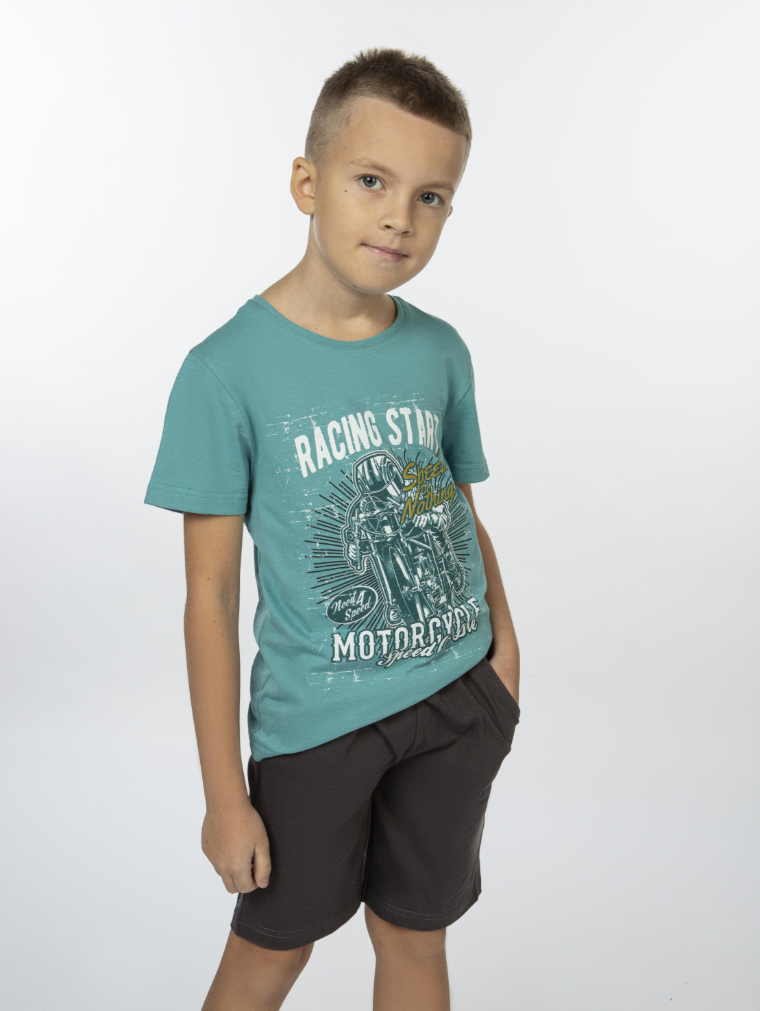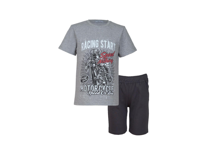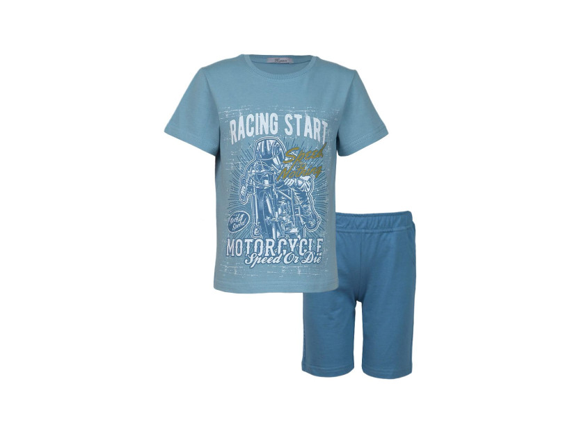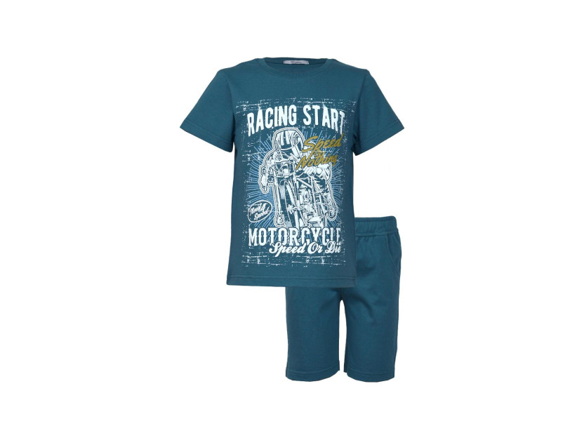 Кулирное полотно: 100% х/б. Фуфайка-прямая,короткий втачной рукав.Горловина обработана ластиком.Печать на переде. Шорты- укороченные с притачным поясом и резинкой.Два боковых кармана,печать на задних половинках внизу.