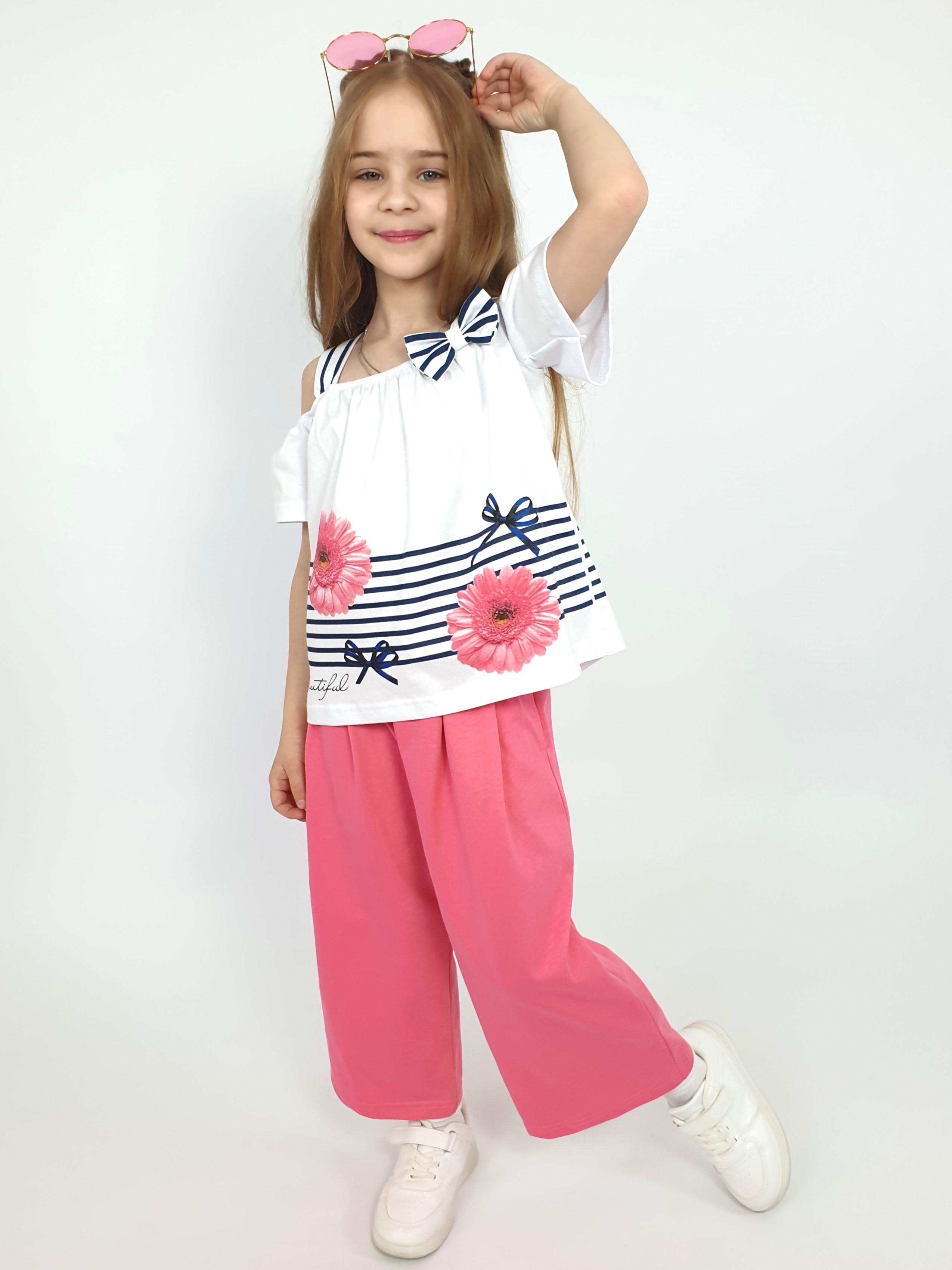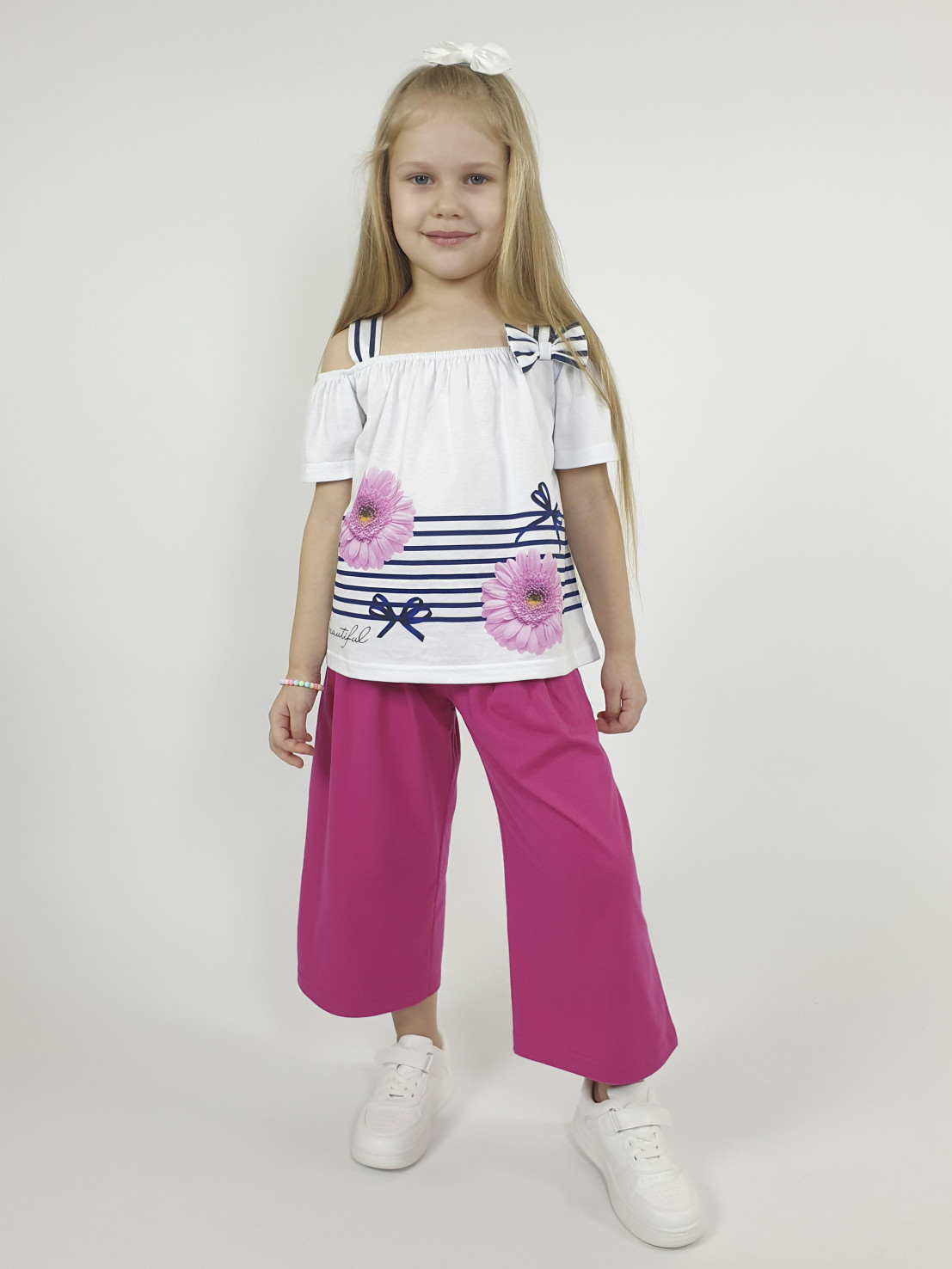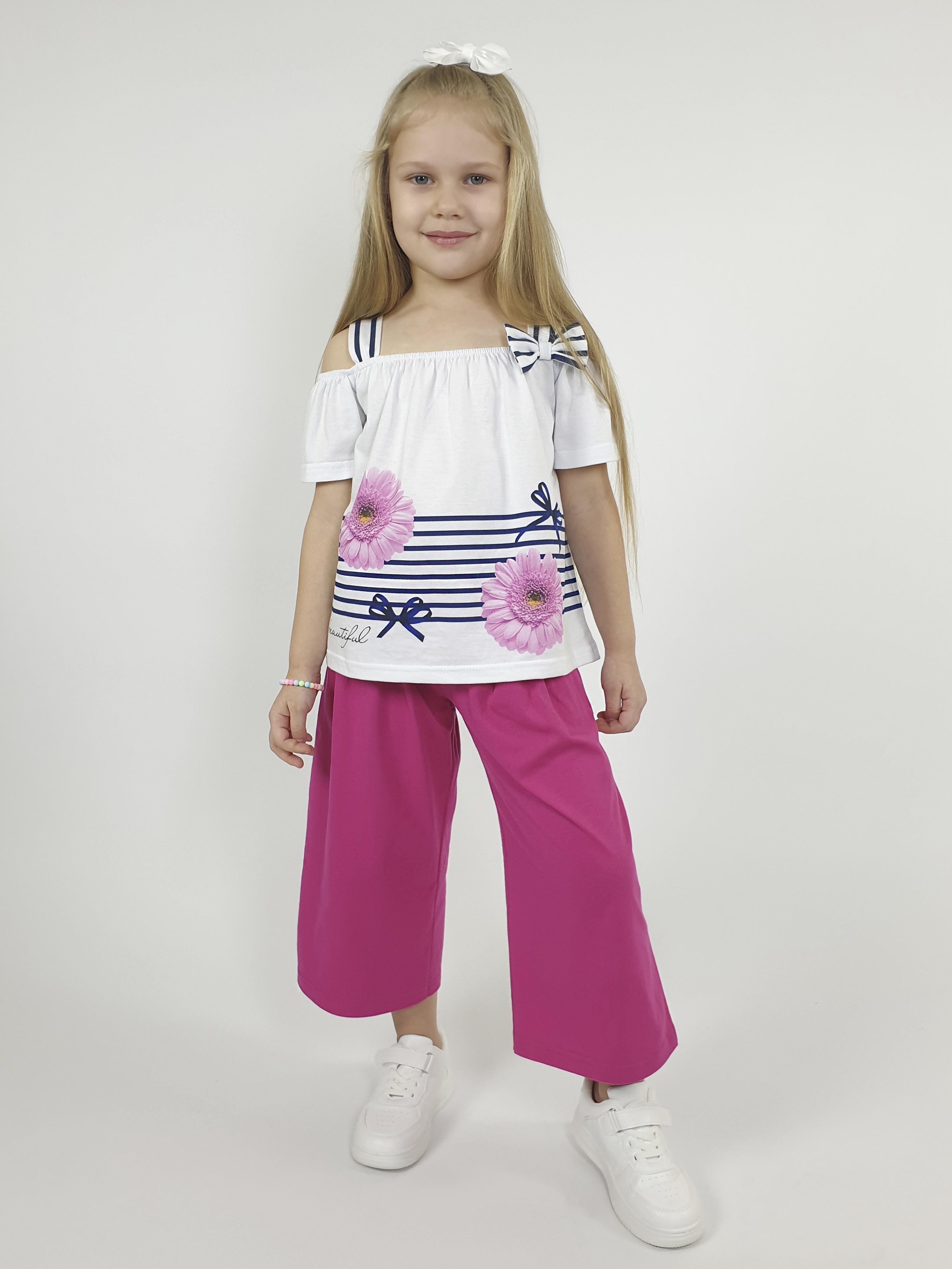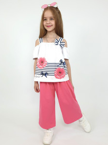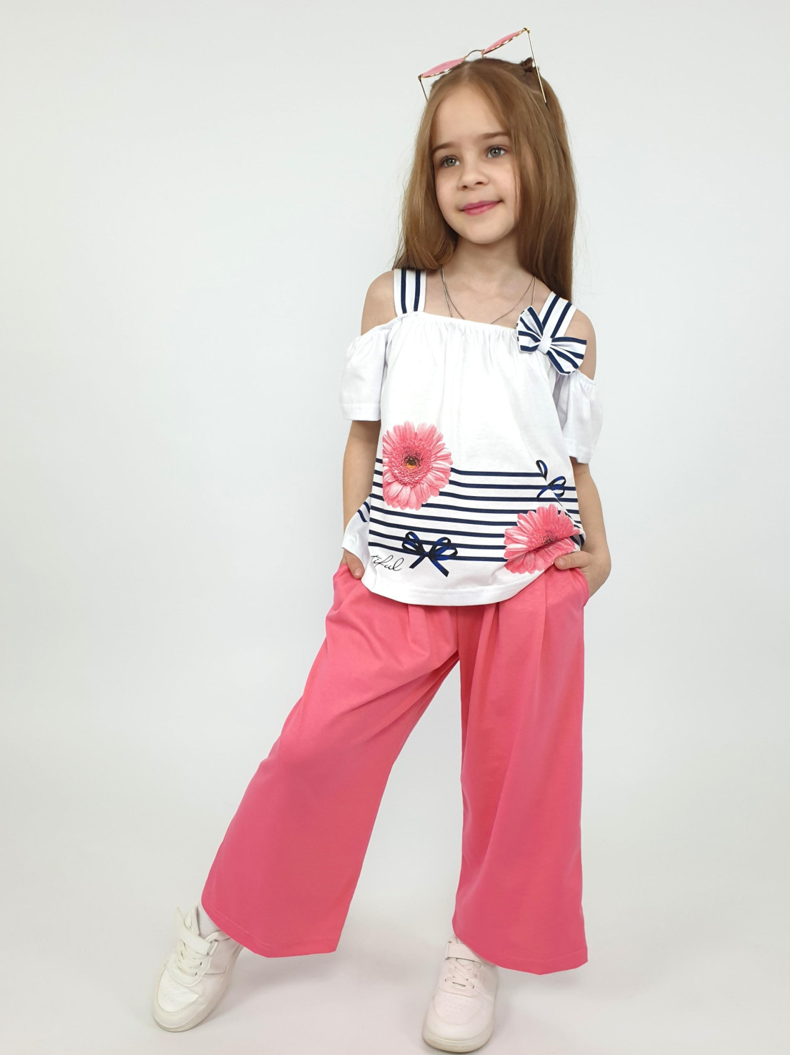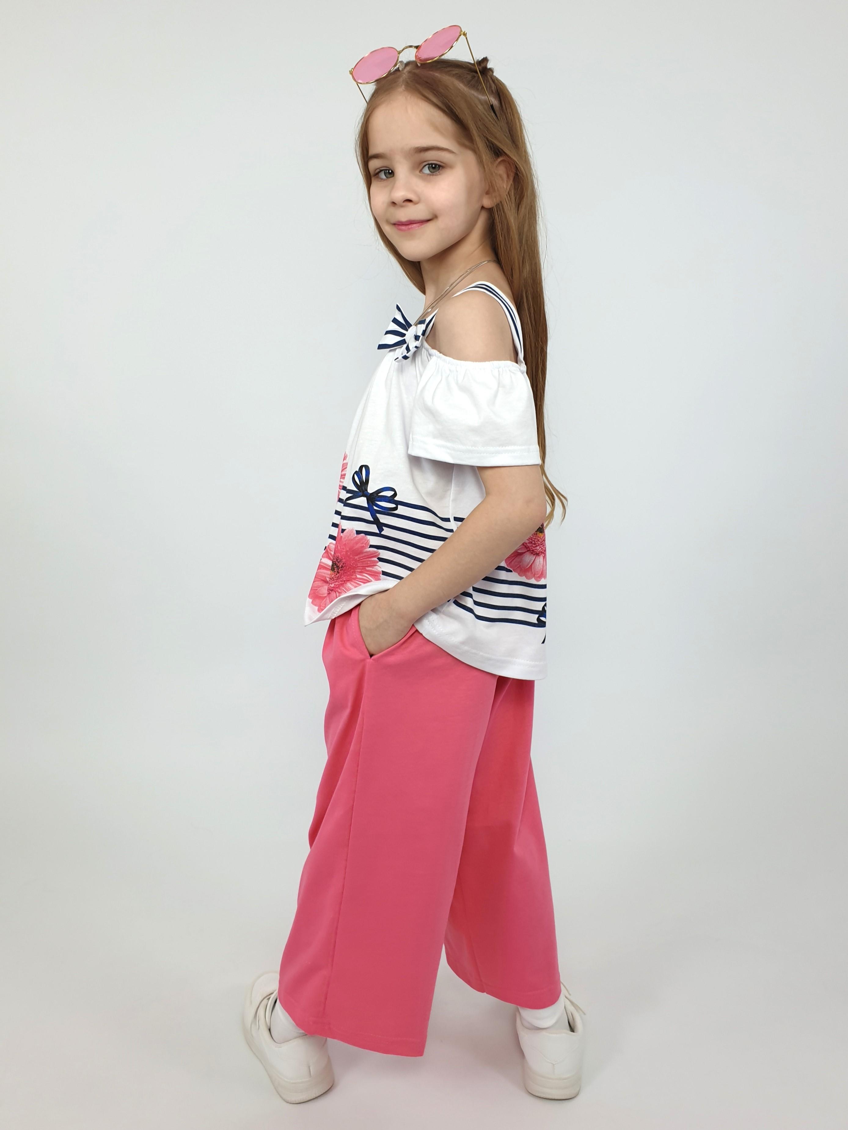 Комплект для девочки. Кулирное полотно: 100% х/б. Фуфайка-силуэт трапеция на бретелях,открытые плечи.Печать на переде,спинке,бретелях,банте.Вырез горловины обработан с резинкой. Отделочный бант с левой стороны.Низ изделия и рукава подшиты. Брюки-прямые,укороченные,мягкие встречные складки на переде.Притачной пояс с резинкой.