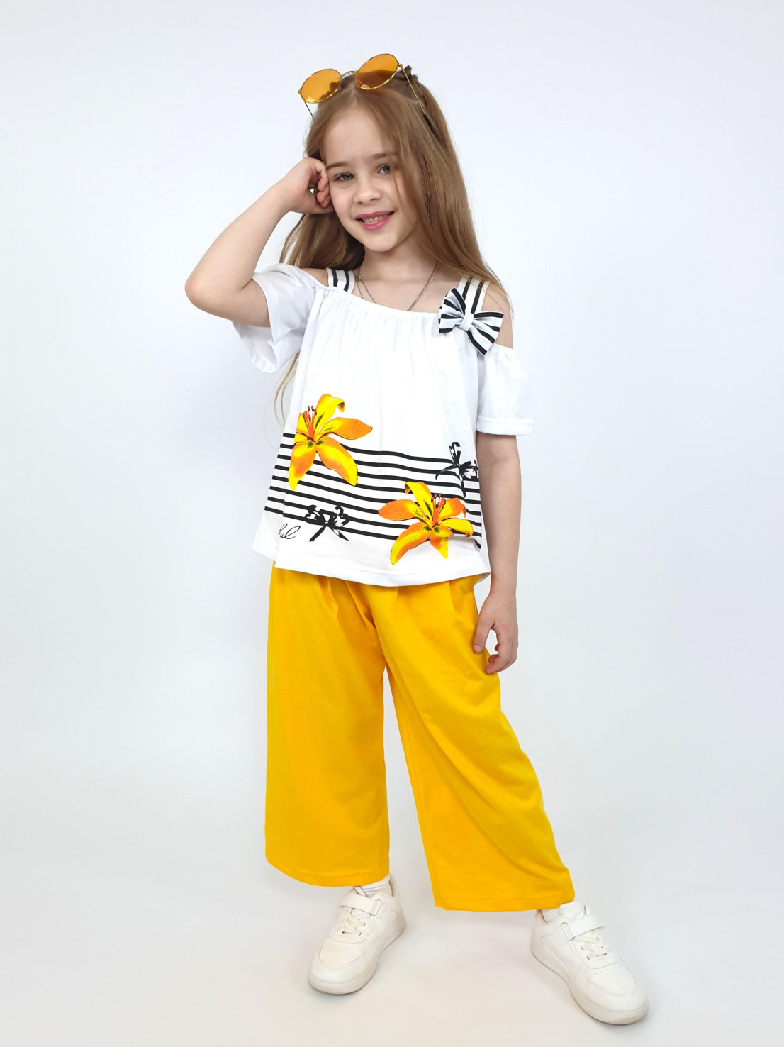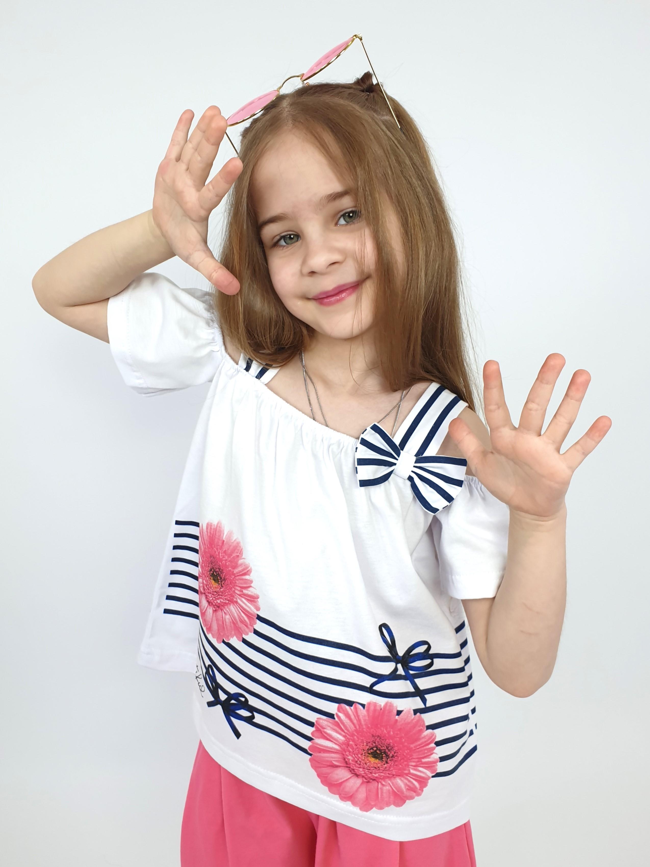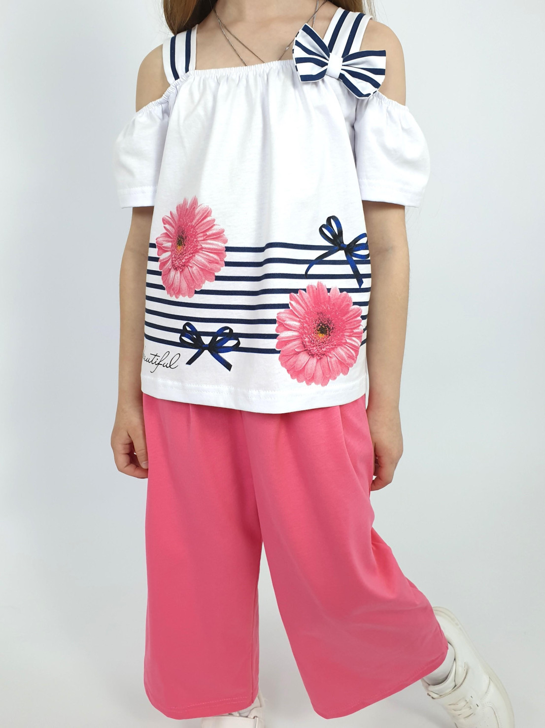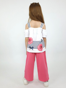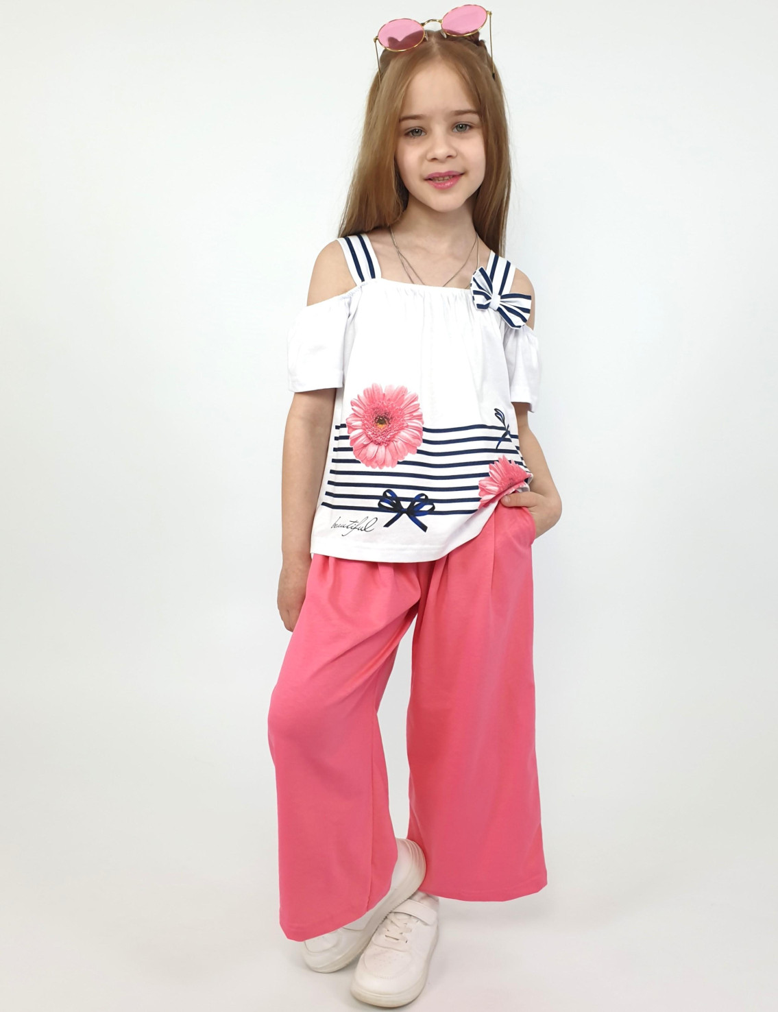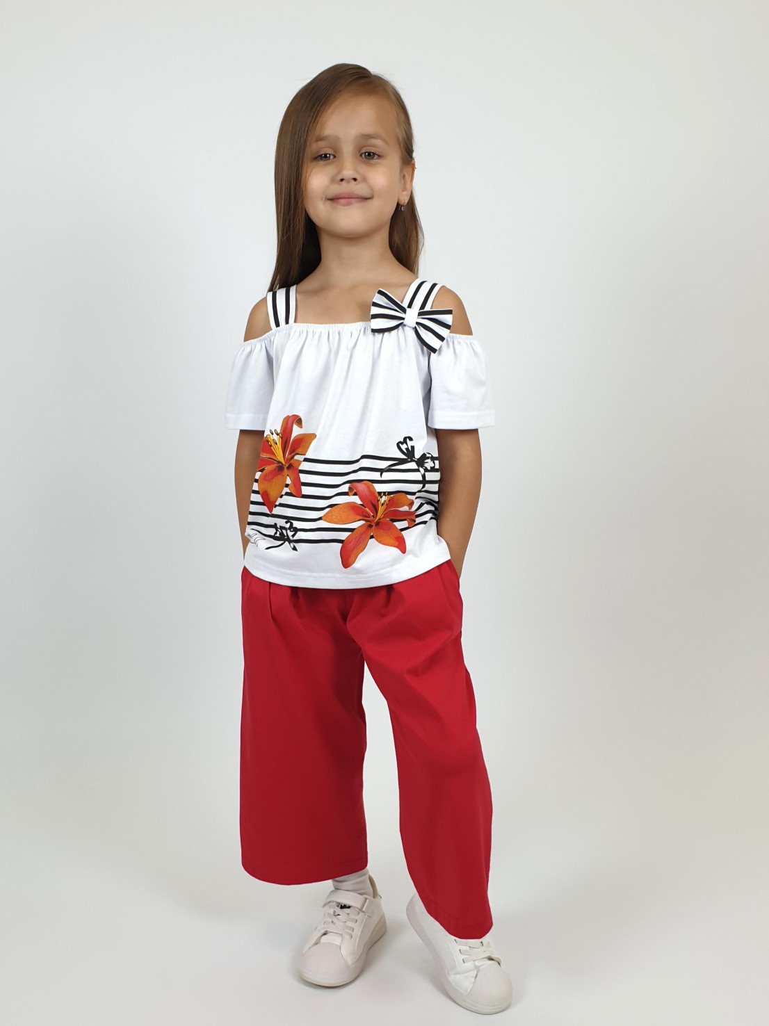 Комплект для девочки. Кулирное полотно: 100% х/б. Фуфайка-силуэт трапеция на бретелях,открытые плечи.Печать на переде,спинке,бретелях,банте.Вырез горловины обработан с резинкой. Отделочный бант с левой стороны.Низ изделия и рукава подшиты. Брюки-прямые,укороченные,мягкие встречные складки на переде.Притачной пояс с резинкой.