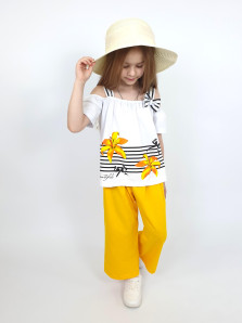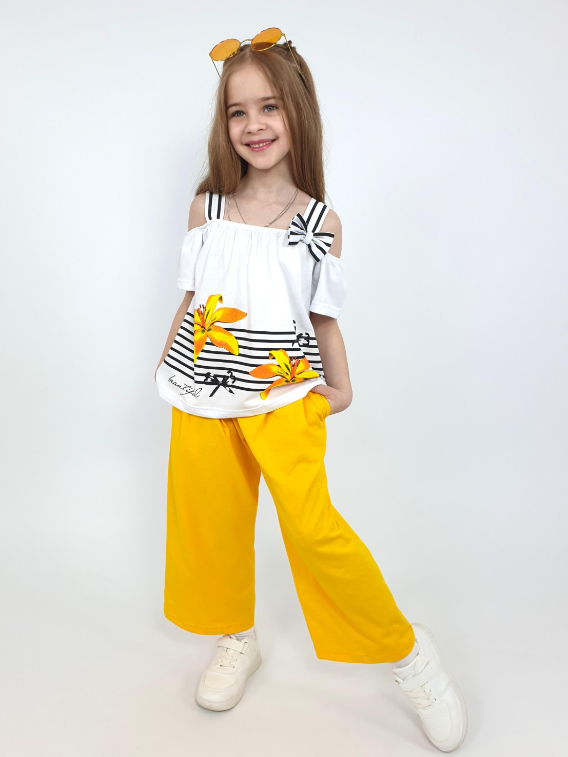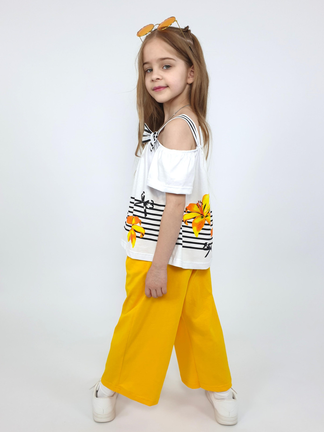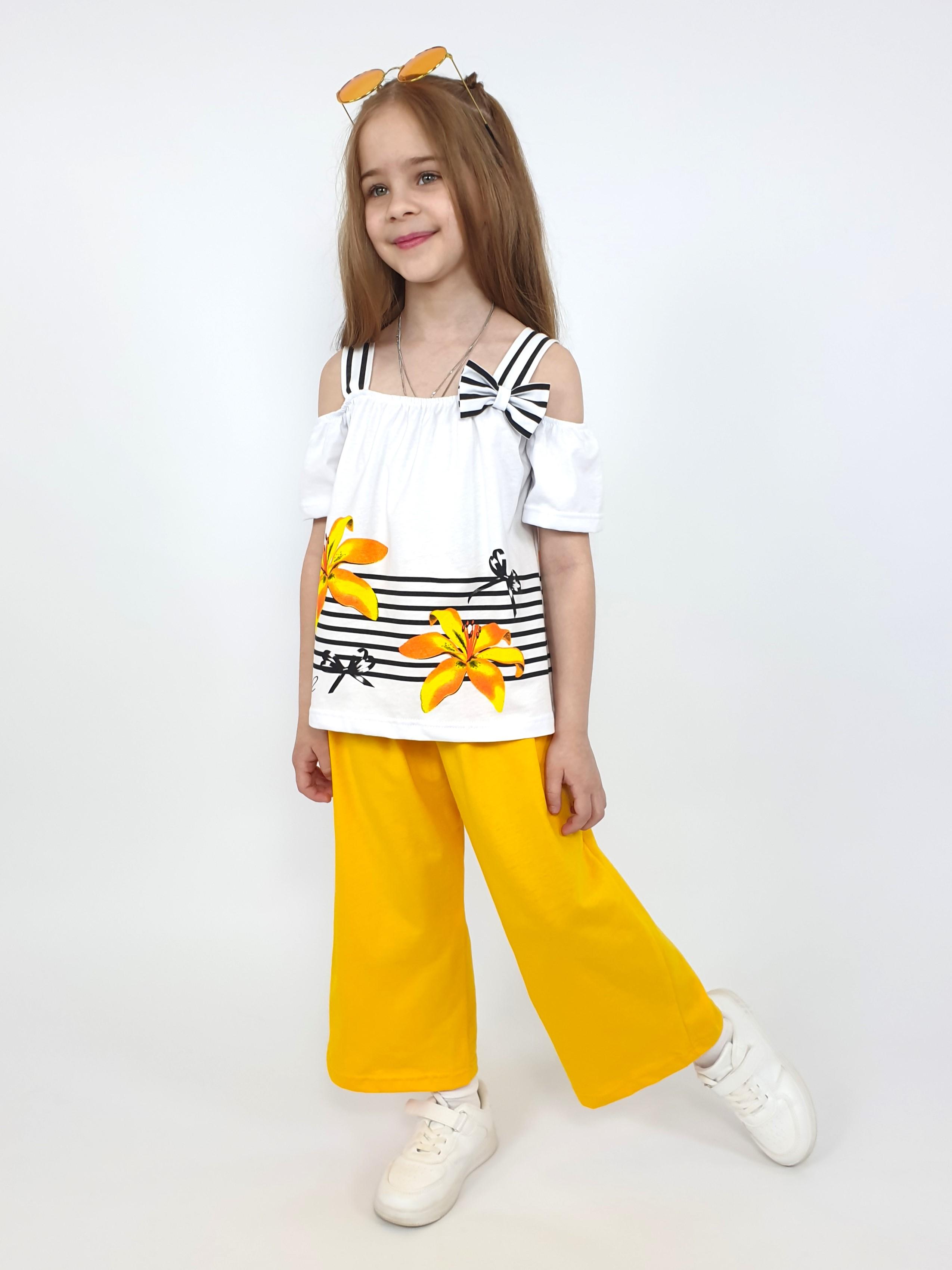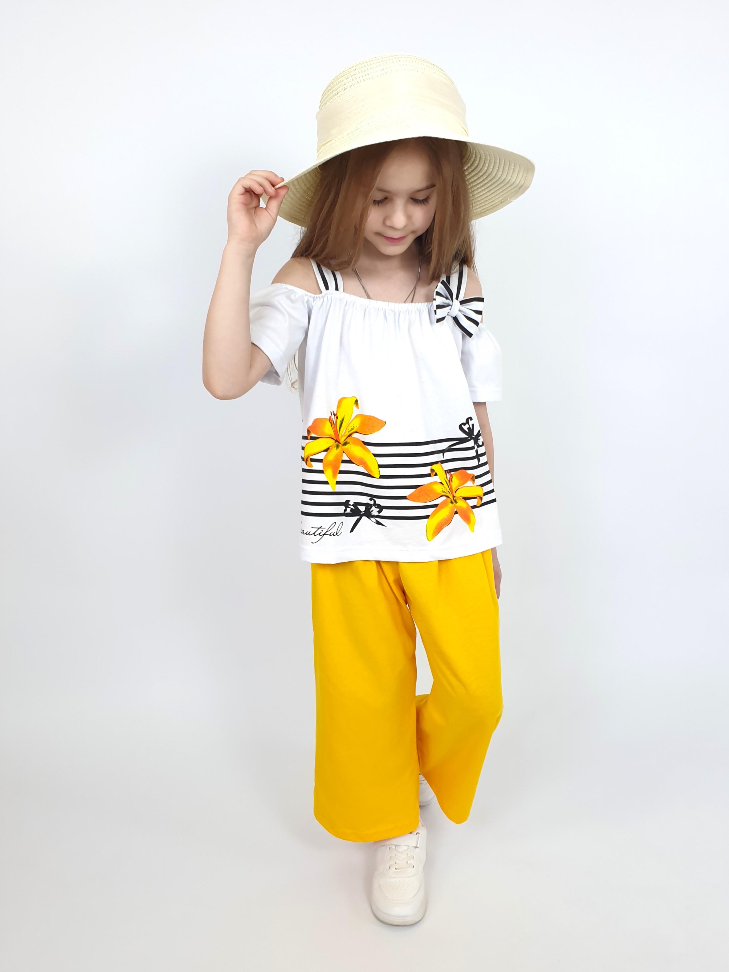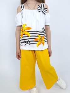 Комплект для девочки. Кулирное полотно: 100% х/б. Фуфайка-силуэт трапеция на бретелях,открытые плечи.Печать на переде,спинке,бретелях,банте.Вырез горловины обработан с резинкой. Отделочный бант с левой стороны.Низ изделия и рукава подшиты. Брюки-прямые,укороченные,мягкие встречные складки на переде.Притачной пояс с резинкой.