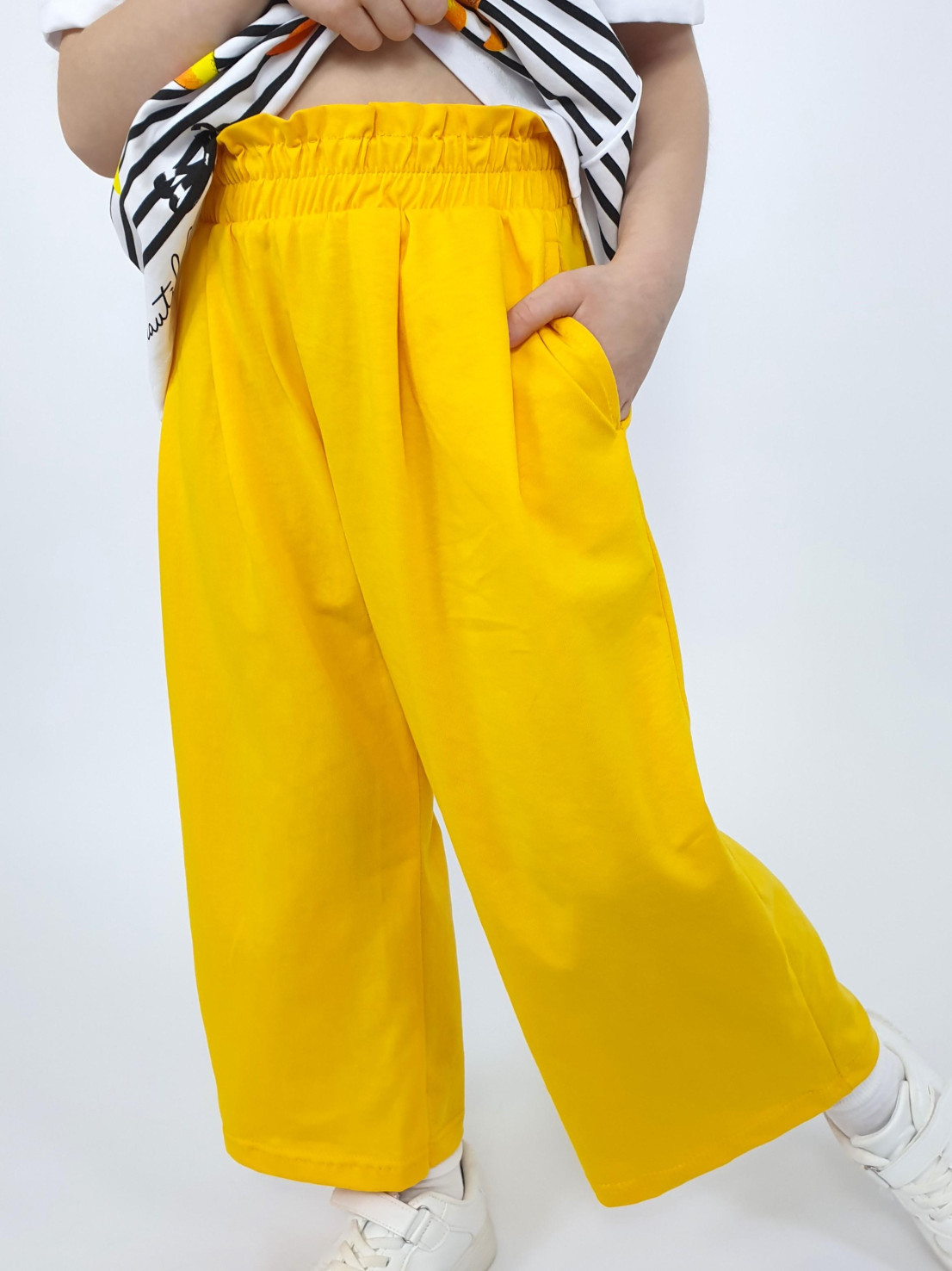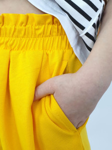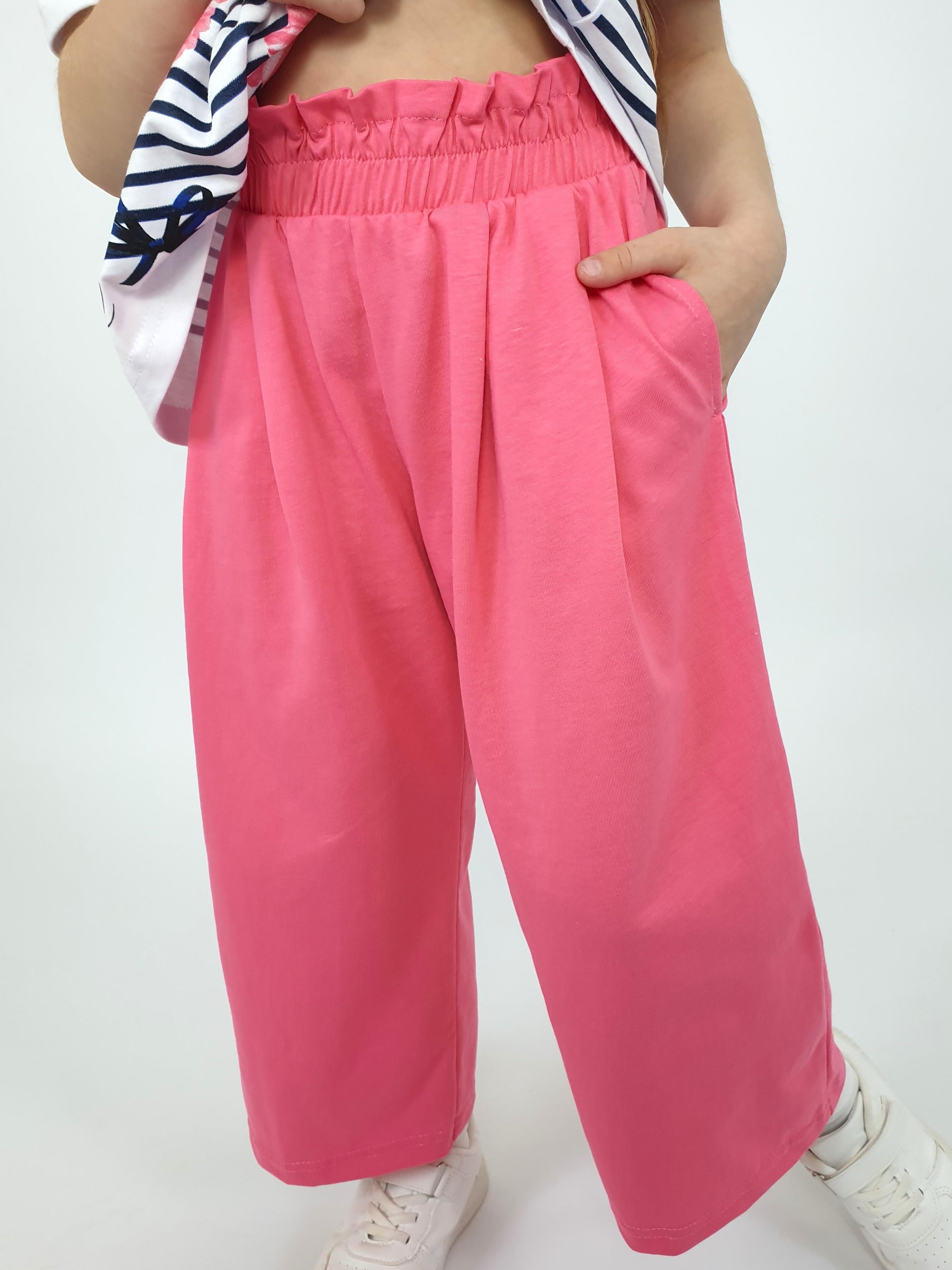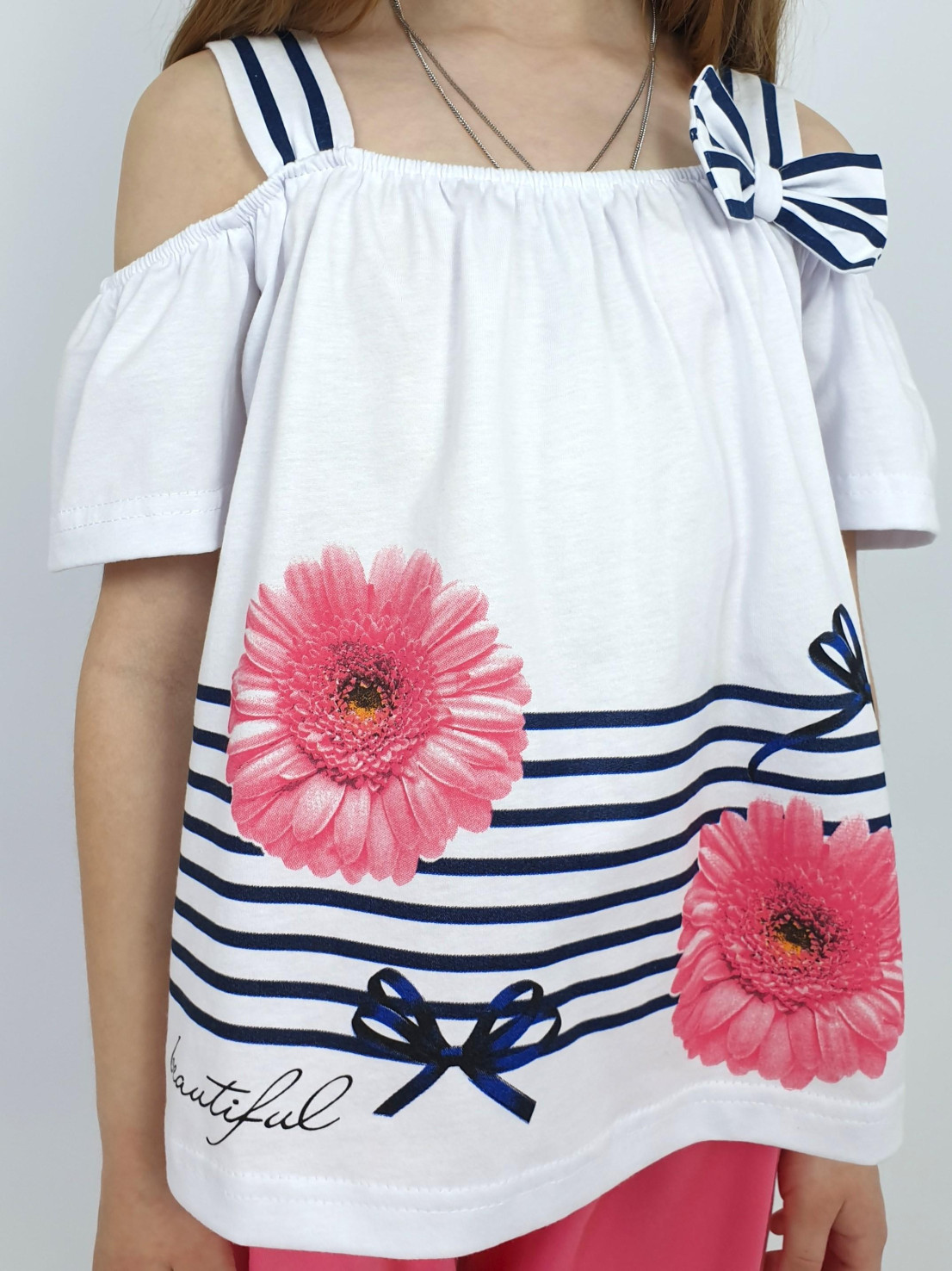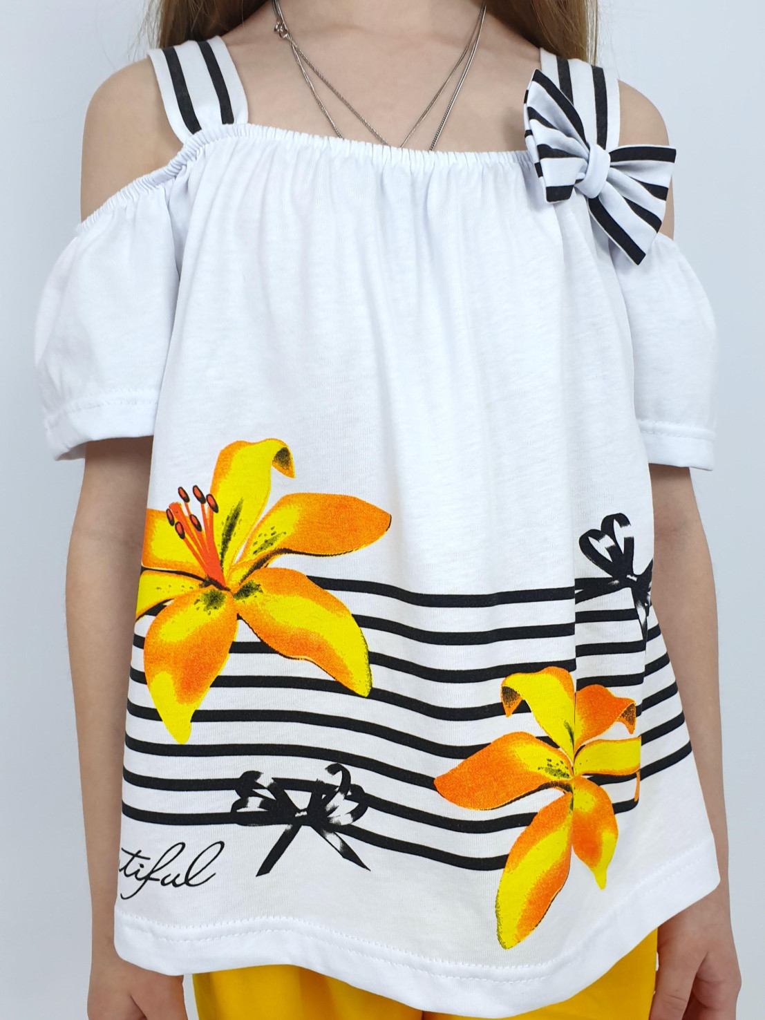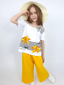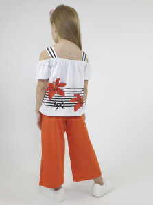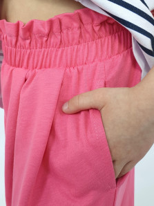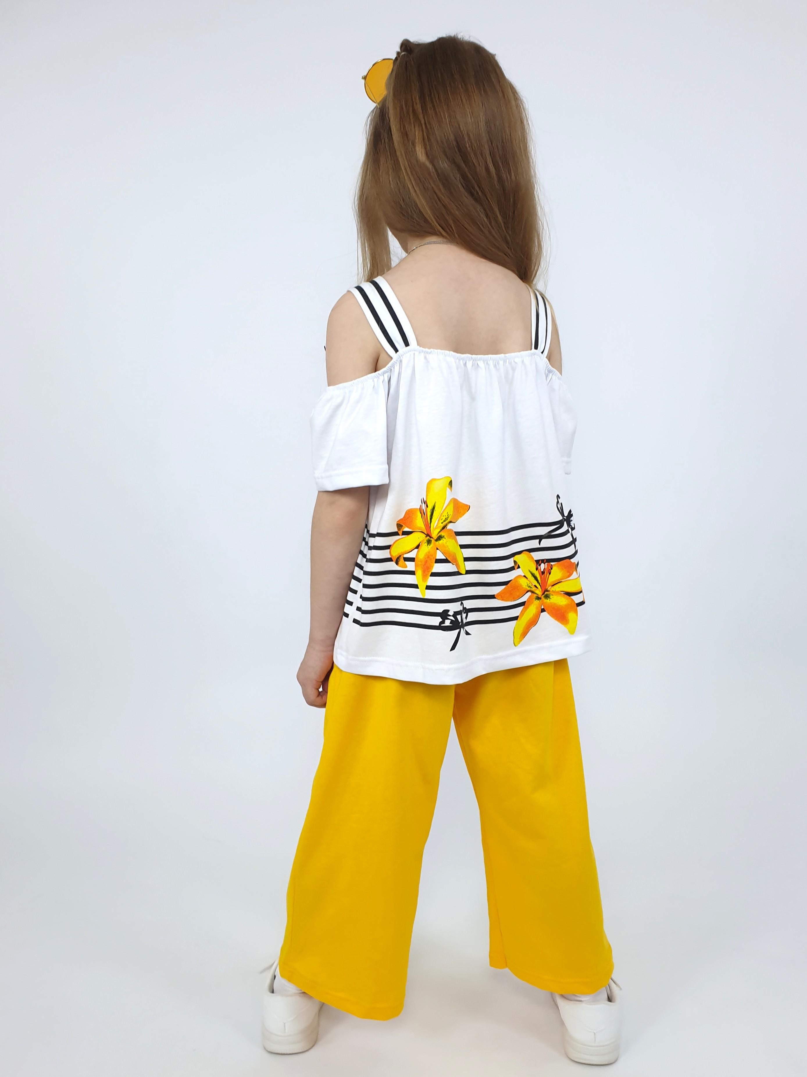 Комплект для девочки. Кулирное полотно: 100% х/б. Фуфайка-силуэт трапеция на бретелях,открытые плечи.Печать на переде,спинке,бретелях,банте.Вырез горловины обработан с резинкой. Отделочный бант с левой стороны.Низ изделия и рукава подшиты. Брюки-прямые,укороченные,мягкие встречные складки на переде.Притачной пояс с резинкой.