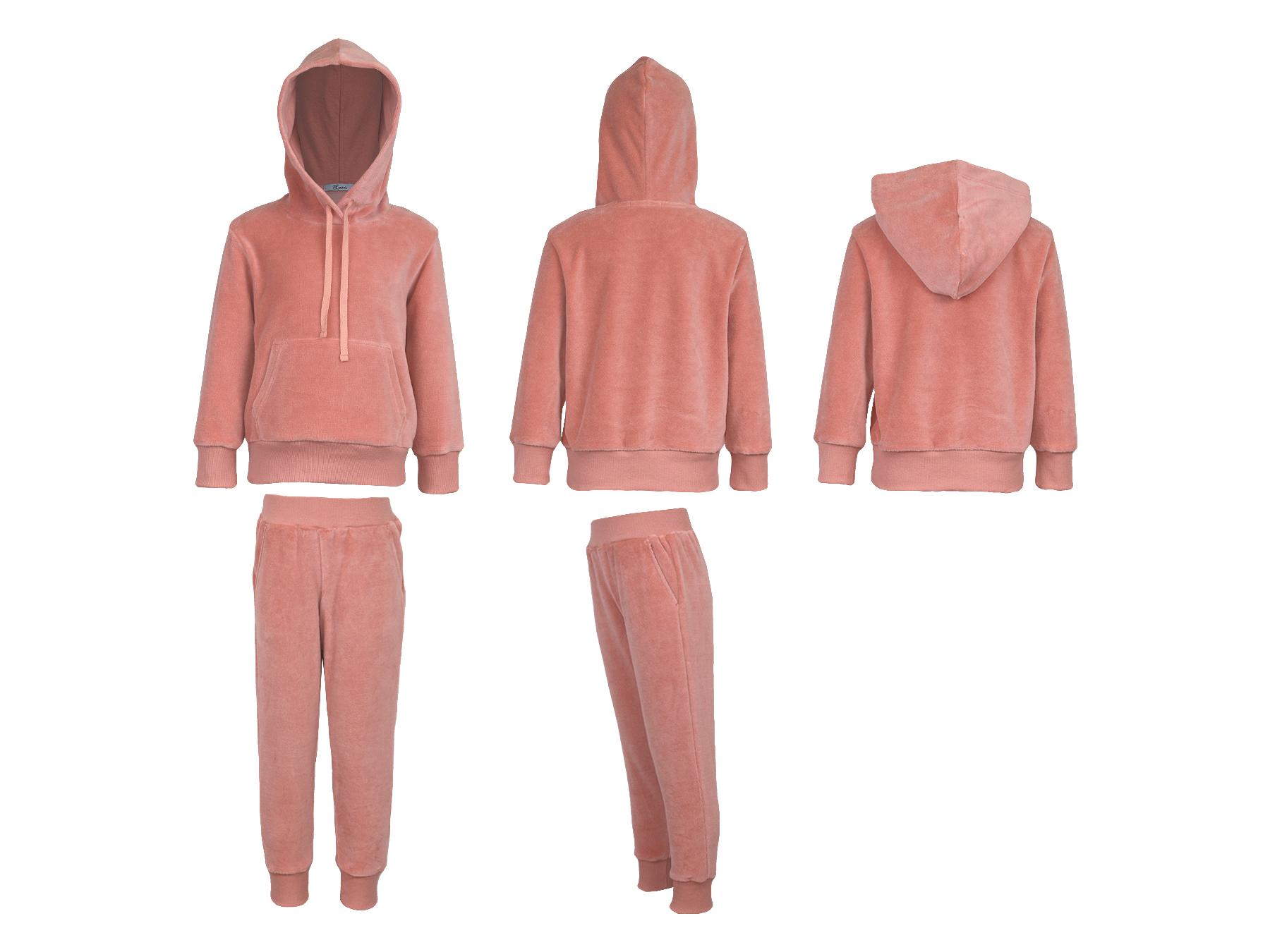 Костюм.Велюр: 80% х/б,20% п/э. Джемпер-прямого силуэта с капюшоном и шнуром,накладным карманом по переду.Рукав втачной на манжете из ластика. Брюки-длинные,прямые,вверху притачной пояс из ластика с резинкой.На переде два боковых кармана,низ брюк на манжете.