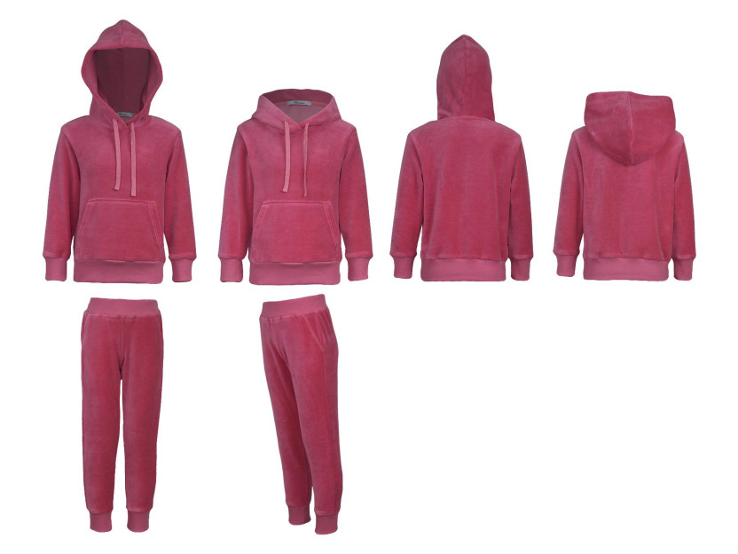 Костюм.Велюр: 80% х/б,20% п/э. Джемпер-прямого силуэта с капюшоном и шнуром,накладным карманом по переду.Рукав втачной на манжете из ластика. Брюки-длинные,прямые,вверху притачной пояс из ластика с резинкой.На переде два боковых кармана,низ брюк на манжете.