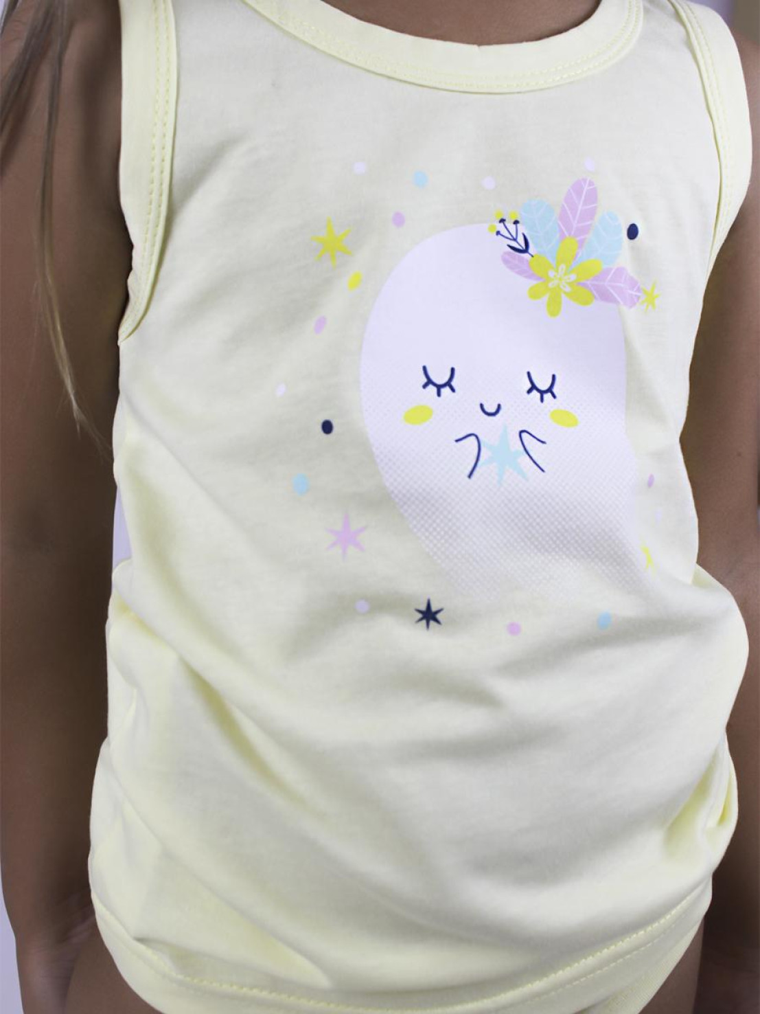 Кулирное полотно: 100% х/б. Майка-печать на переде,горловина и пройма окантованы. Трусы-на резинке,сзади печать,ножки окантованы.