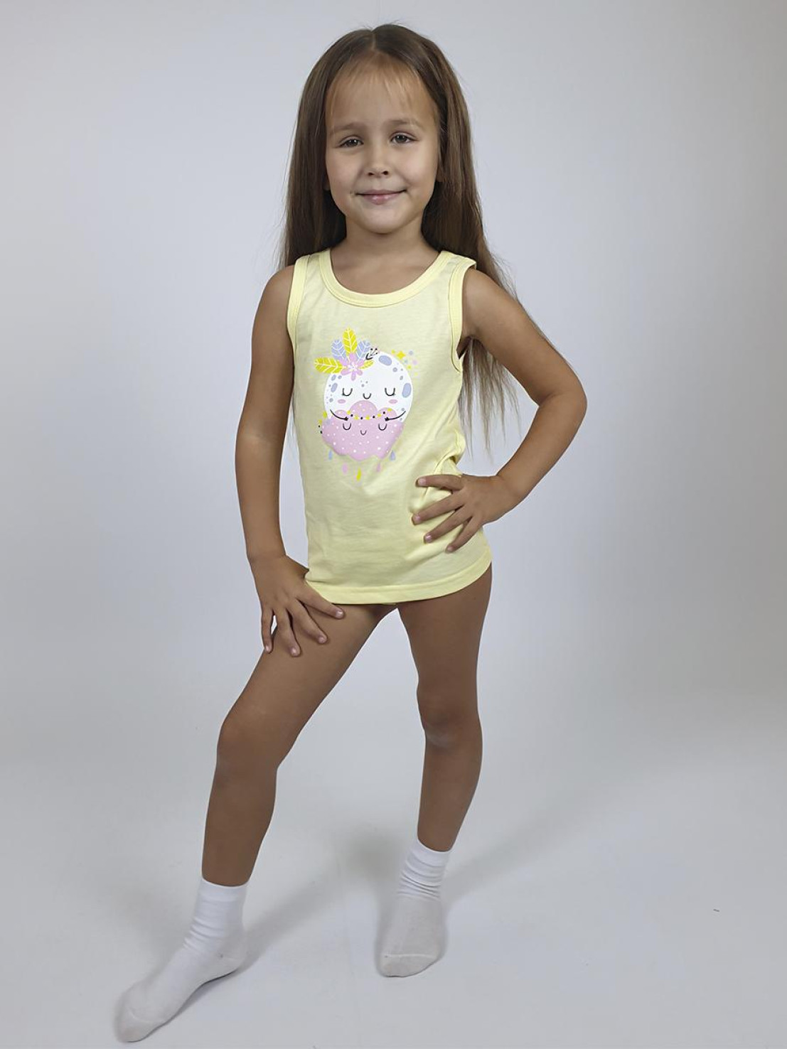 Кулирное полотно: 100% х/б. Майка-печать на переде,горловина и пройма окантованы. Трусы-на резинке,сзади печать,ножки окантованы.