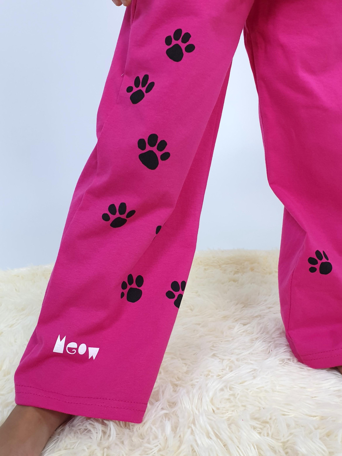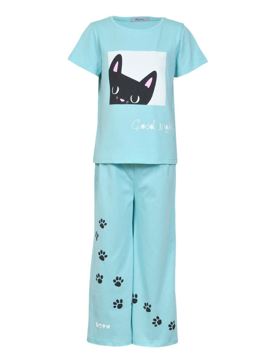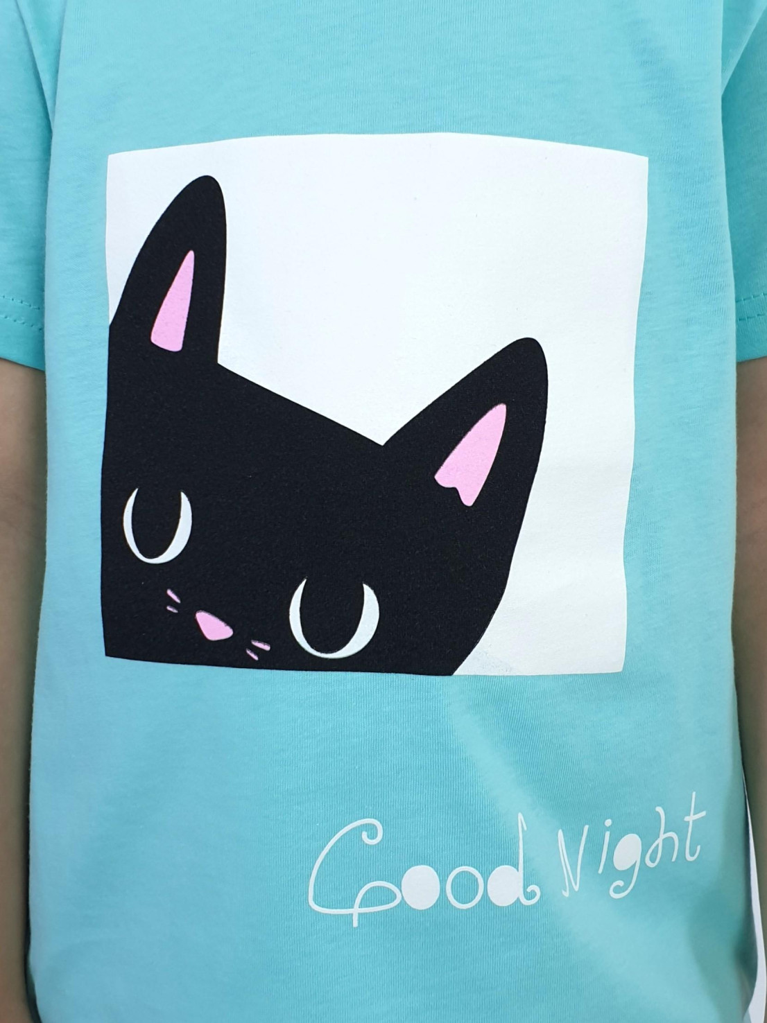 Кулирное полотно:100% х/б. Фуфайка(пижамная)-прямая,рукав втачной,короткий.Горловина обработана планкой.Печать на переде. Брюки(пижамные)-длинные прямые,верхний срез подшит с резинкой.Печать на передних половинках.