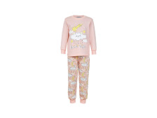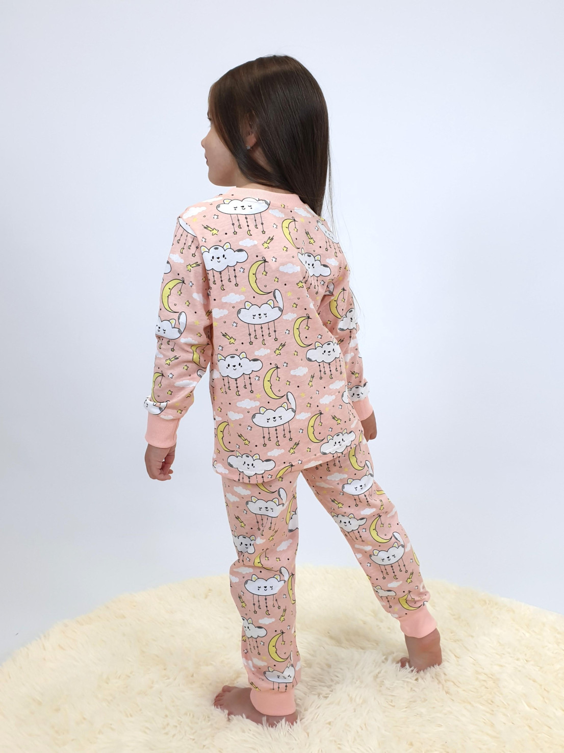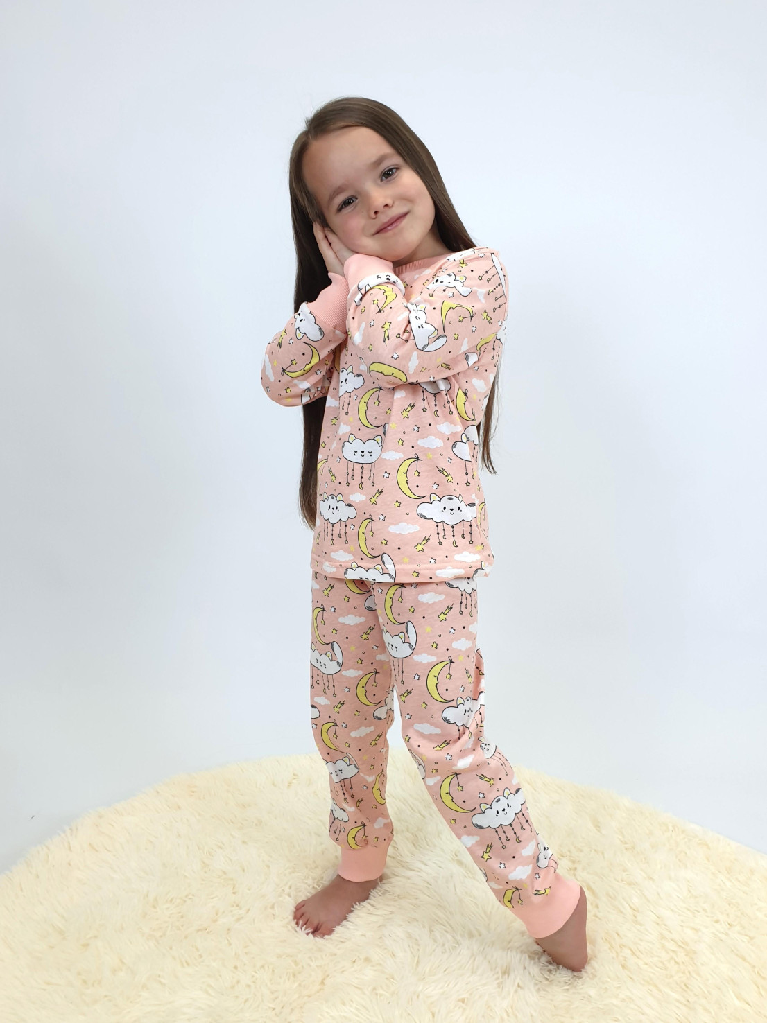 Кулирное полотно:100% х/б. Фуфайка-прямая,рукав втачной,длинный на манжете из ластика.Горловина обработана ластиком.Печать на переде. Брюки-длинные на манжете из ластика.Верхний срез подшит с резинкой.