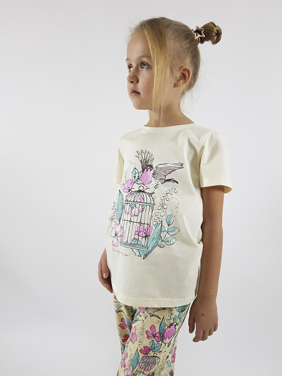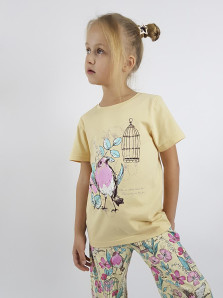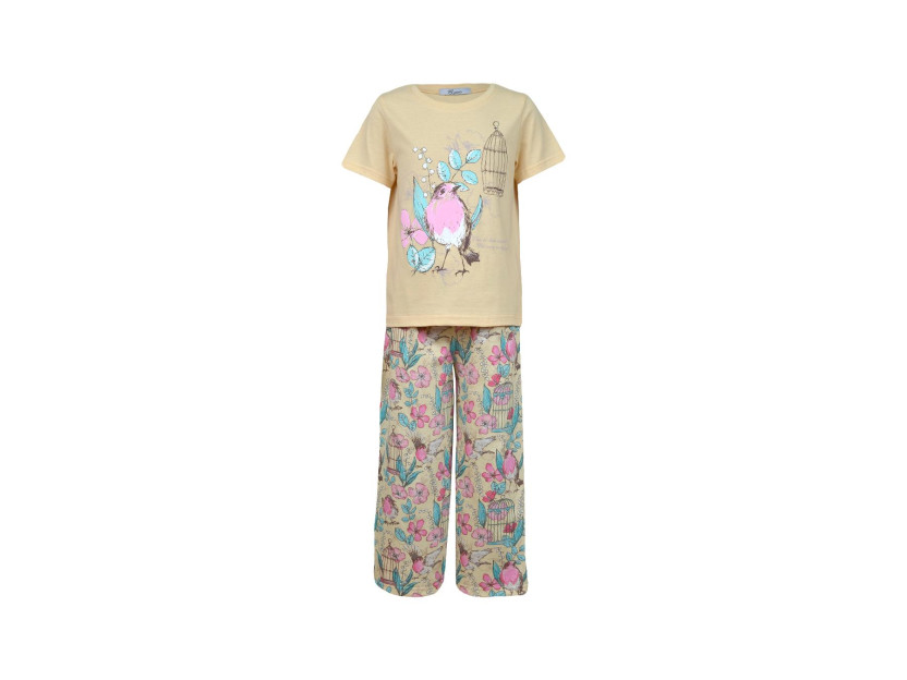 Пижама.Кулирное полотно:100% х/б. Фуфайка-прямая,рукав втачной,короткий.Горловина обработана планкой.Печать на переде. Брюки-длинные прямые,верхний срез подшит с резинкой.