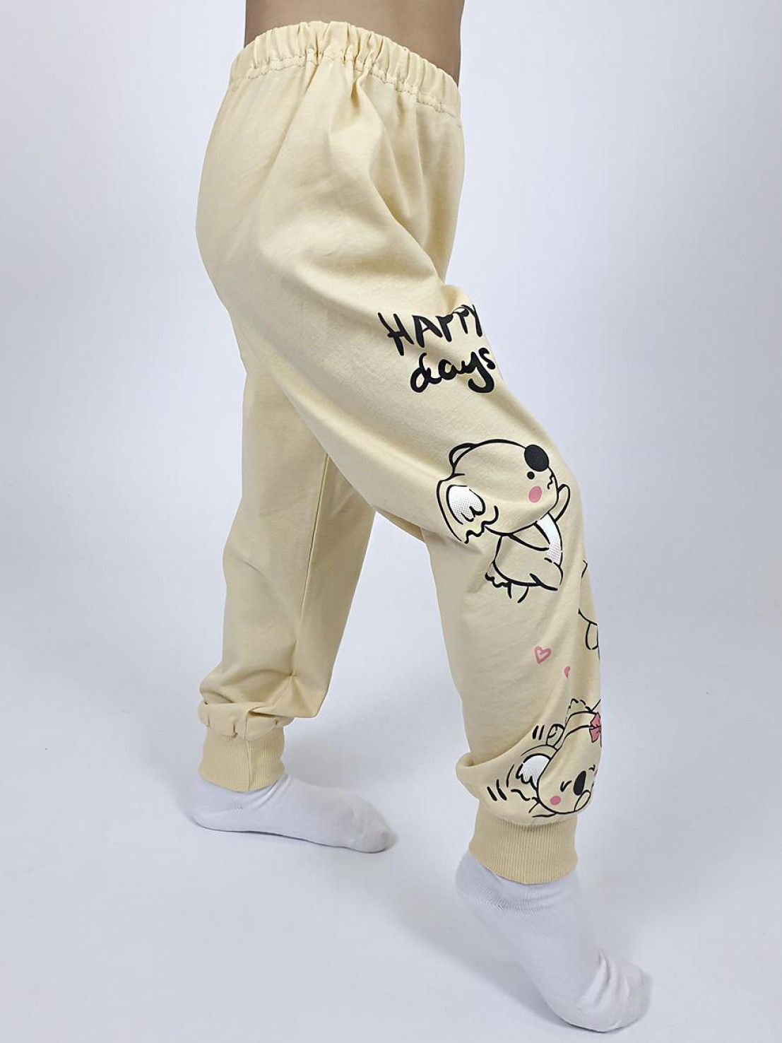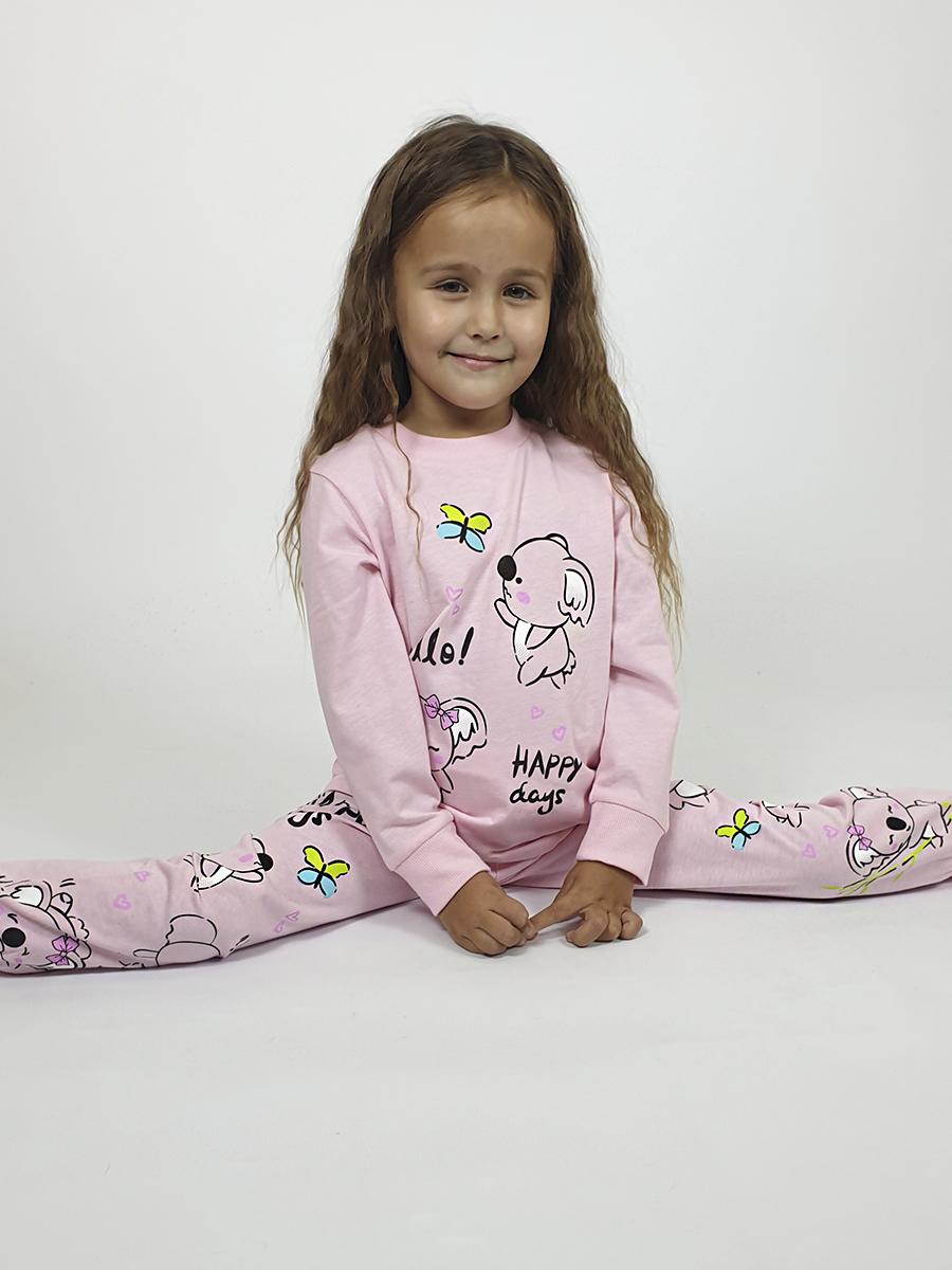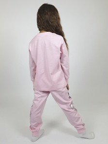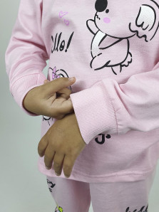 Кулирное полотно:100% х/б. Фуфайка-прямая,рукав втачной,длинный на манжете из ластика.Горловина обработана ластиком.Печать на переде. Брюки-длинные на манжете из ластика с печатью.Верхний срез подшит с резинкой.
