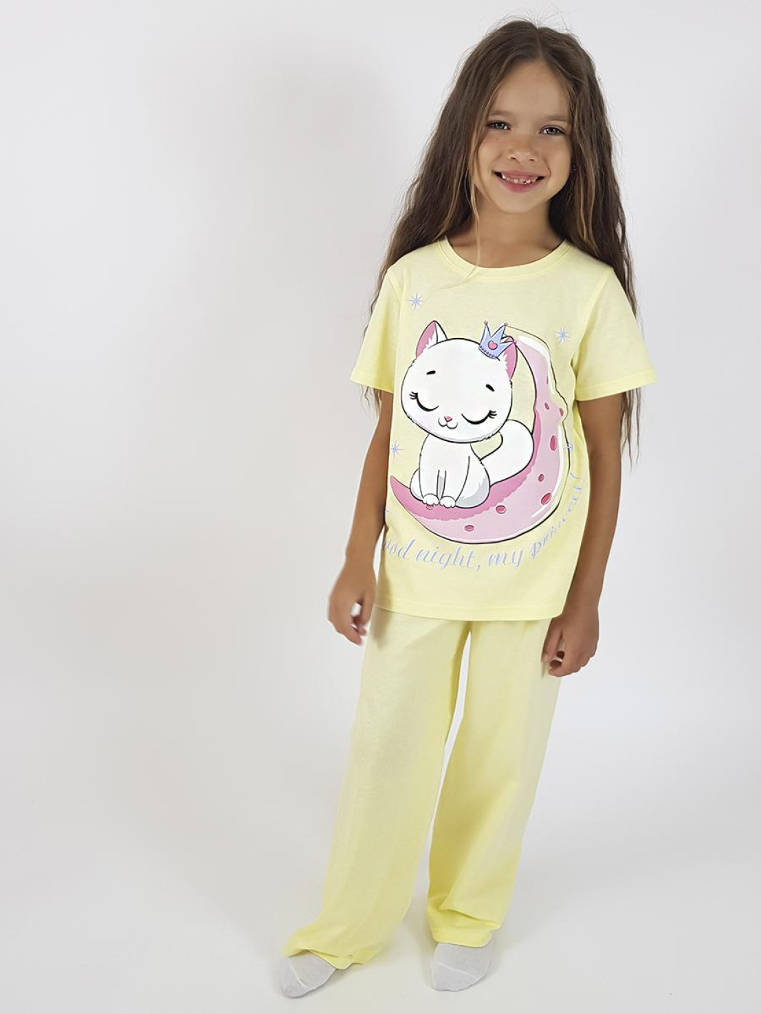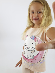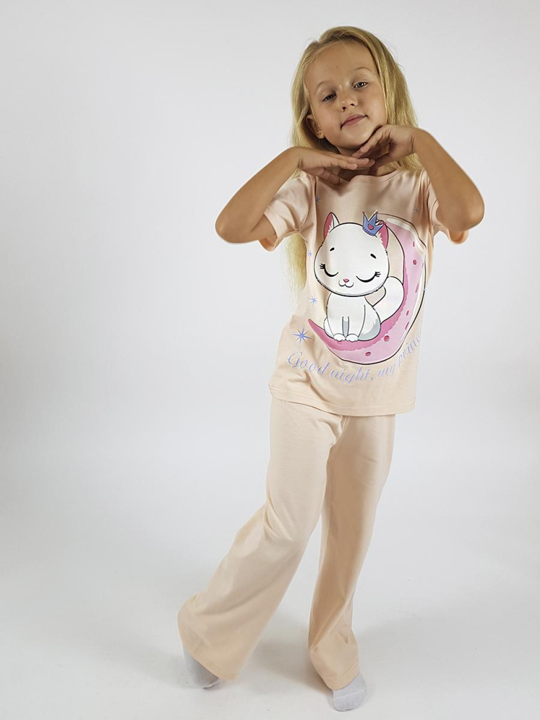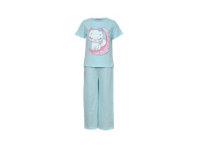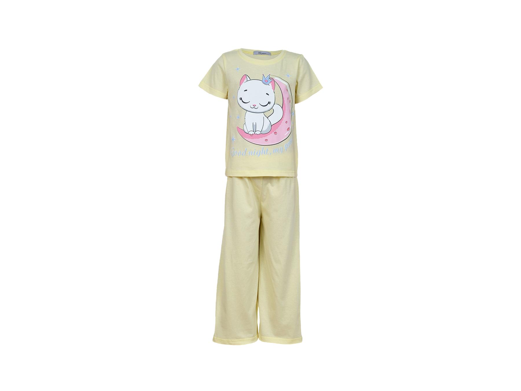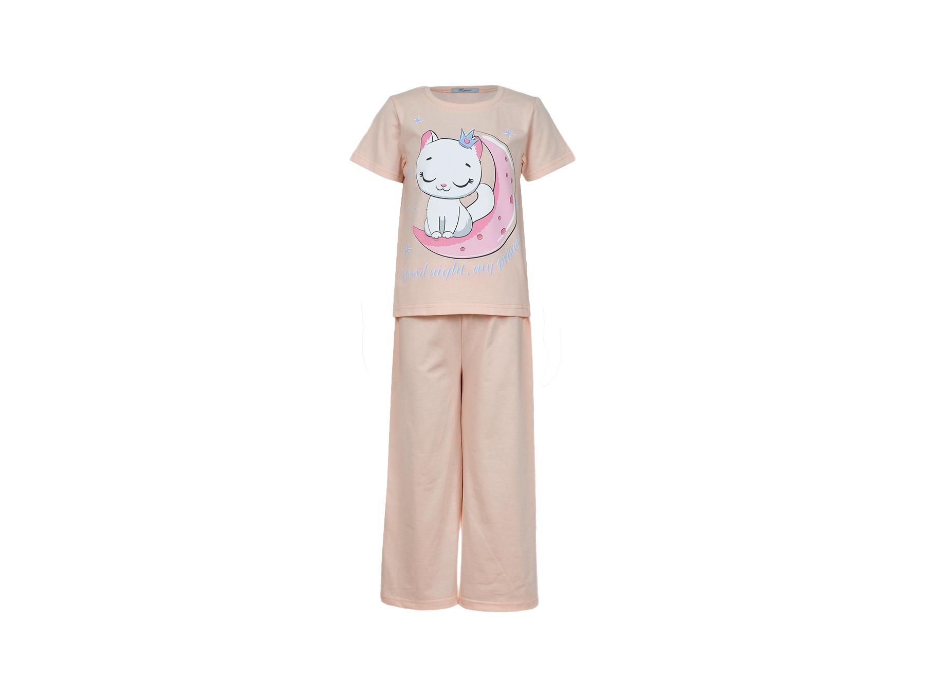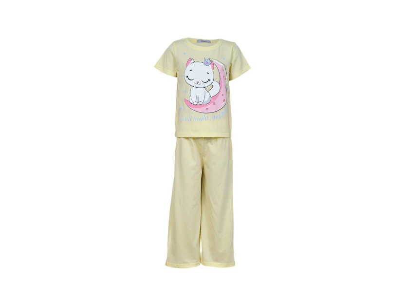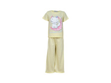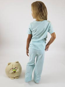 Кулирное полотно:100% х/б. Фуфайка-с цельнокроенным,коротким рукавом.Перед с печатью.Горловина окантована,низ подшит. Брюки-длинные прямые,верхний срез подшит с резинкой.