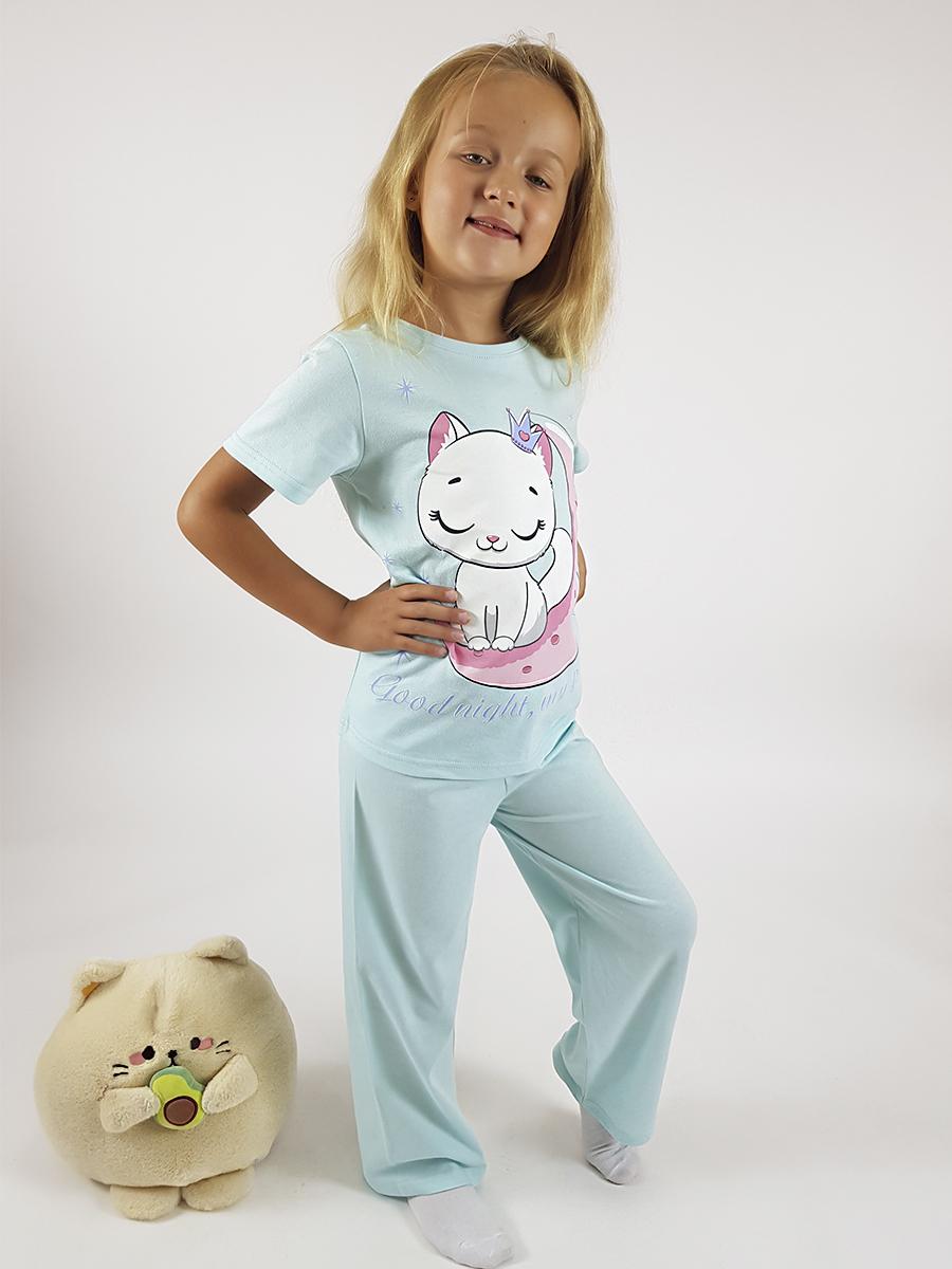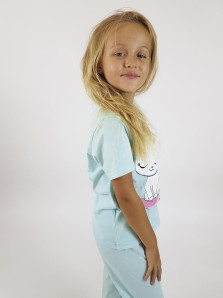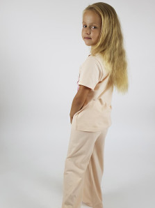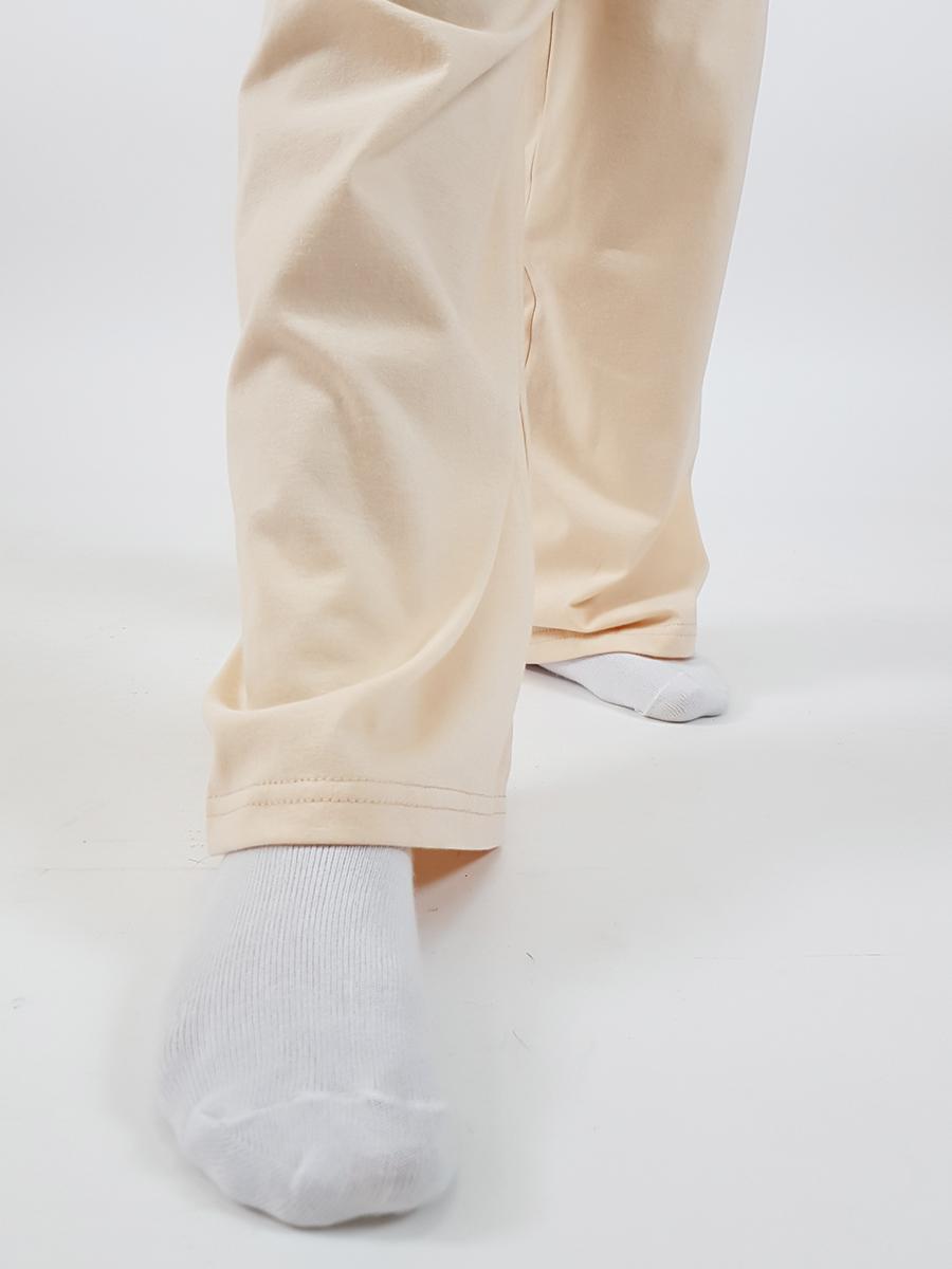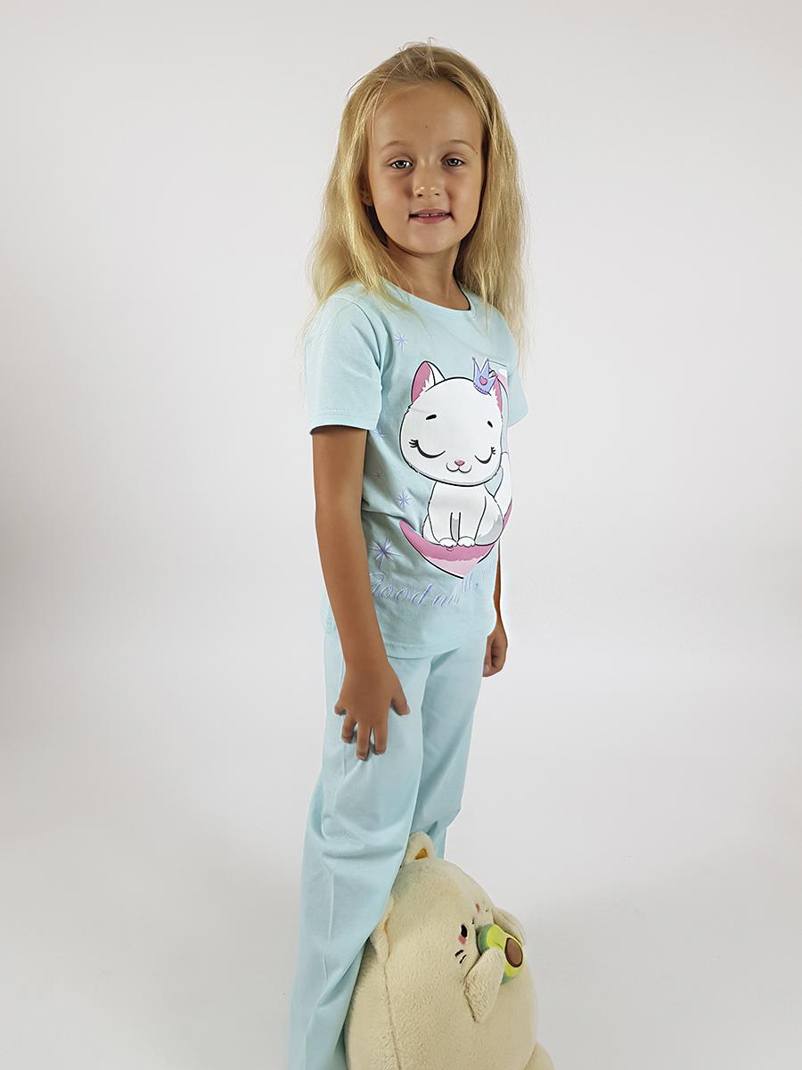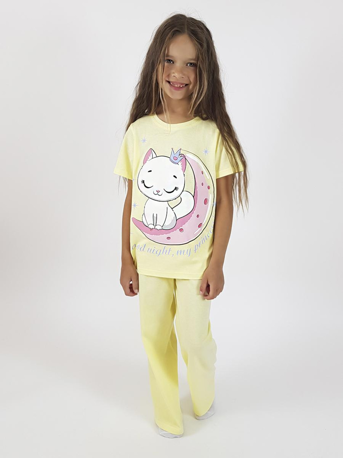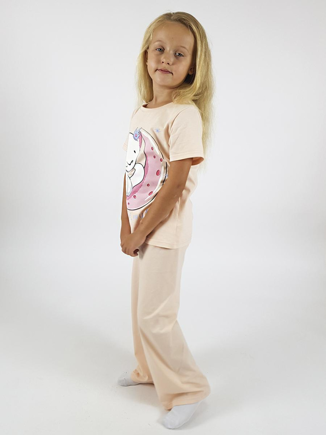 Кулирное полотно:100% х/б. Фуфайка-с цельнокроенным,коротким рукавом.Перед с печатью.Горловина окантована,низ подшит. Брюки-длинные прямые,верхний срез подшит с резинкой.