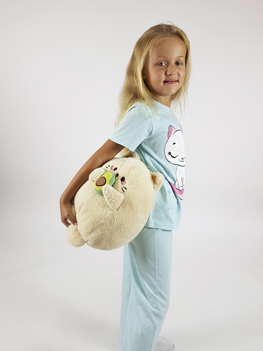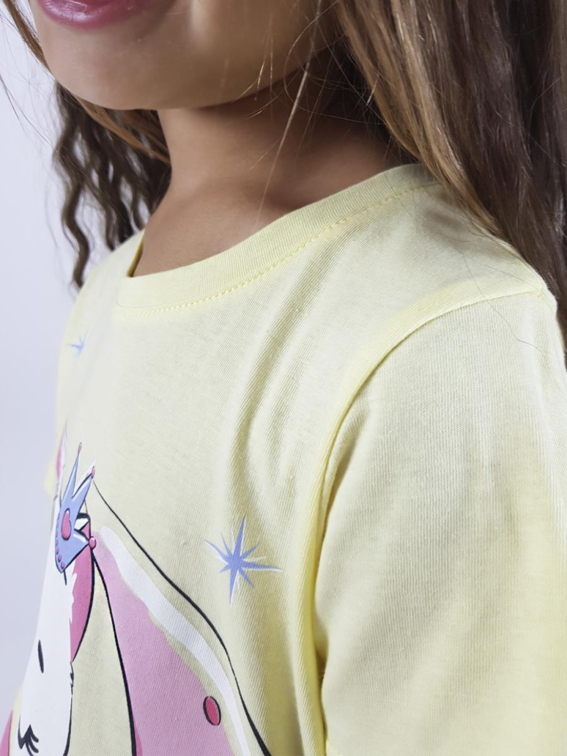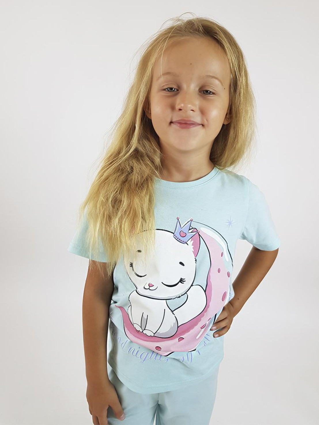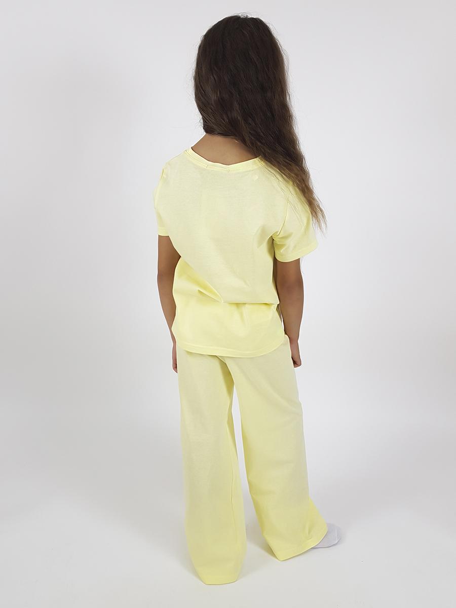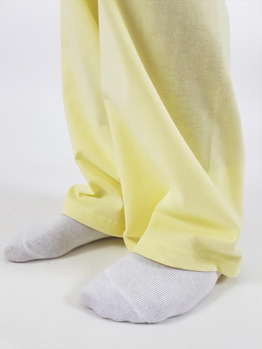 Кулирное полотно:100% х/б. Фуфайка-с цельнокроенным,коротким рукавом.Перед с печатью.Горловина окантована,низ подшит. Брюки-длинные прямые,верхний срез подшит с резинкой.