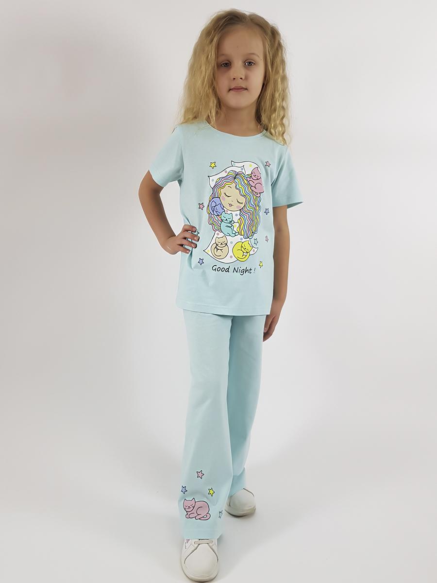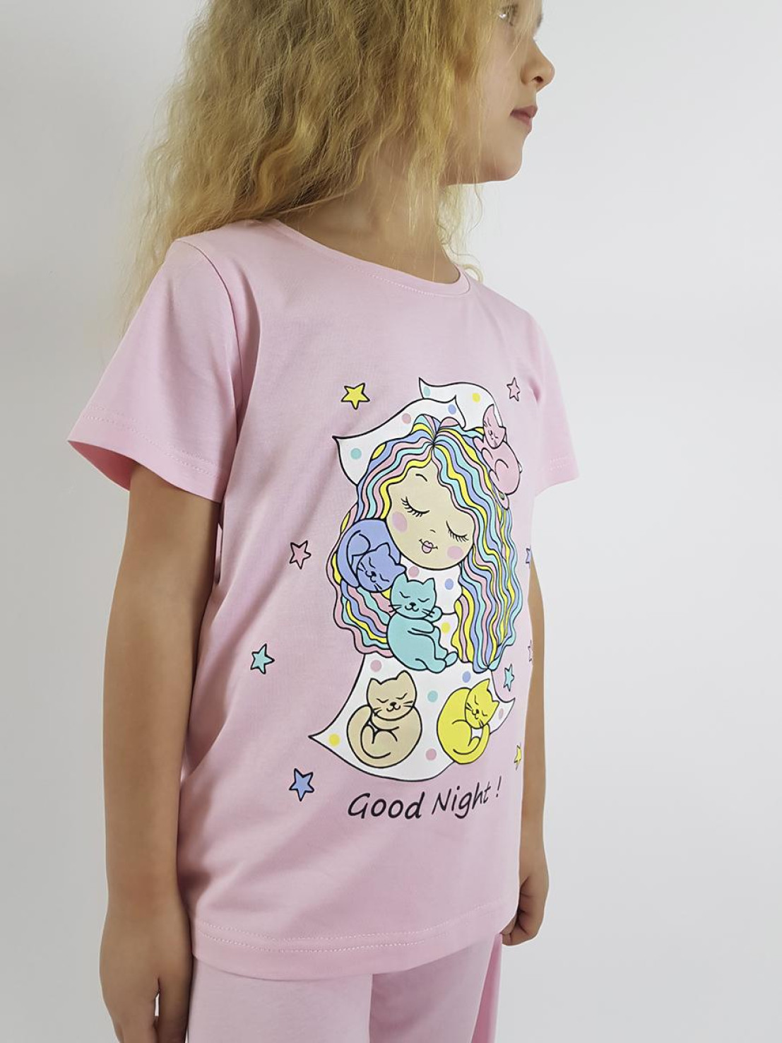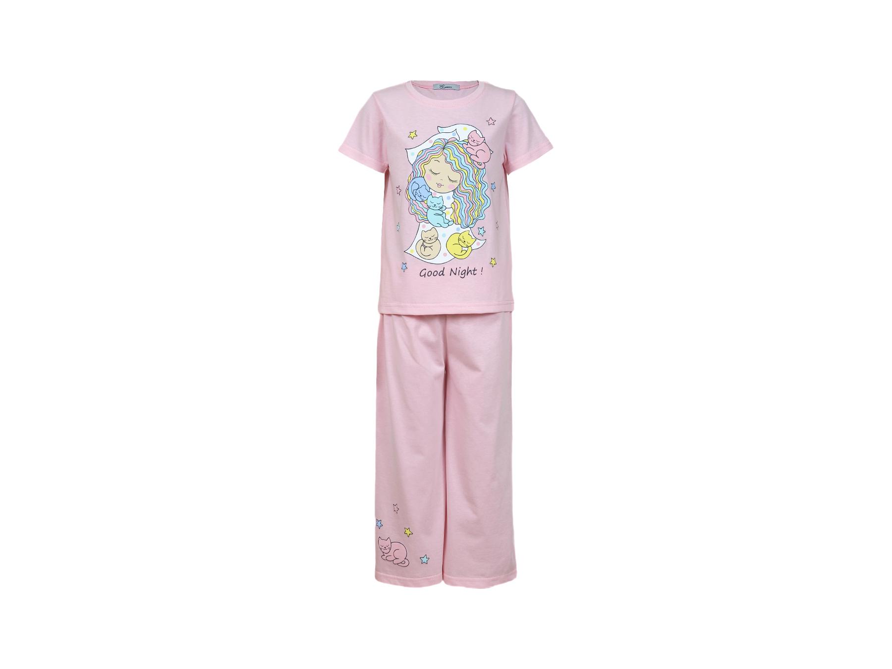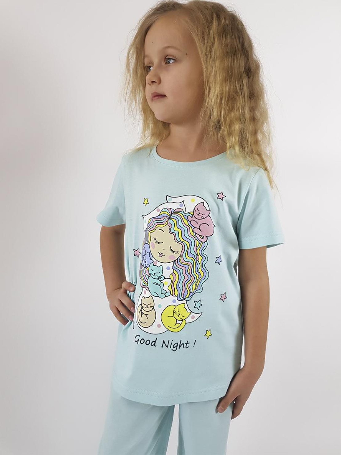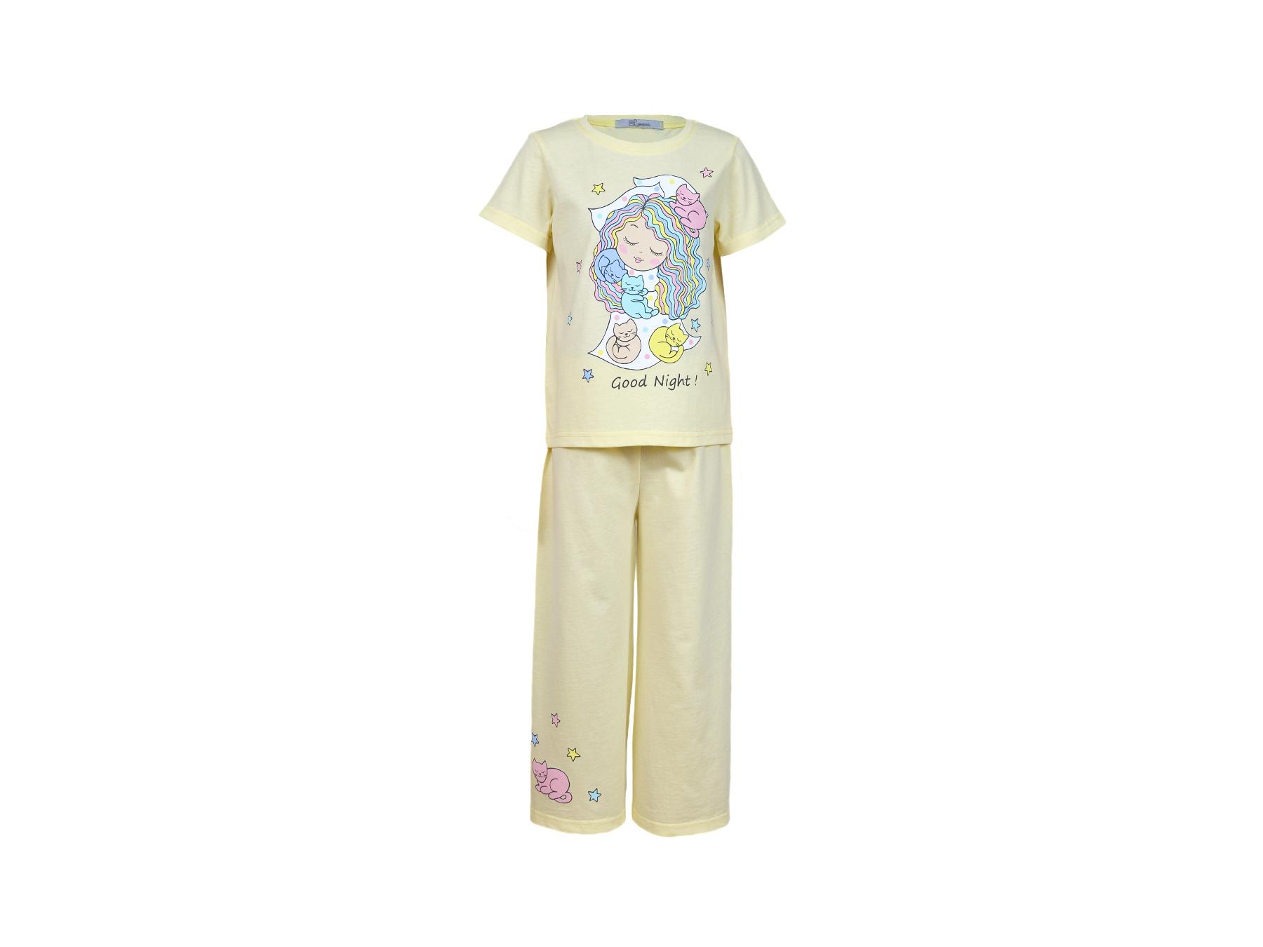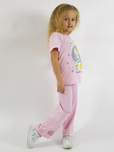 Кулирное полотно:100% х/б. Фуфайка-прямая,рукав втачной,короткий. Горловина обработана планкой.Печать на переде. Брюки-длинные,прямые.Верхний срез подшит с резинкой.