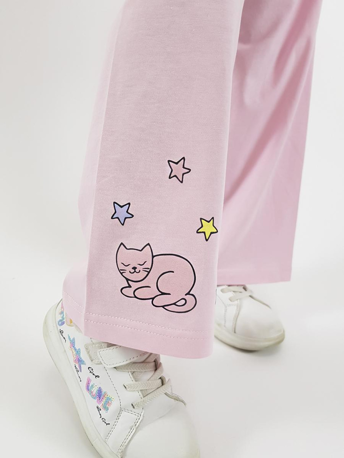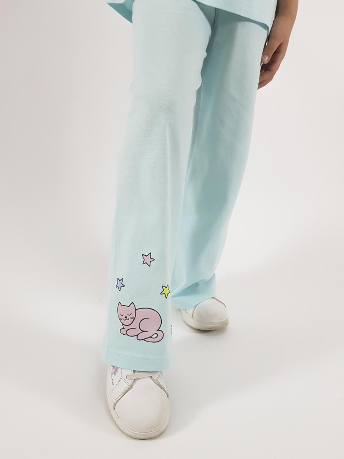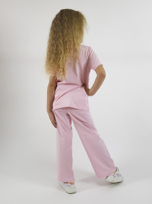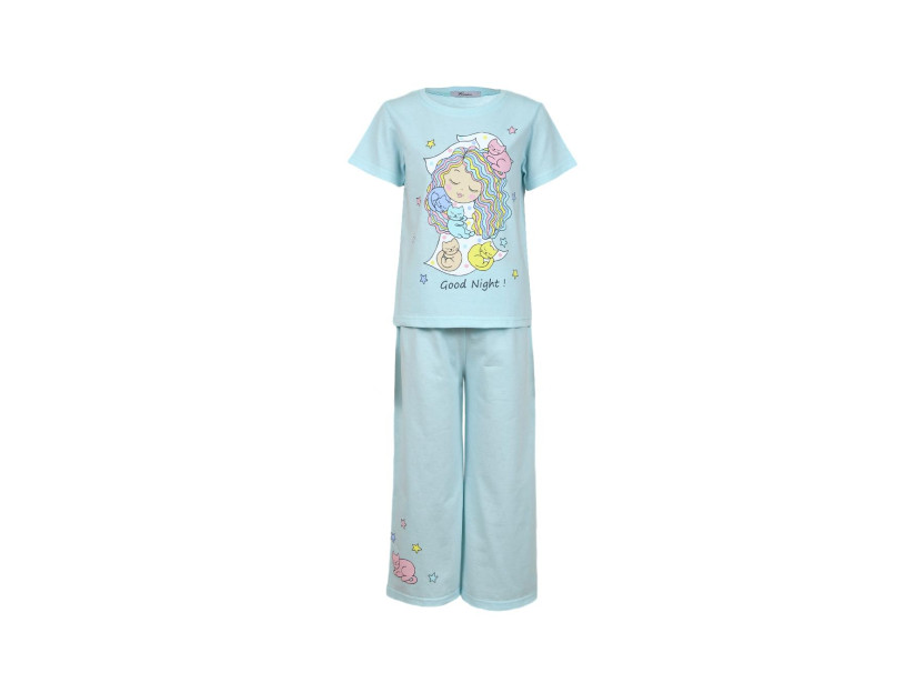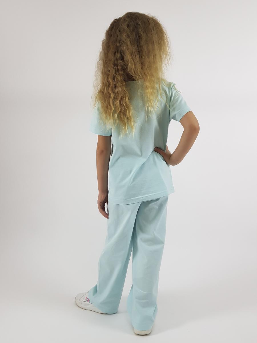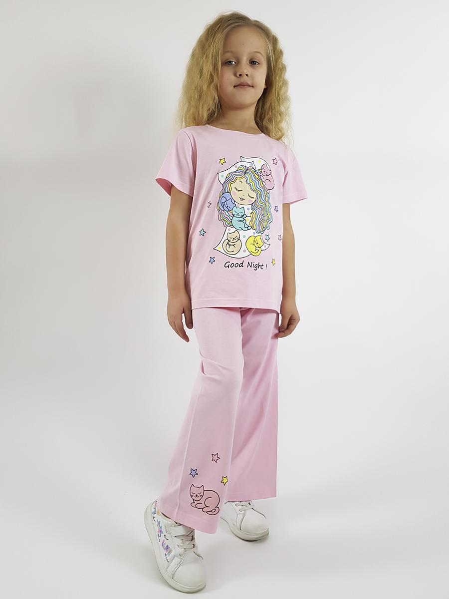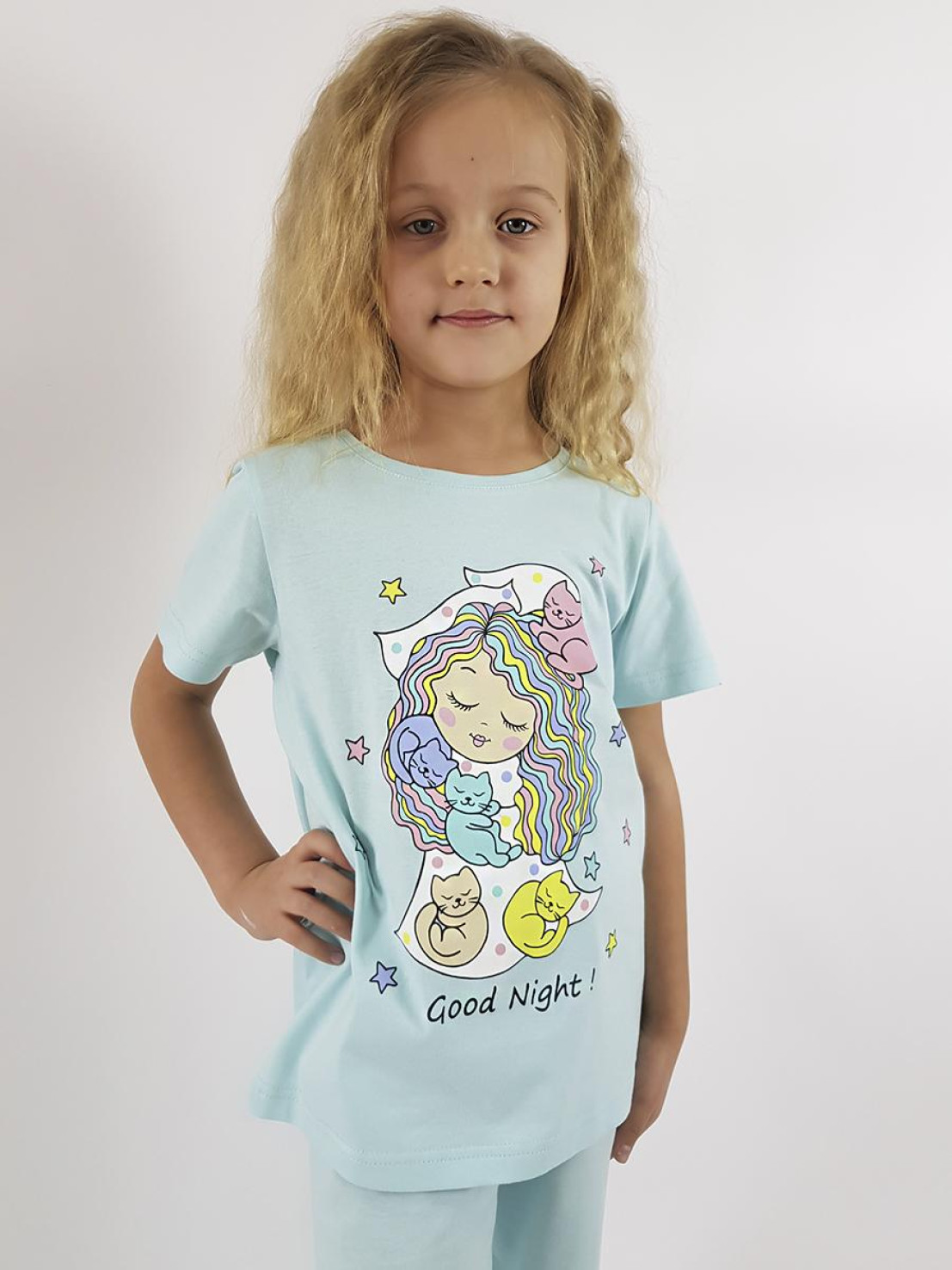 Кулирное полотно:100% х/б. Фуфайка-прямая,рукав втачной,короткий. Горловина обработана планкой.Печать на переде. Брюки-длинные,прямые.Верхний срез подшит с резинкой.