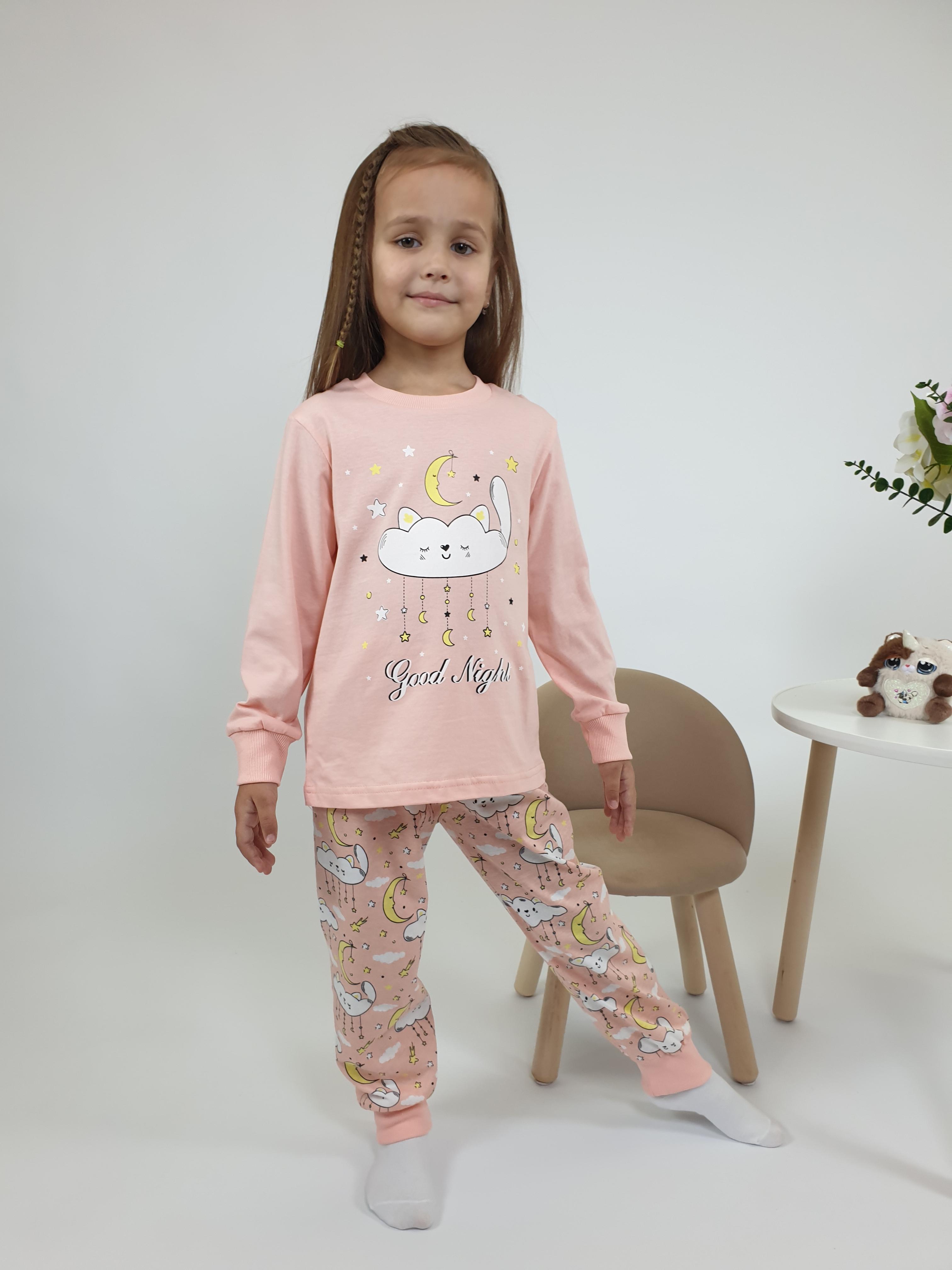 Кулирное полотно:100% х/б. Фуфайка-прямая,рукав втачной,длинный на манжете из ластика.Горловина обработана ластиком.Печать на переде. Брюки-длинные на манжете из ластика.Верхний срез подшит с резинкой.