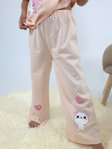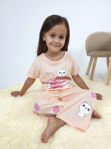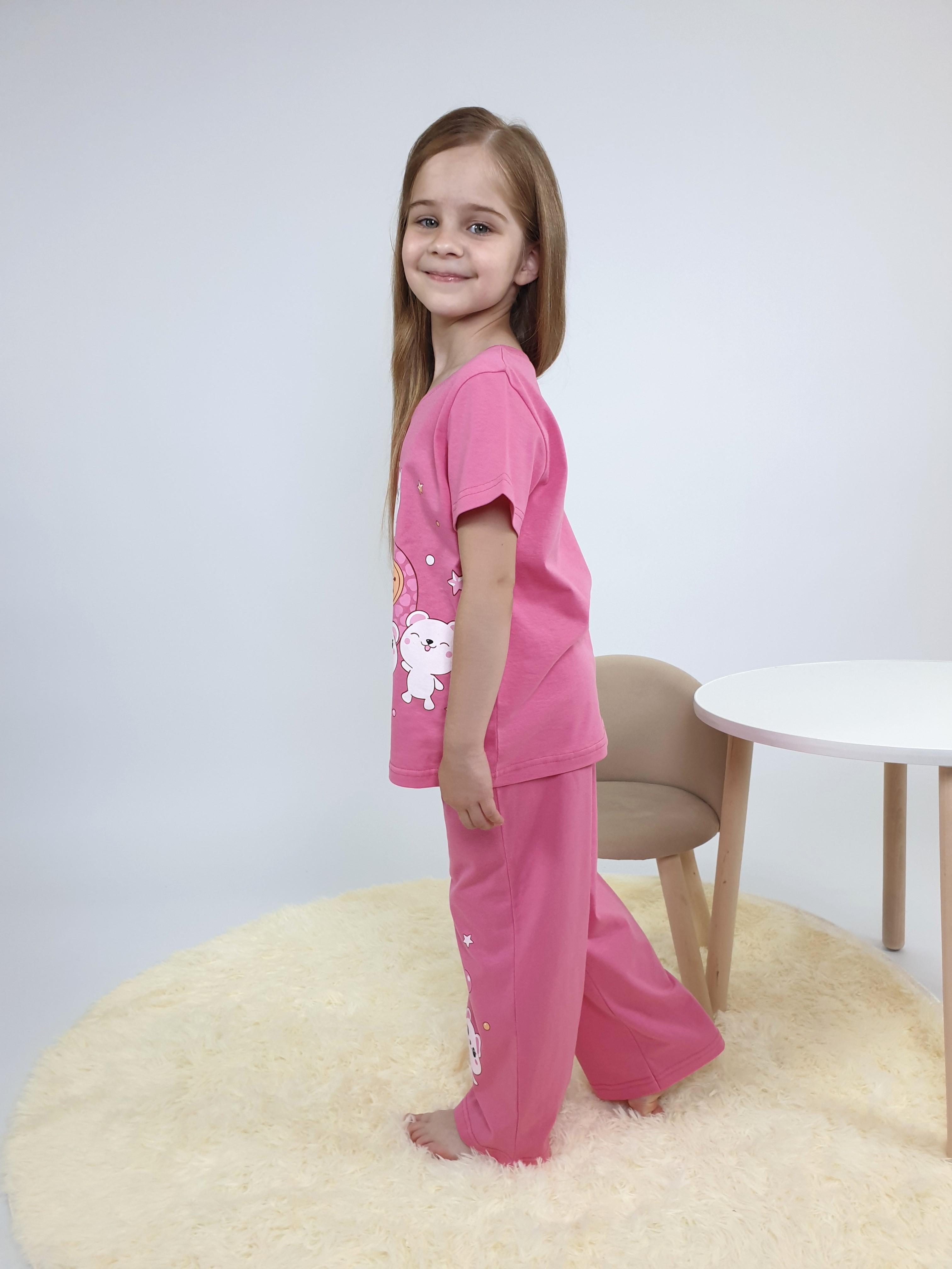 Кулирное полотно:100% х/б. Фуфайка(пижамная)-прямая,рукав втачной,короткий.Горловина обработана планкой.Печать на переде. Брюки(пижамные)-длинные прямые,верхний срез подшит с резинкой.Печать на передних половинках.