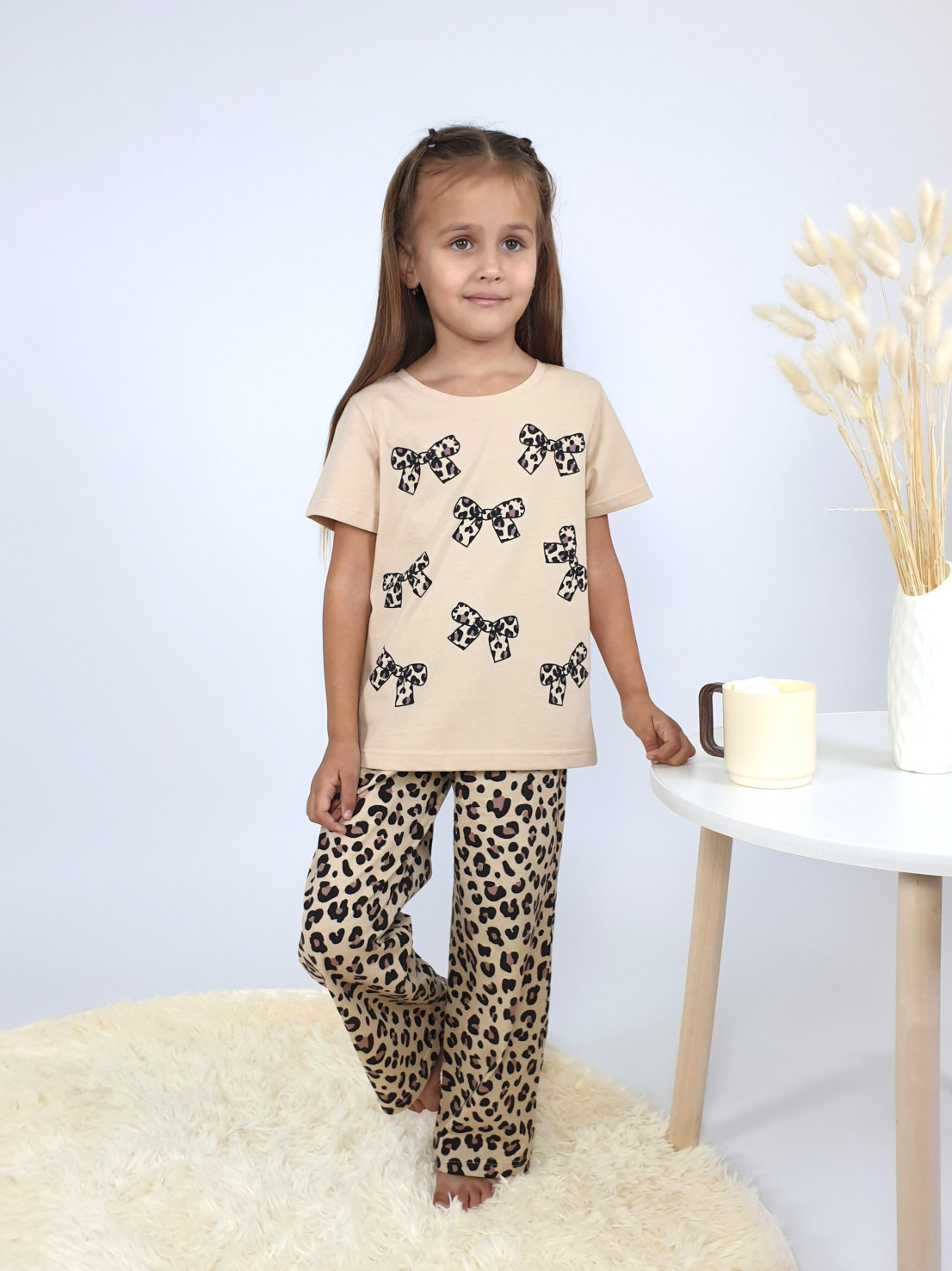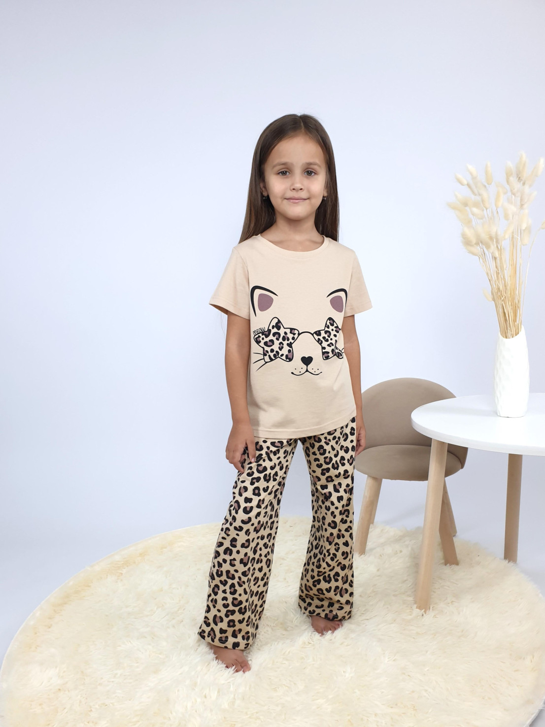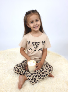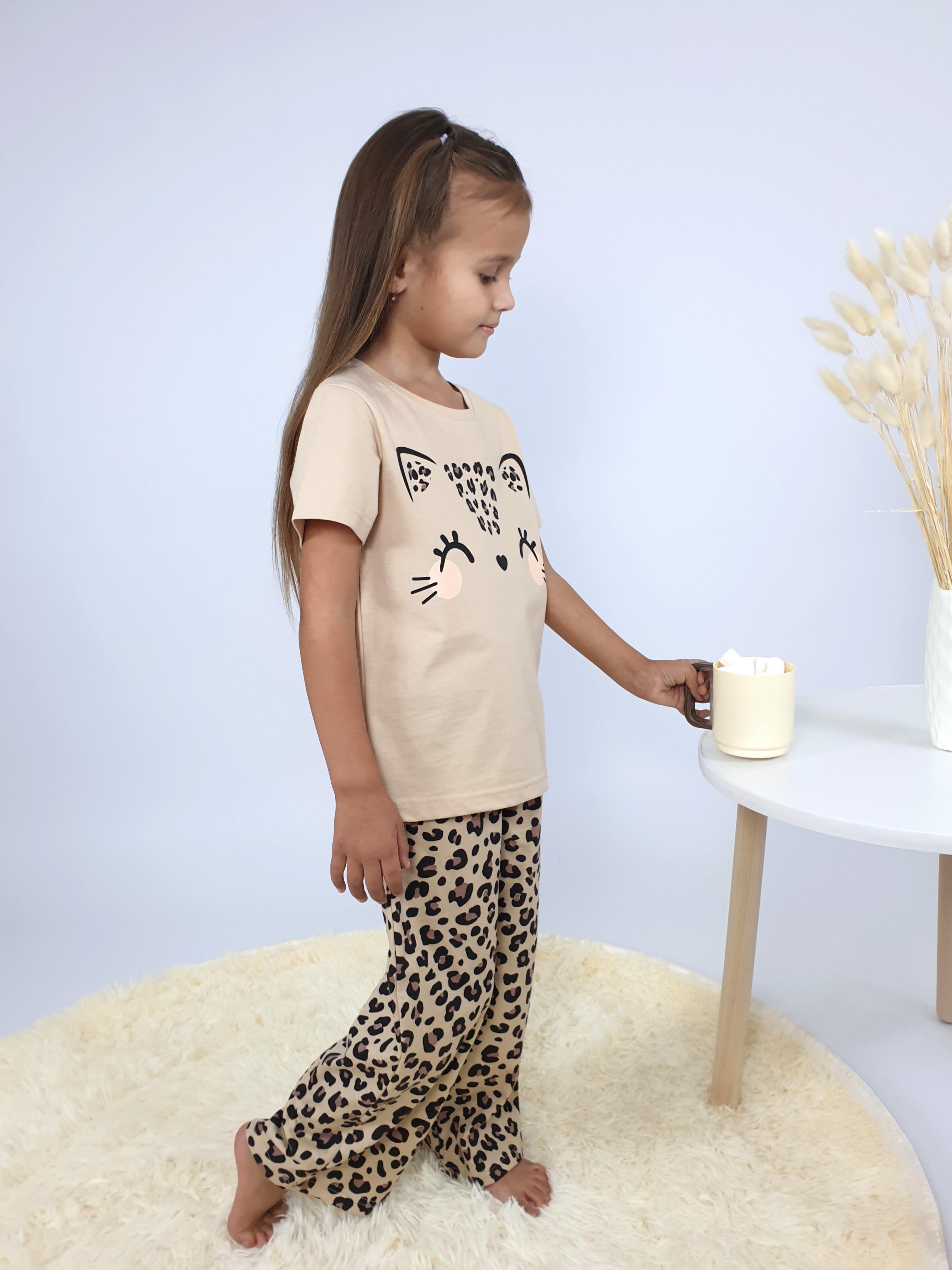 Кулирное полотно:100% х/б. Фуфайка(пижамная)-прямая,рукав втачной,короткий.Горловина обработана планкой.Печать на переде. Брюки(пижамные)-длинные прямые,верхний срез подшит с резинкой.