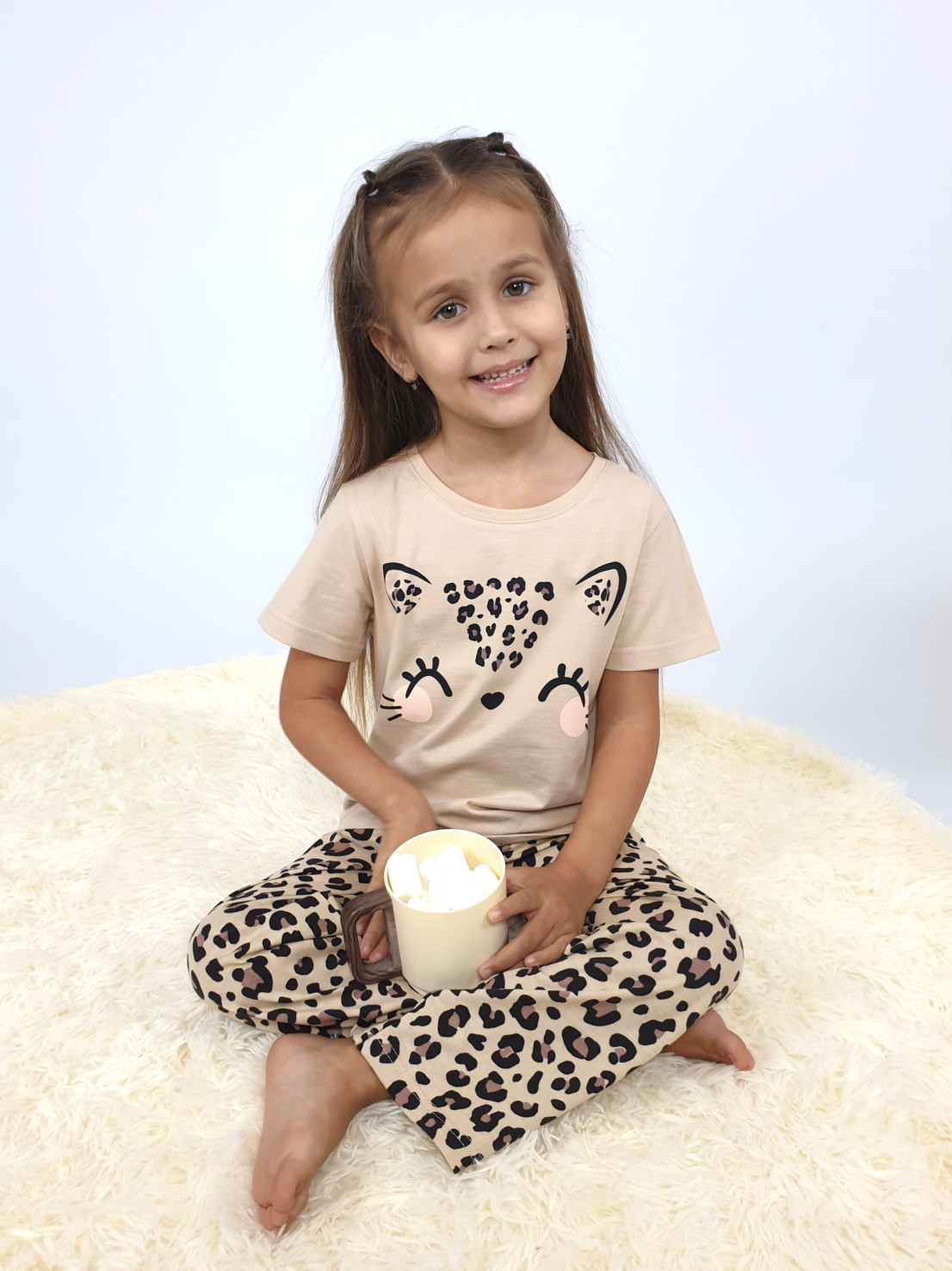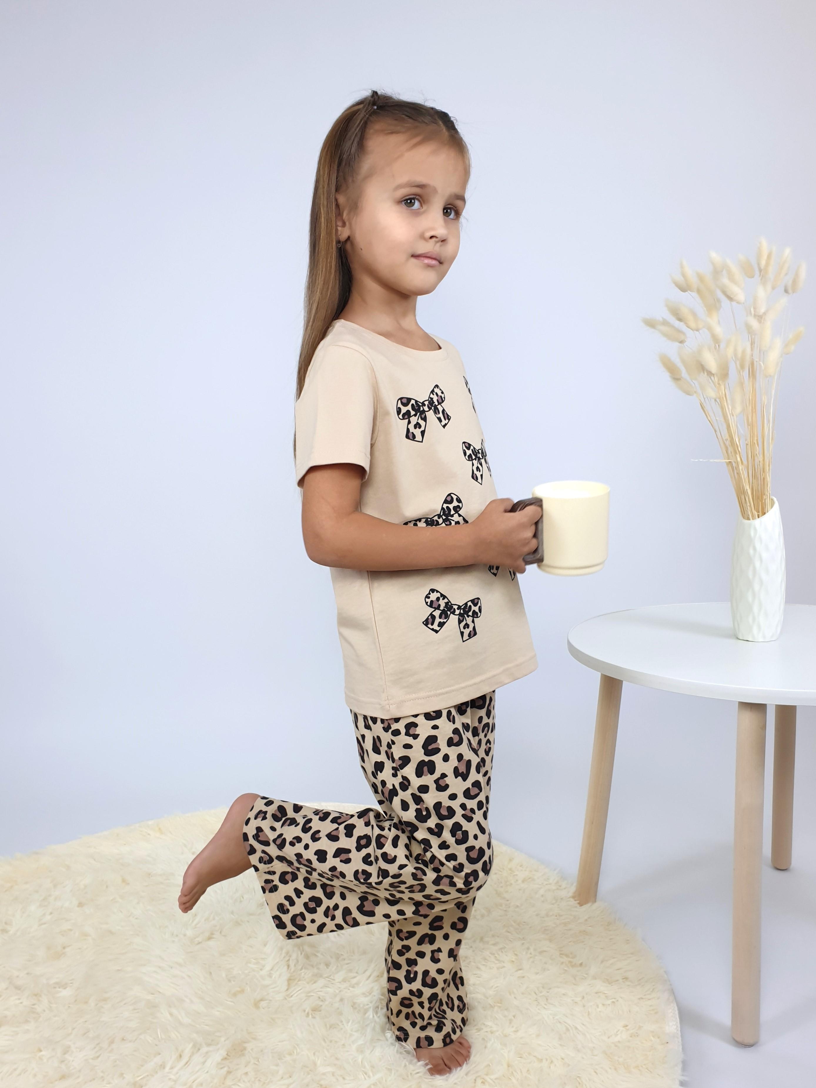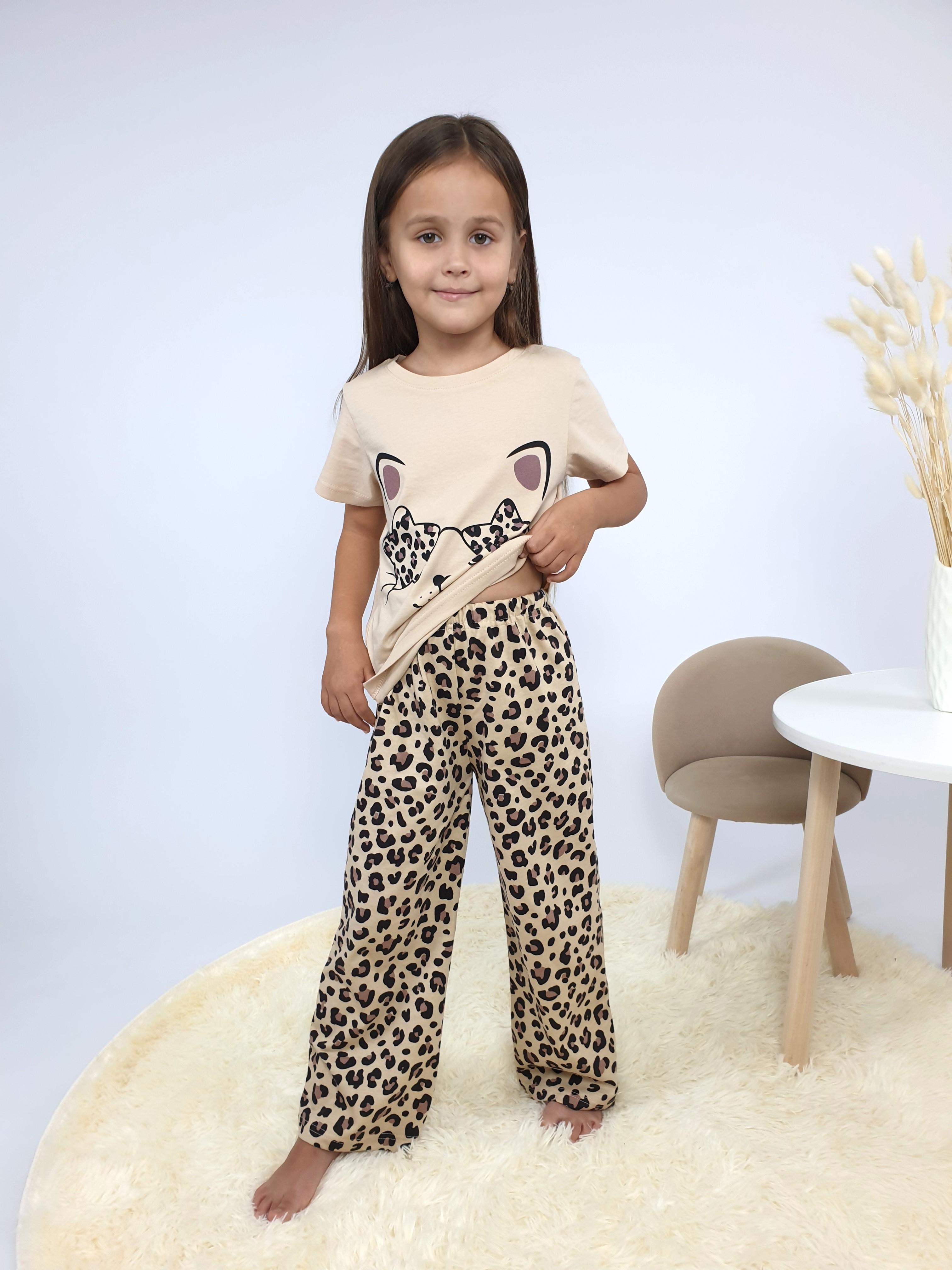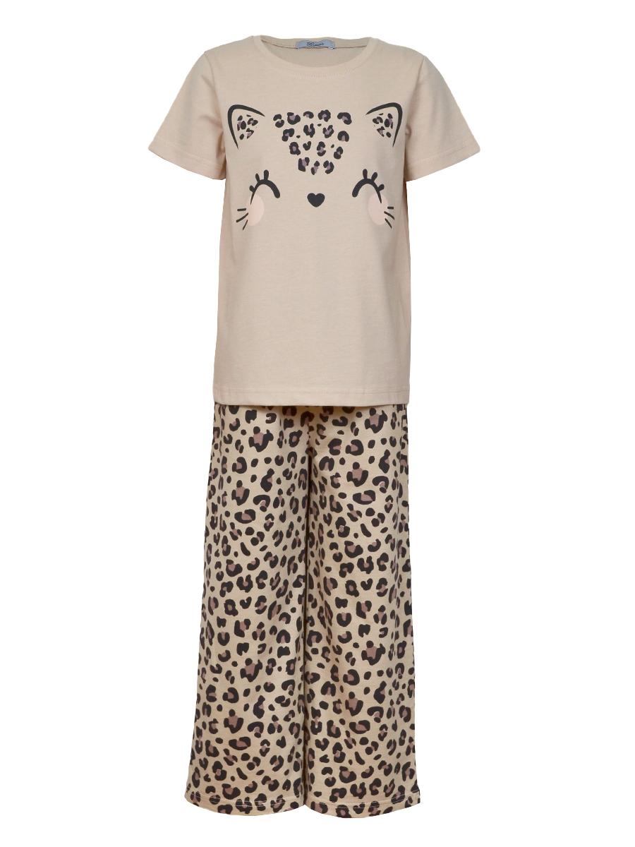 Кулирное полотно:100% х/б. Фуфайка(пижамная)-прямая,рукав втачной,короткий.Горловина обработана планкой.Печать на переде. Брюки(пижамные)-длинные прямые,верхний срез подшит с резинкой.
