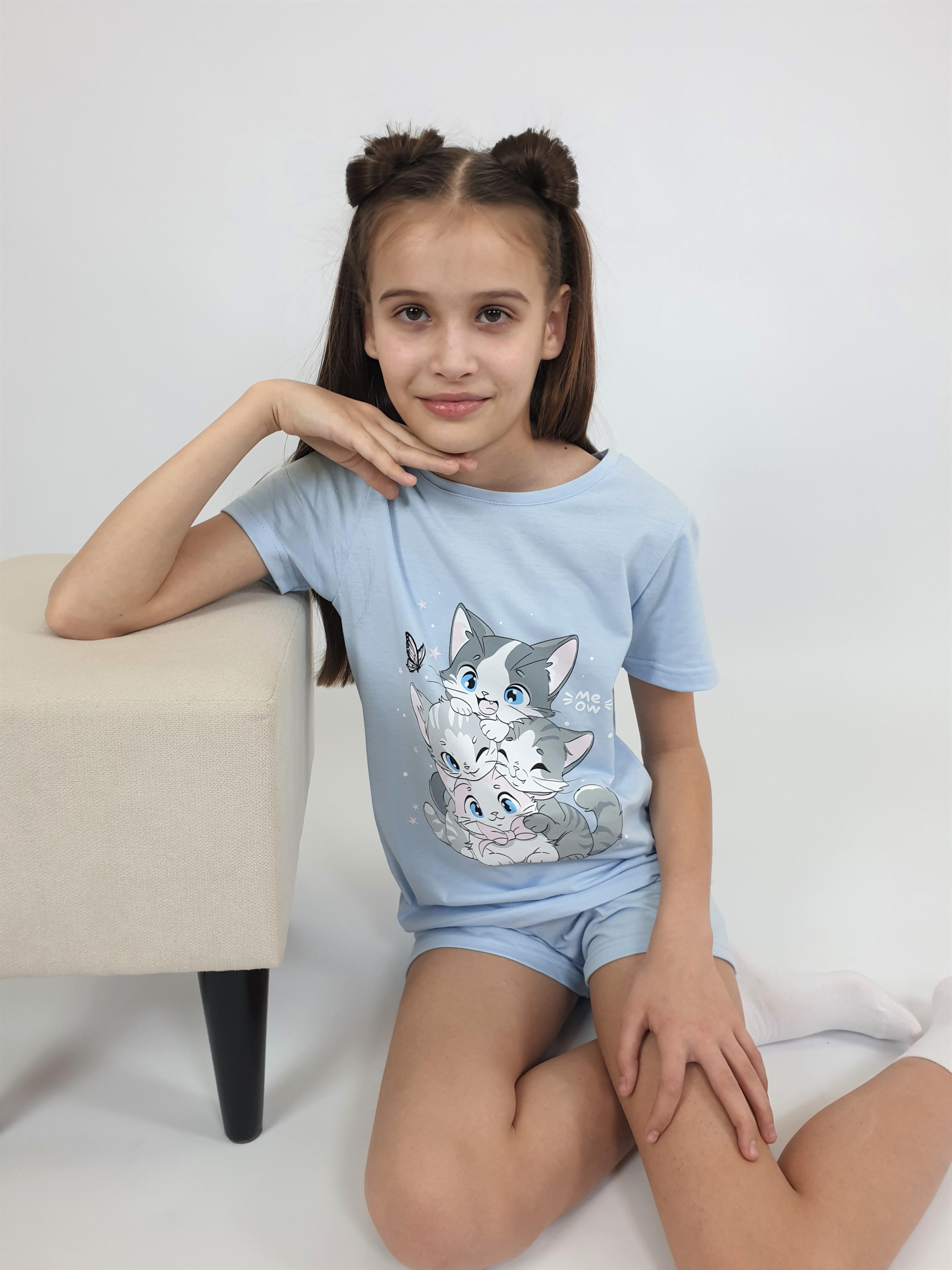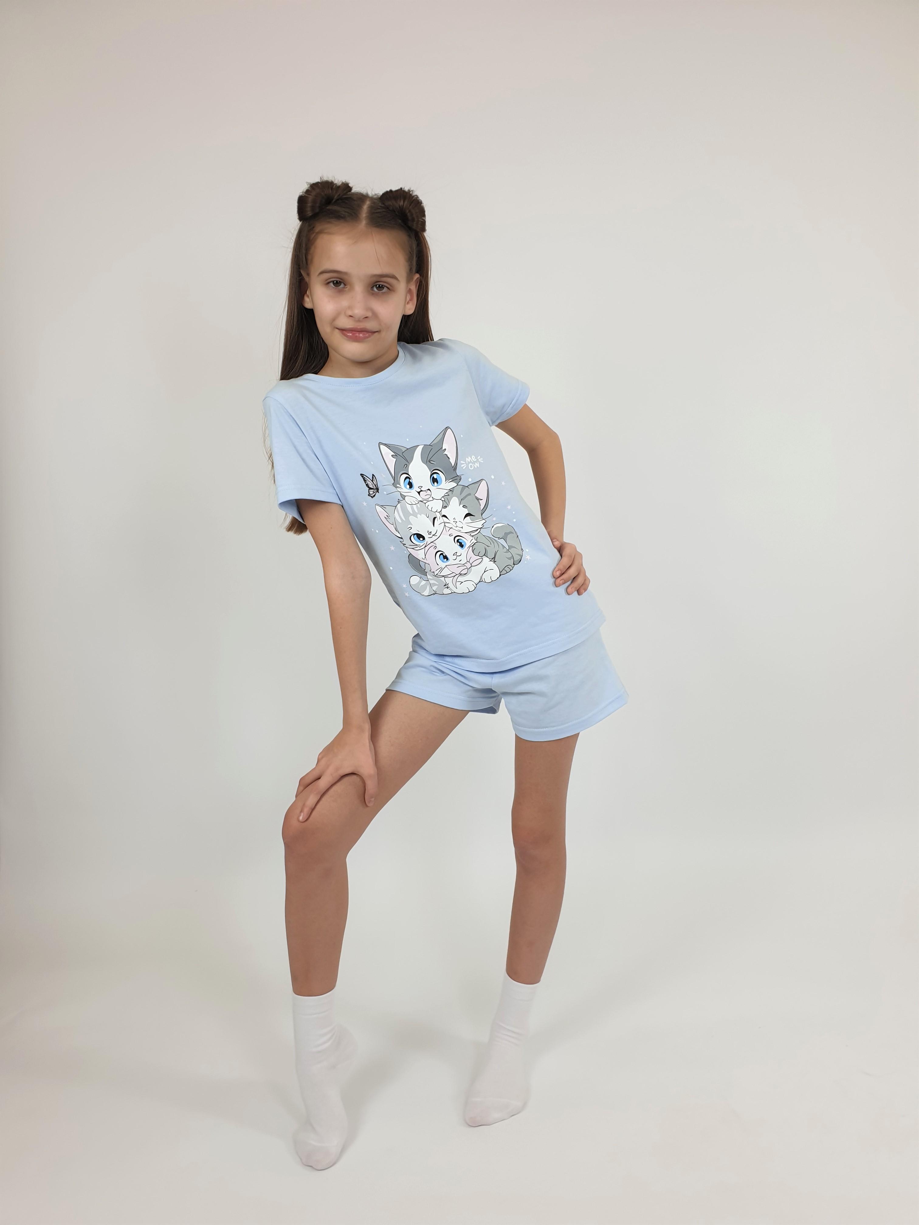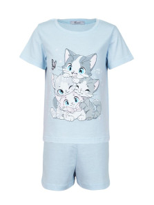 Кулирное полотно:100% х/б. Фуфайка-прямая,рукав втачной,короткий.Горловина обработана планкой.Печать на переде. Шорты-короткие на резинке,низ подшит.