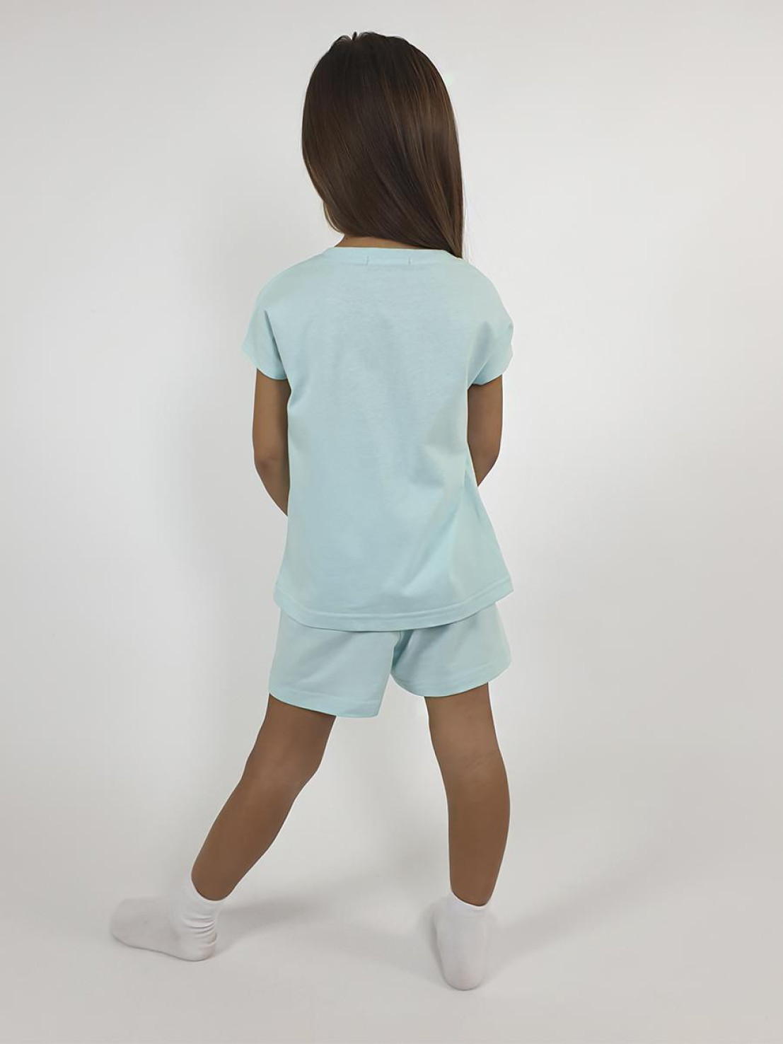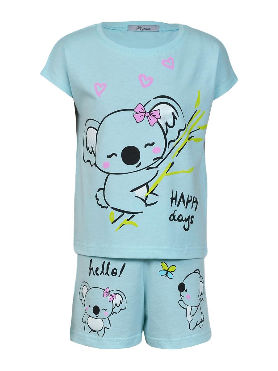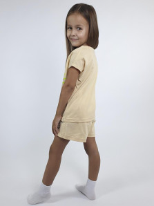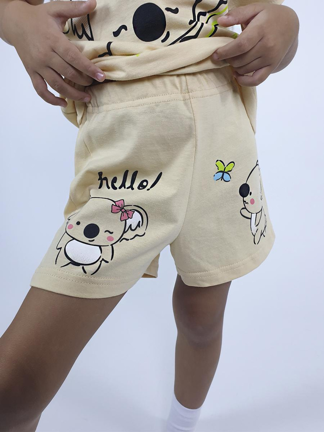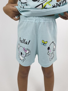 Кулирное полотно:100% х/б. Фуфайка-с цельнокроенным,коротким рукавом.Перед с печатью.Горловина окантована,низ подшит. Шорты-короткие,на резинке с печатью.