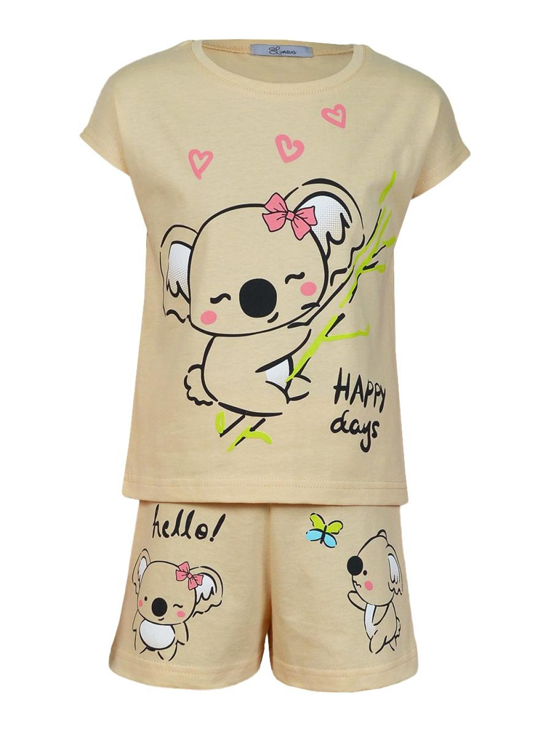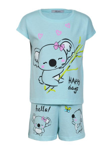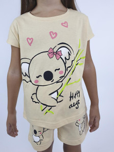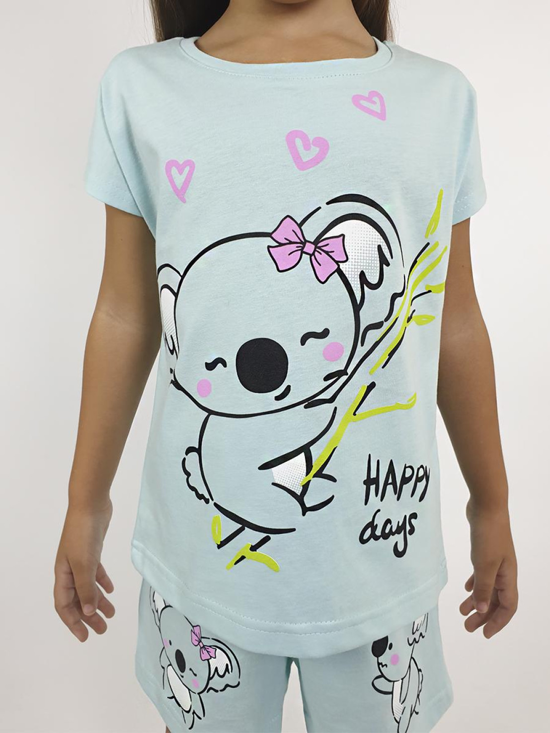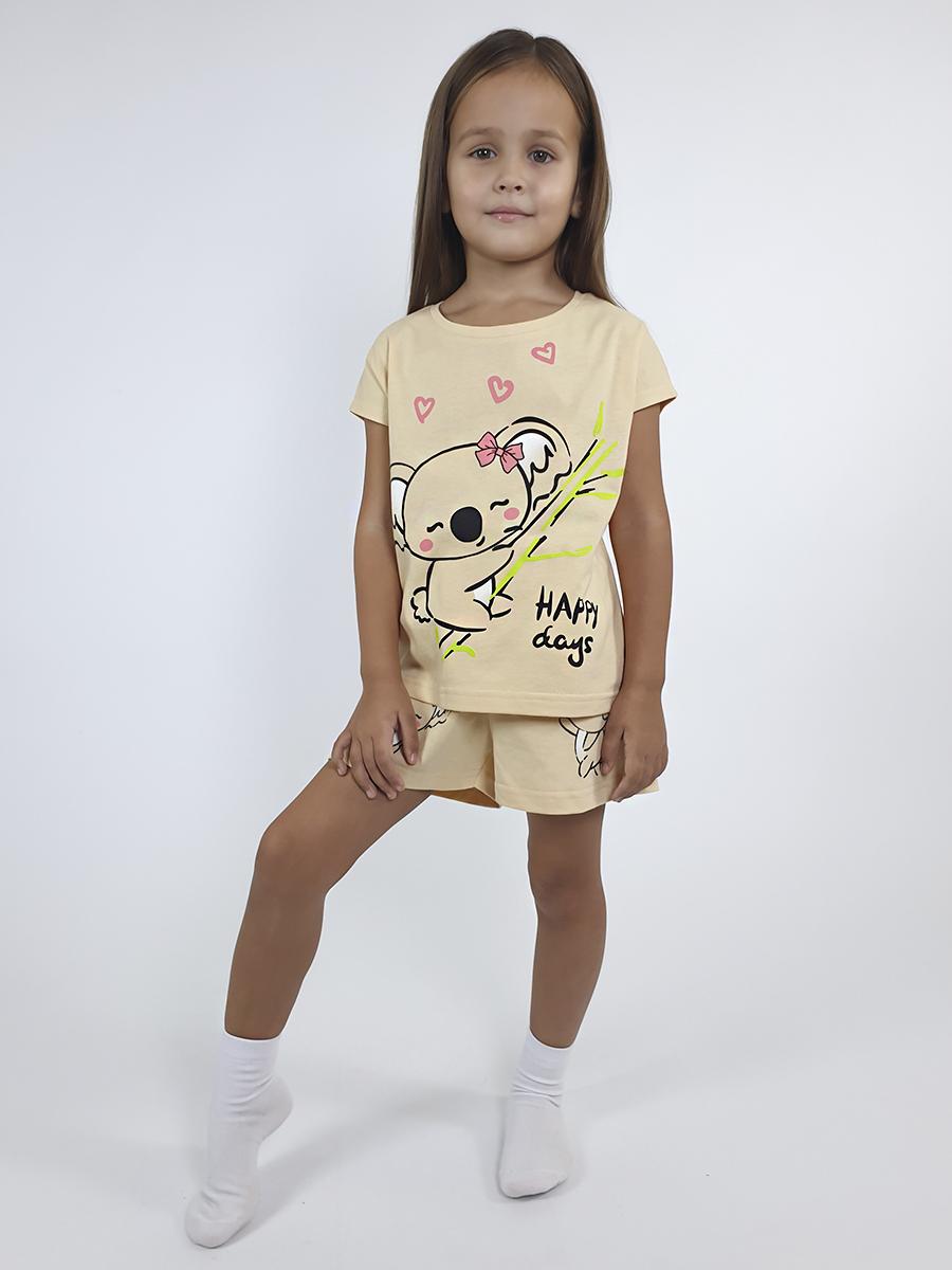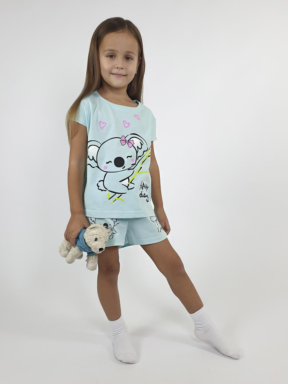 Кулирное полотно:100% х/б. Фуфайка-с цельнокроенным,коротким рукавом.Перед с печатью.Горловина окантована,низ подшит. Шорты-короткие,на резинке с печатью.