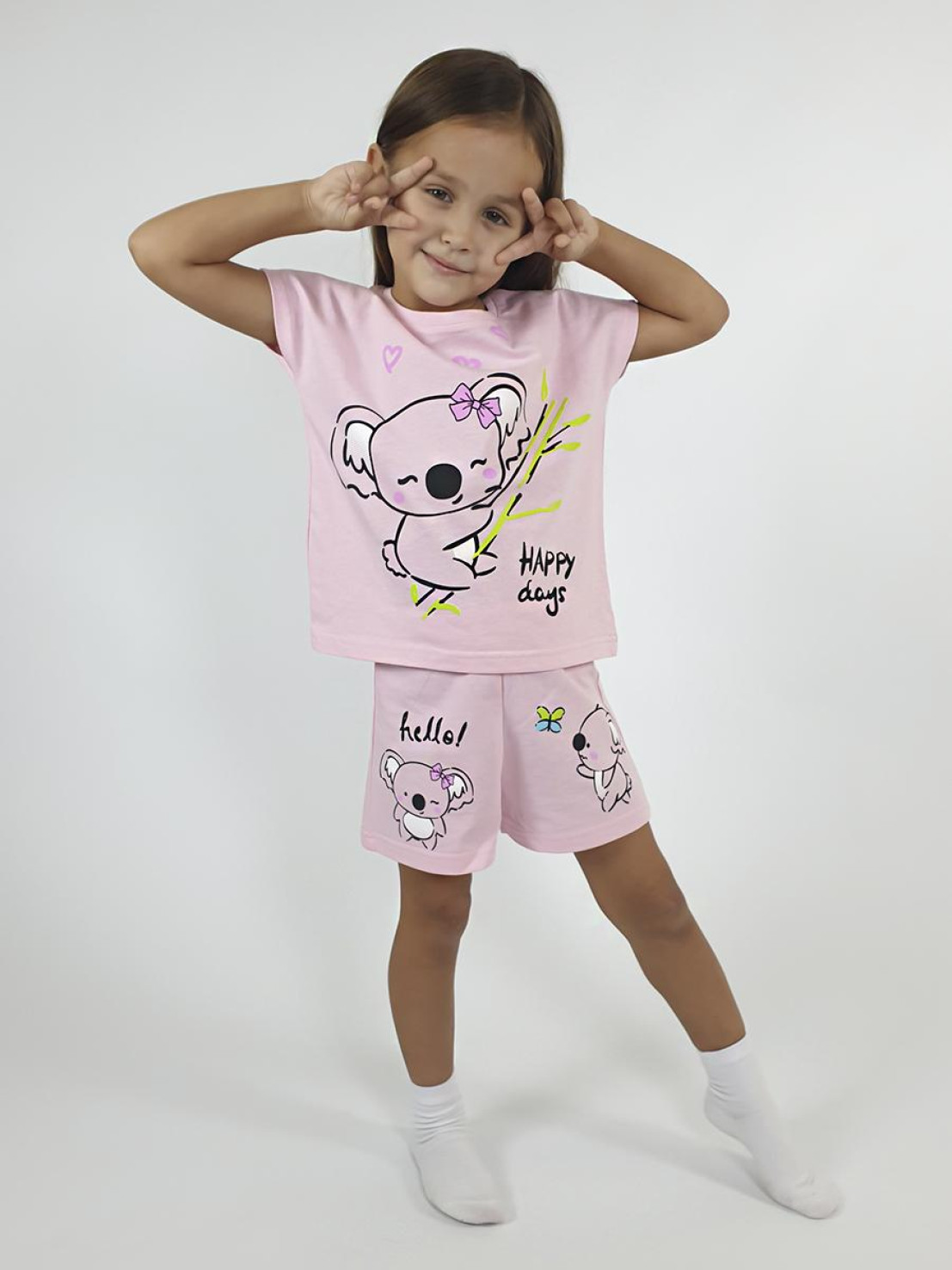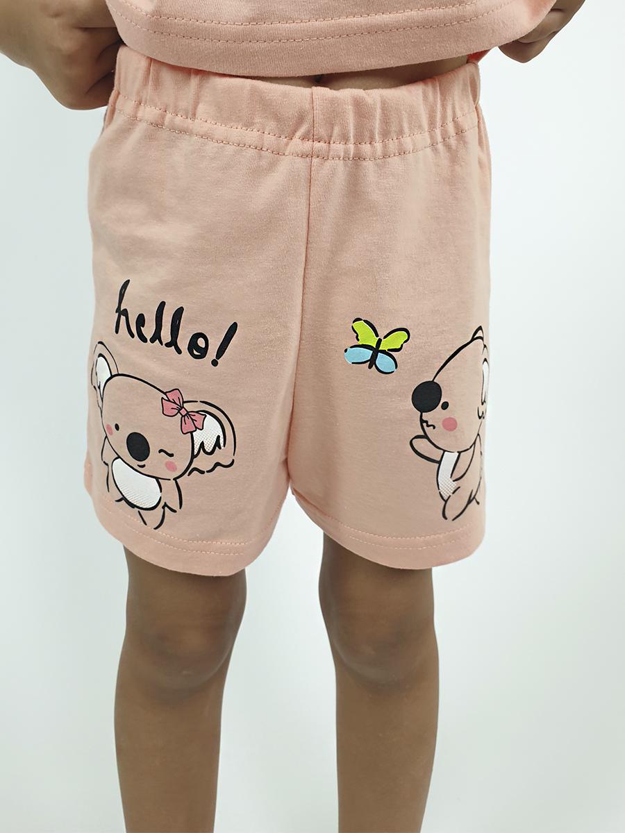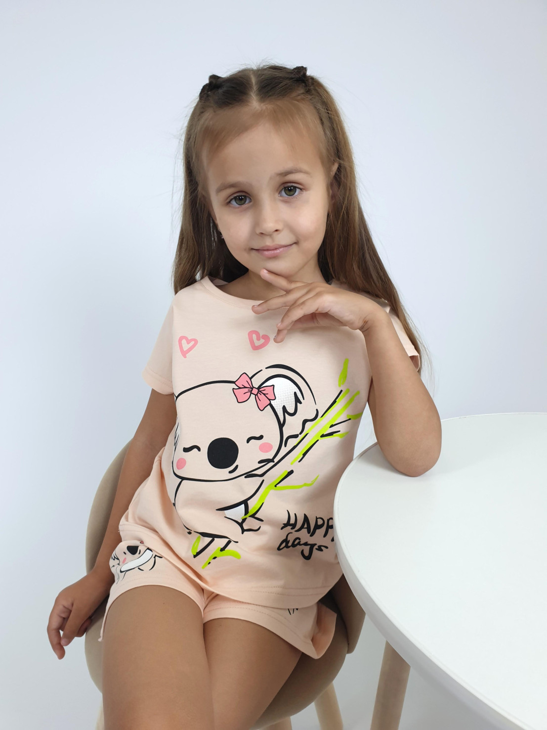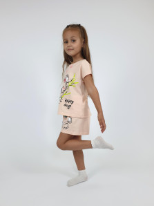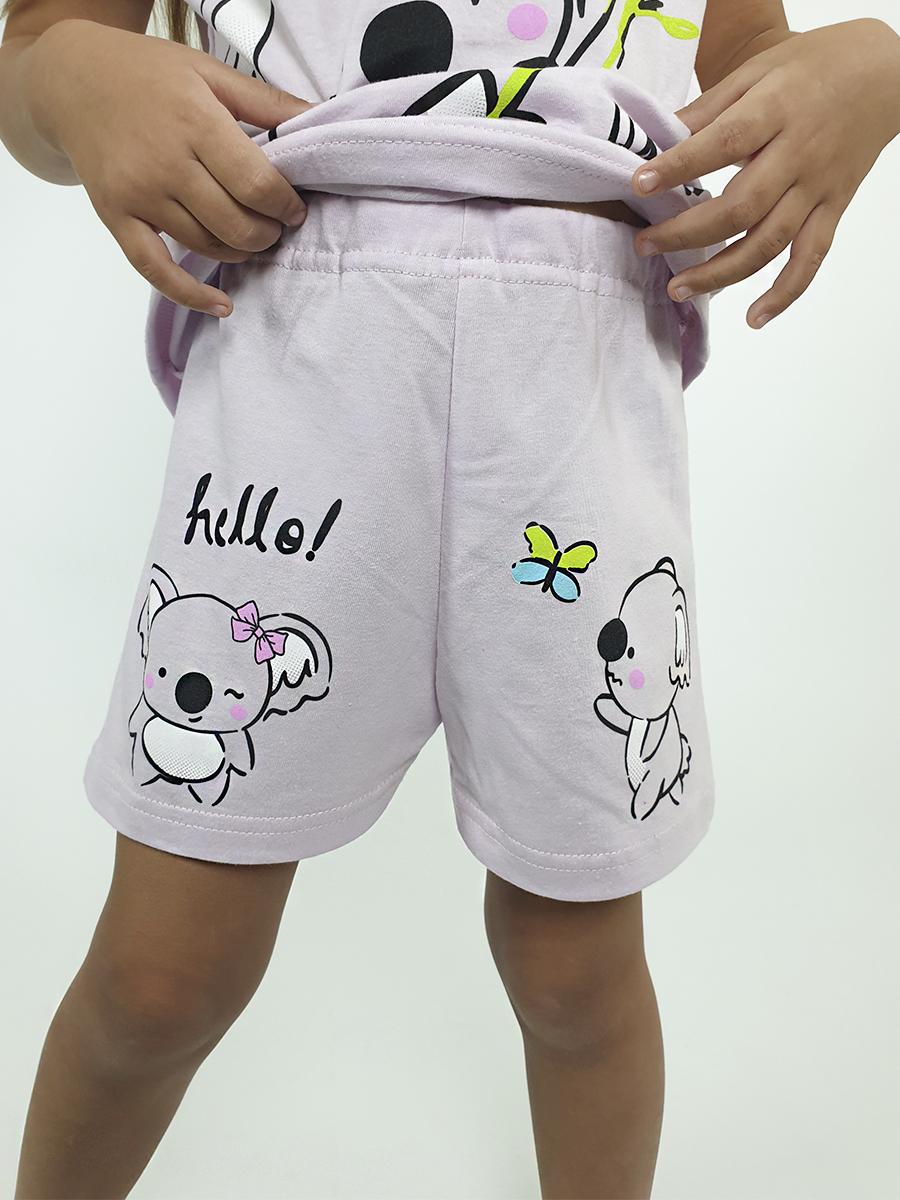Кулирное полотно:100% х/б. Фуфайка-с цельнокроенным,коротким рукавом.Перед с печатью.Горловина окантована,низ подшит. Шорты-короткие,на резинке с печатью.