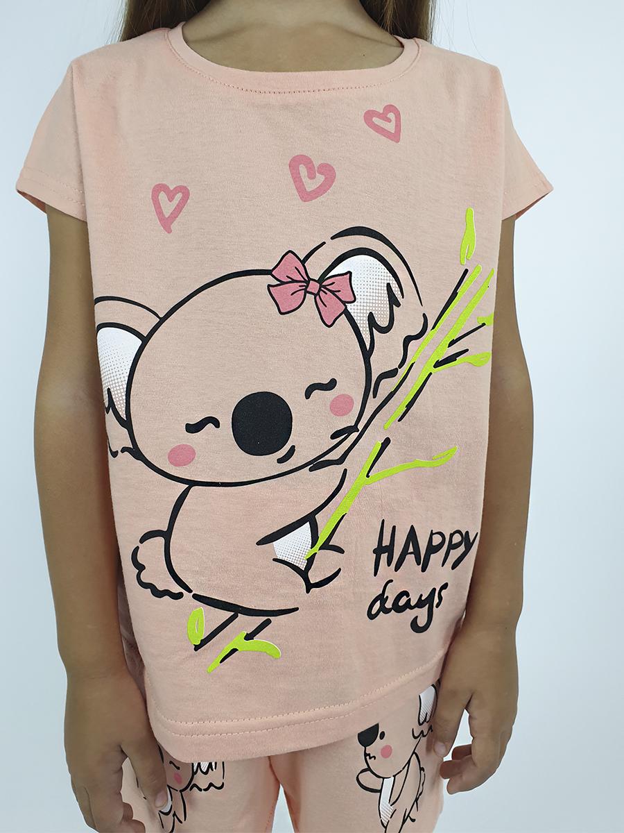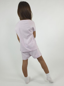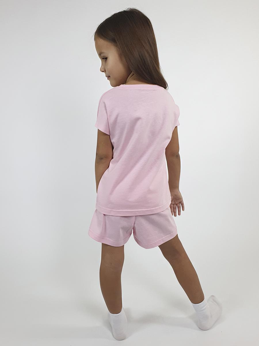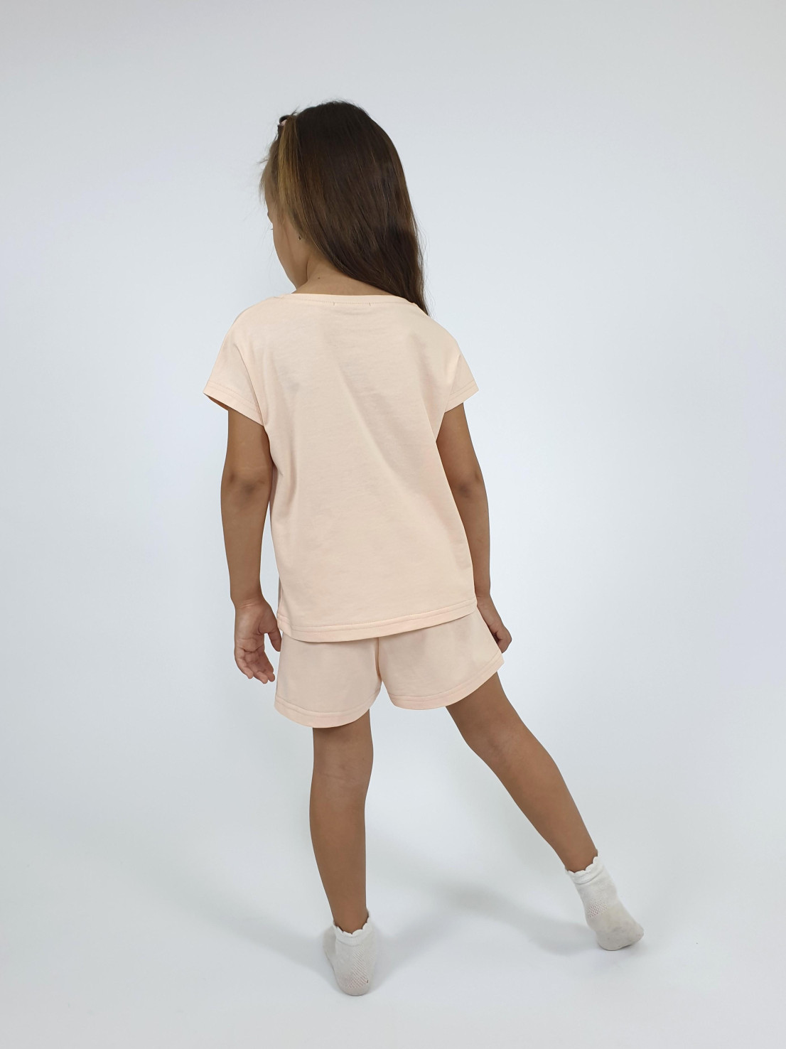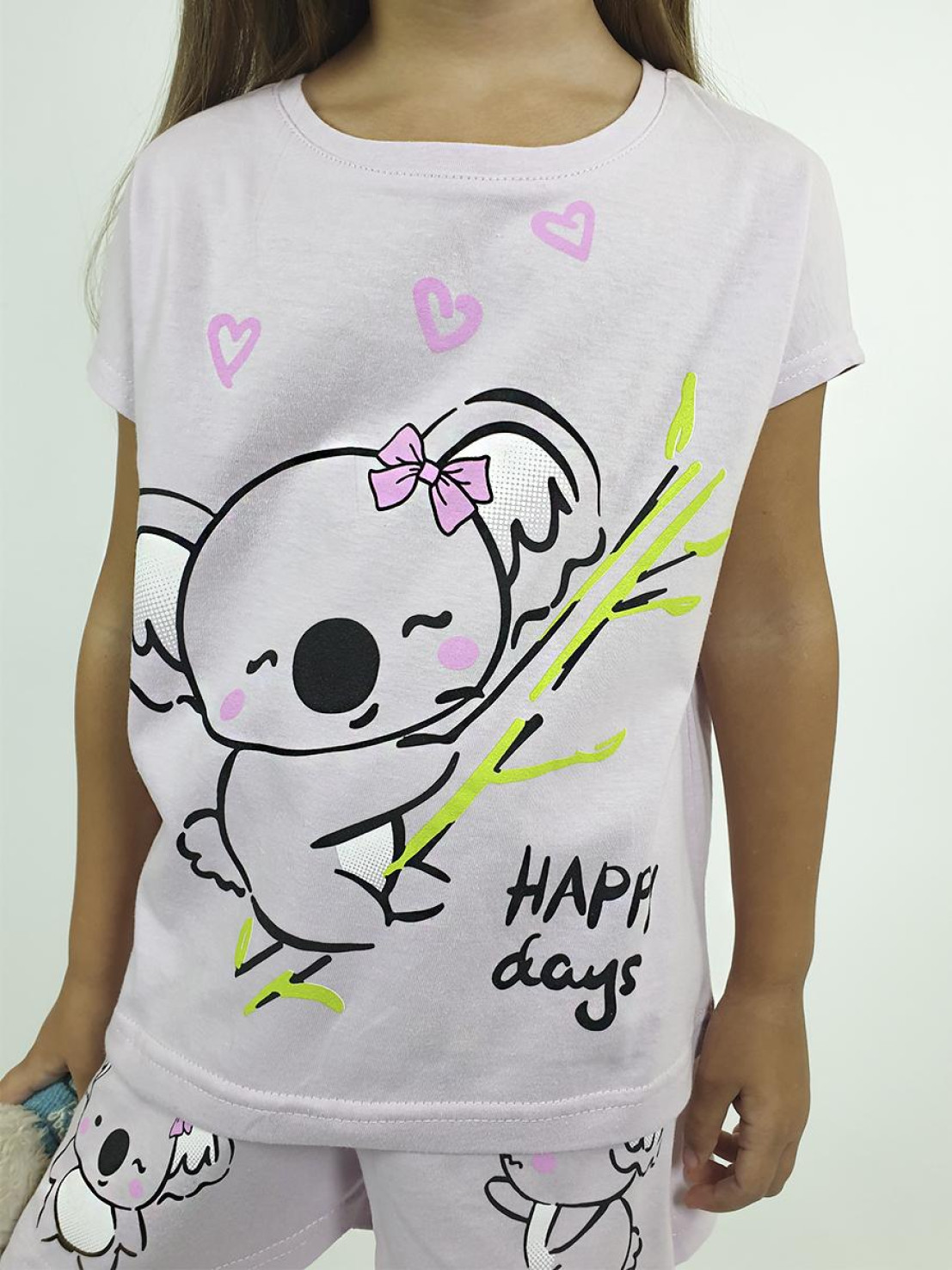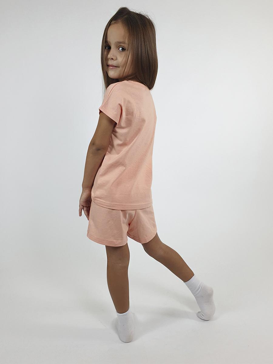 Кулирное полотно:100% х/б. Фуфайка-с цельнокроенным,коротким рукавом.Перед с печатью.Горловина окантована,низ подшит. Шорты-короткие,на резинке с печатью.