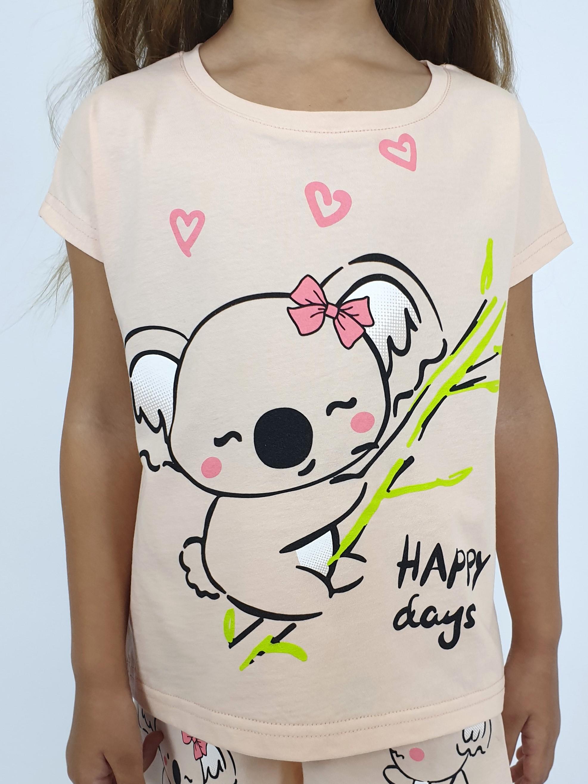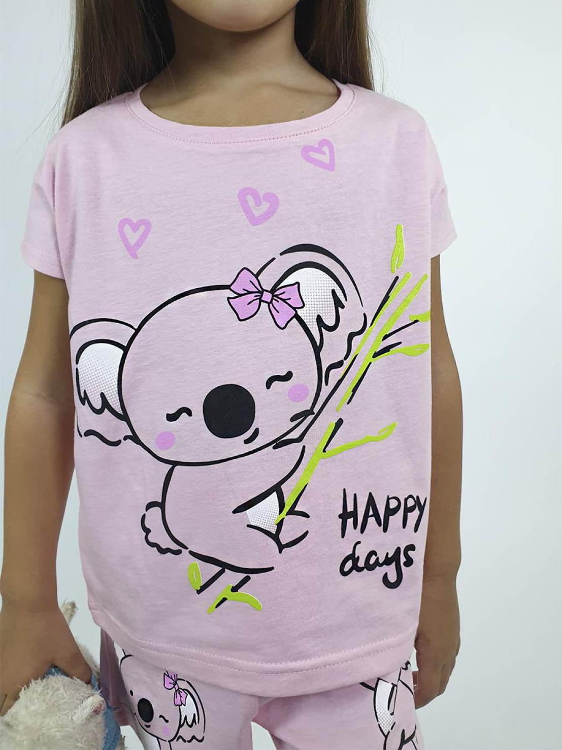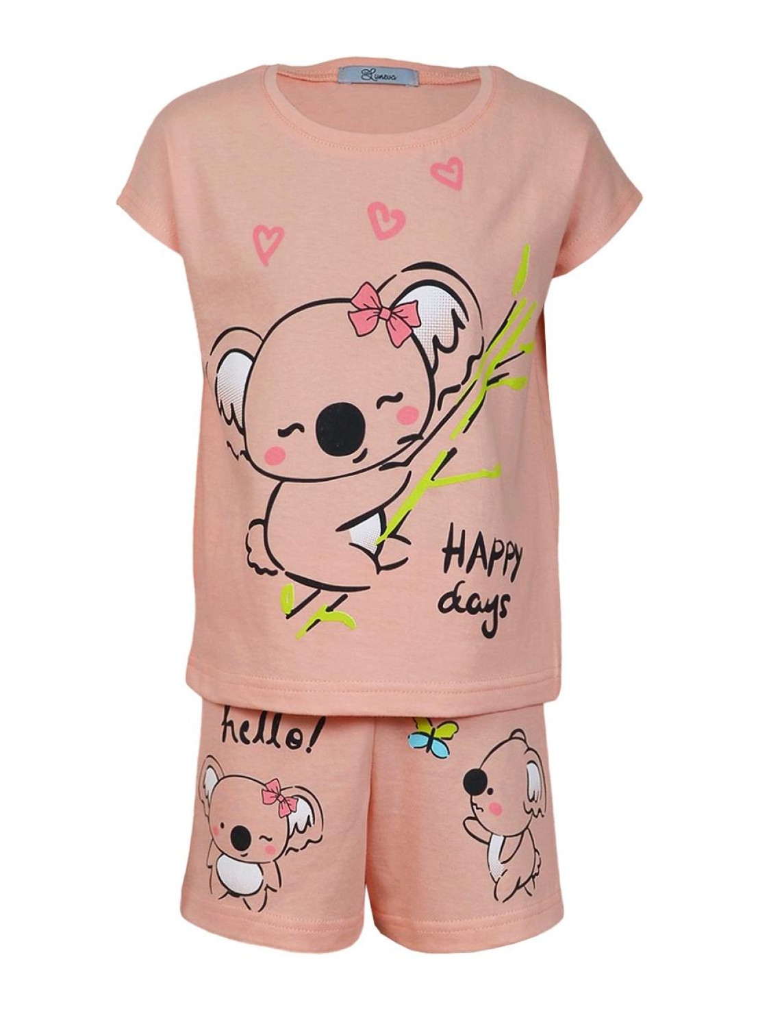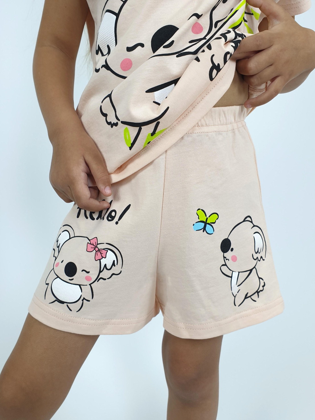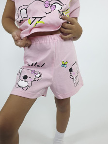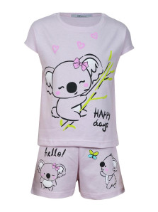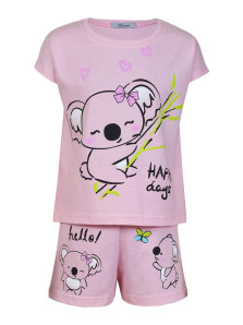 Кулирное полотно:100% х/б. Фуфайка-с цельнокроенным,коротким рукавом.Перед с печатью.Горловина окантована,низ подшит. Шорты-короткие,на резинке с печатью.