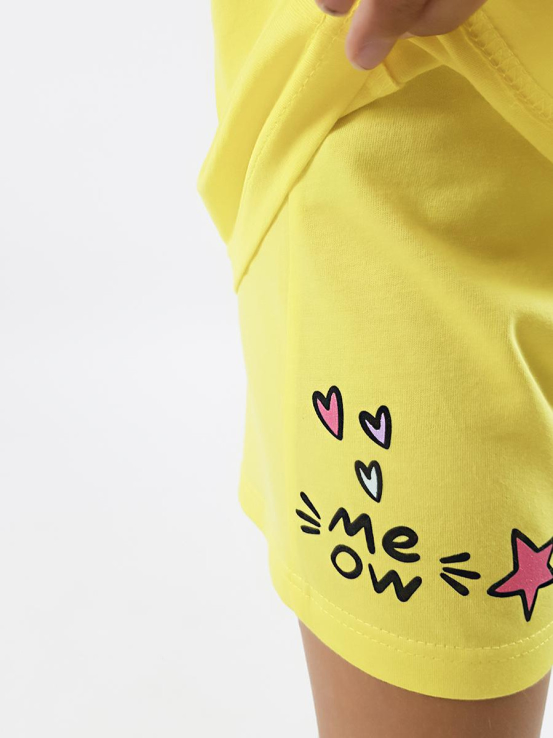 Кулирное полотно:100% х/б. Фуфайка-с цельнокроенным,коротким рукавом.Перед с печатью.Горловина окантована,низ подшит. Шорты-короткие,на резинке.