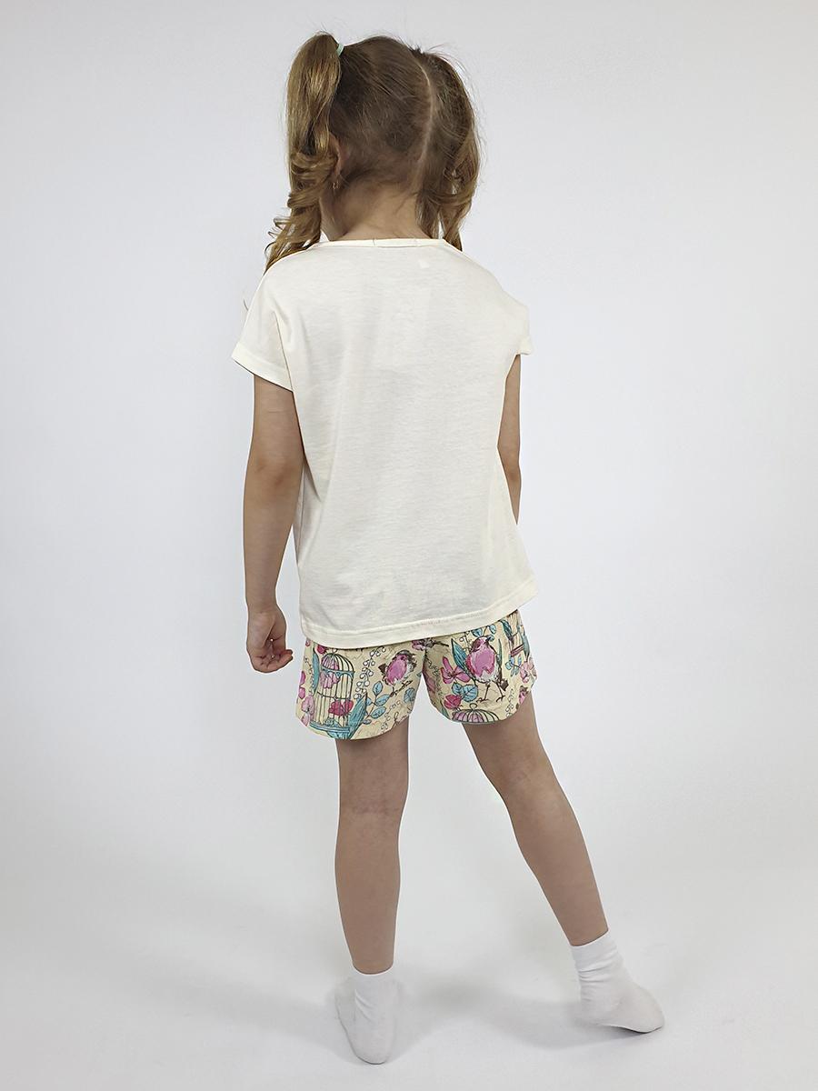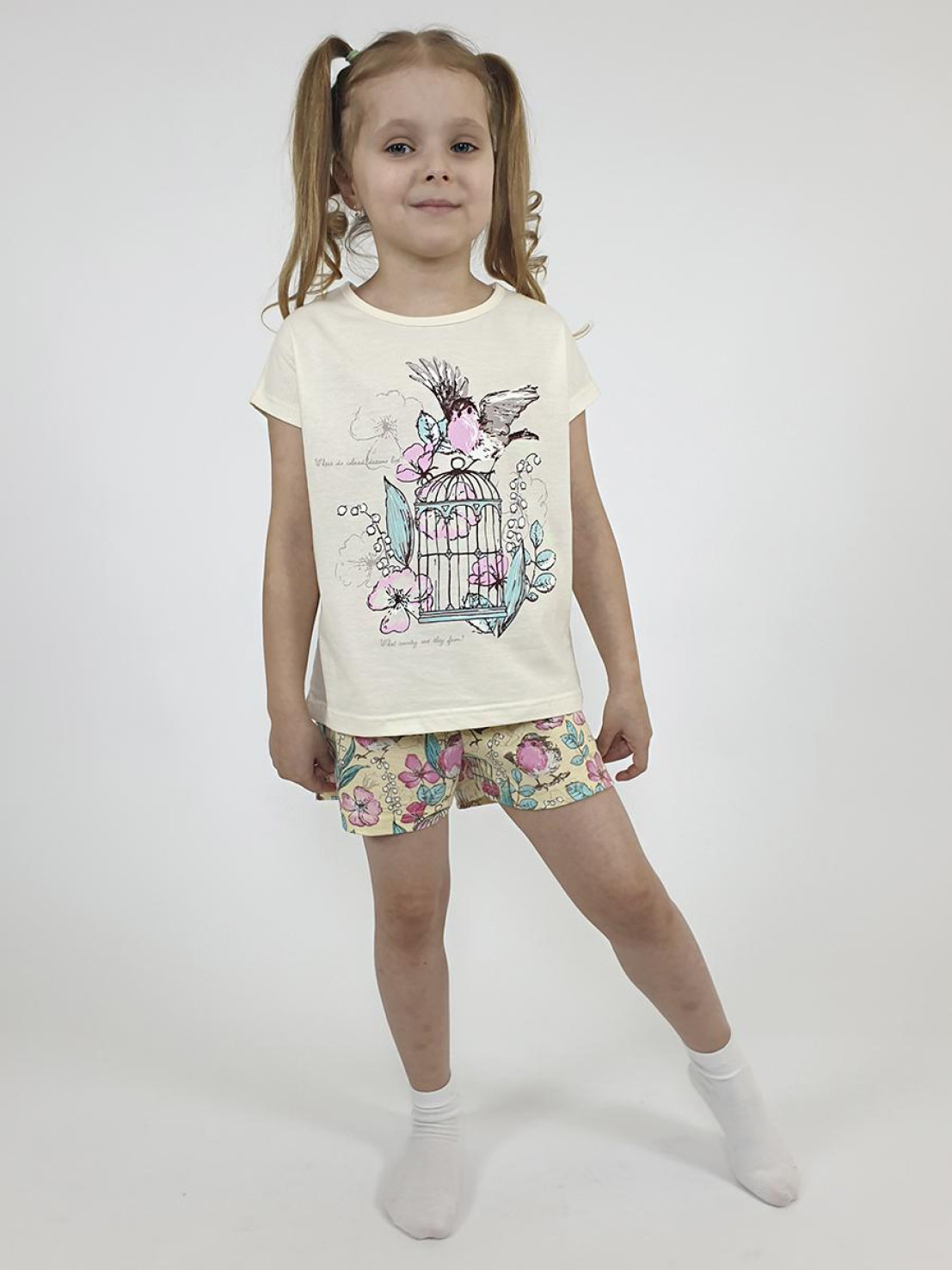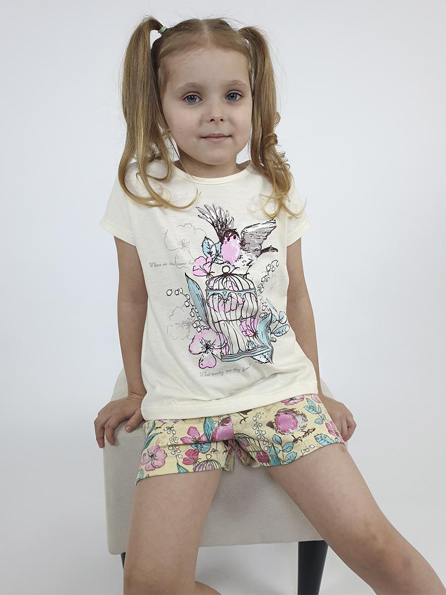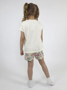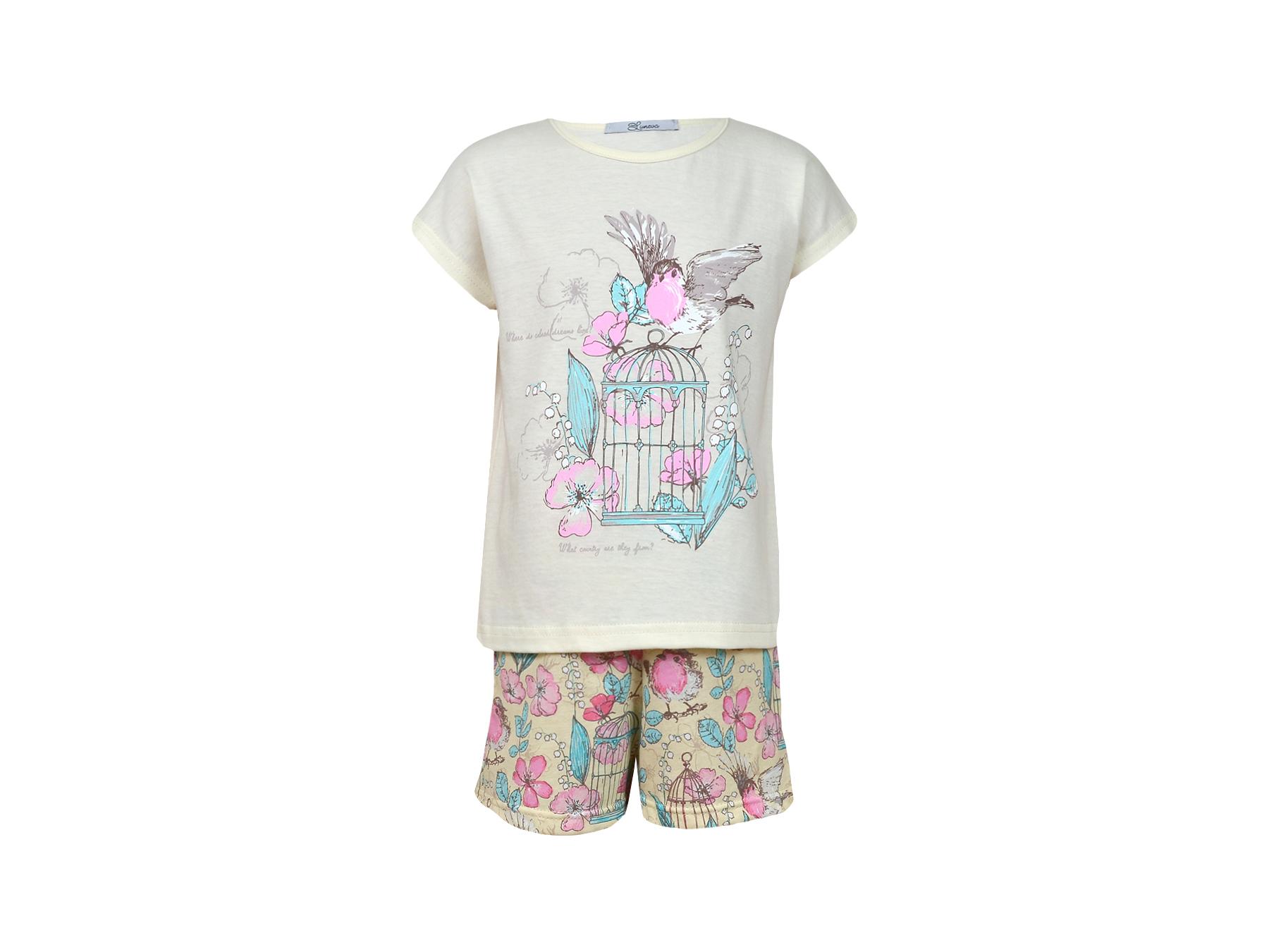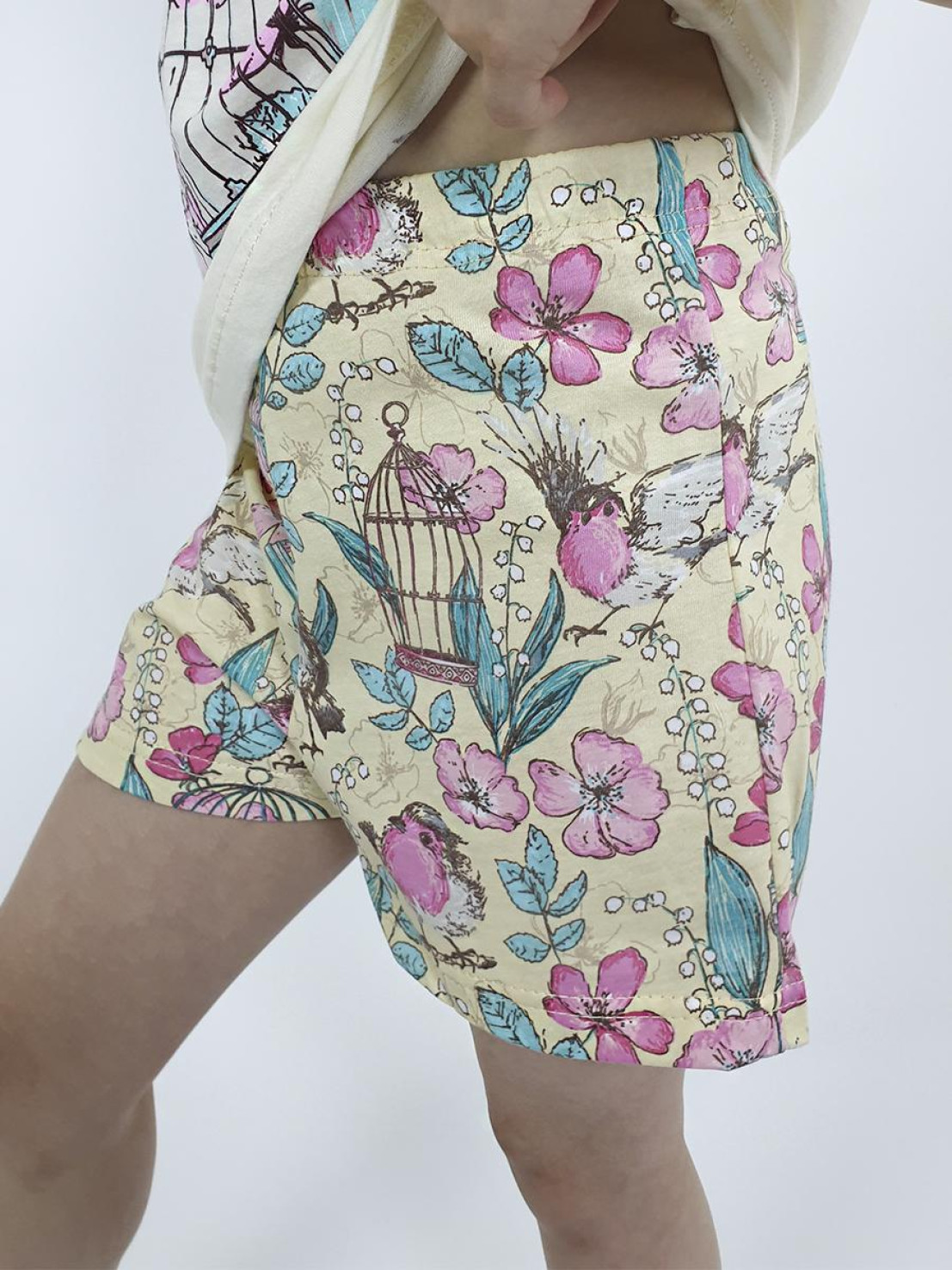 Пижама.Кулирное полотно:100% х/б. Фуфайка-с цельнокроеным,коротким рукавом.Перед с печатью.Горловина окантована,низ подшит. Шорты-короткие,на резинке.